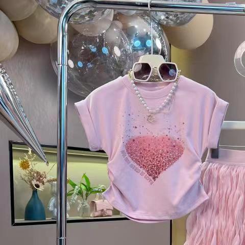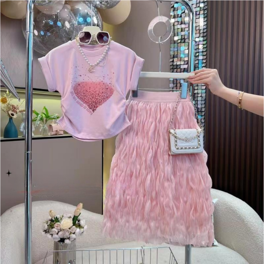 2024 여름 새로운 여자 치마 사랑 핫 드릴링 짧은 소매 상단 긴 치마 세트 티셔츠 스커트 투피스 패션
