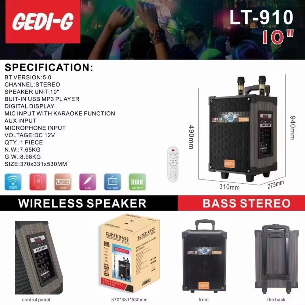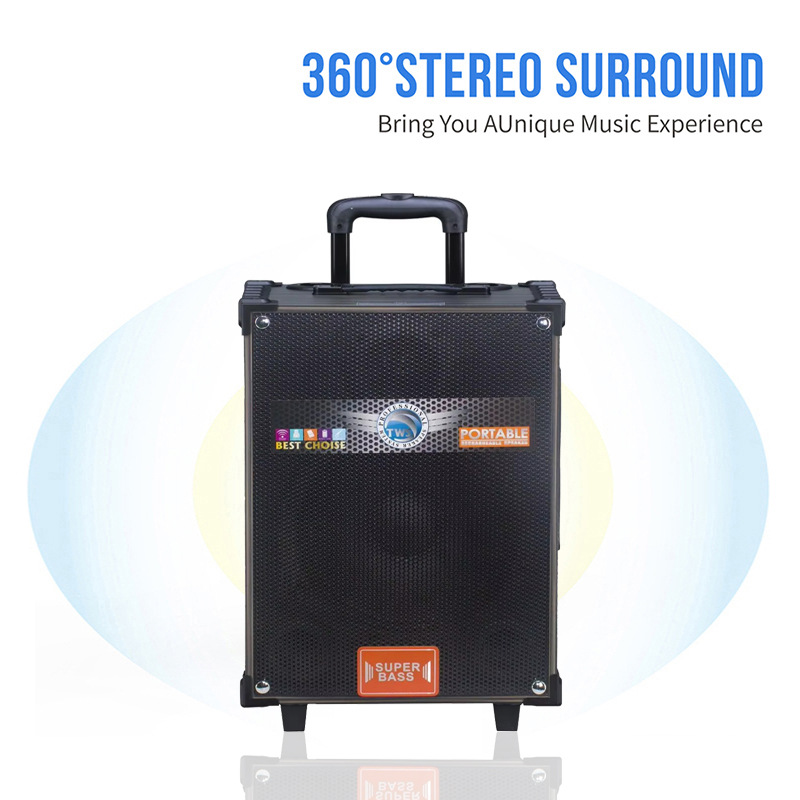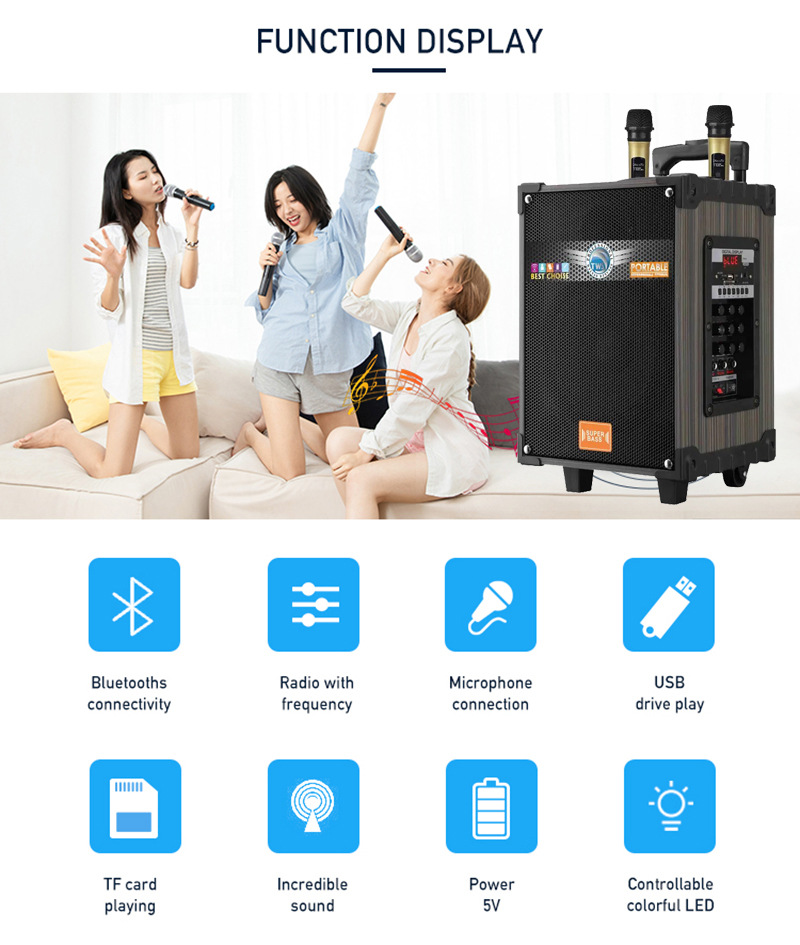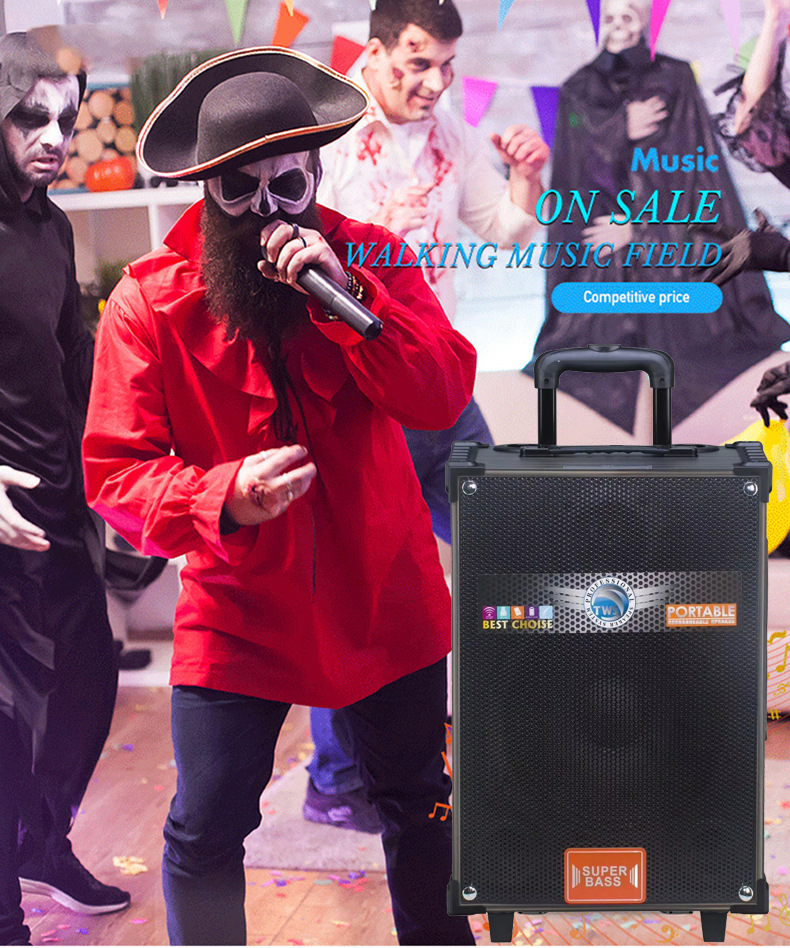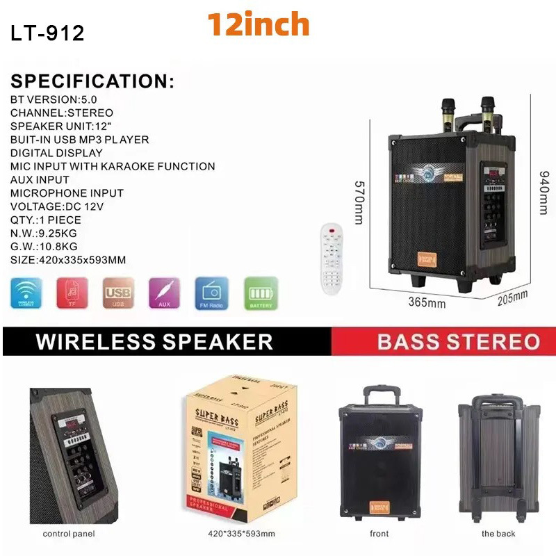 Function: USB,TF,BT,TWS,FM,AUX,MIC,TREBLE,ECHO,BASS,EQ, Remote control, wireless microphone