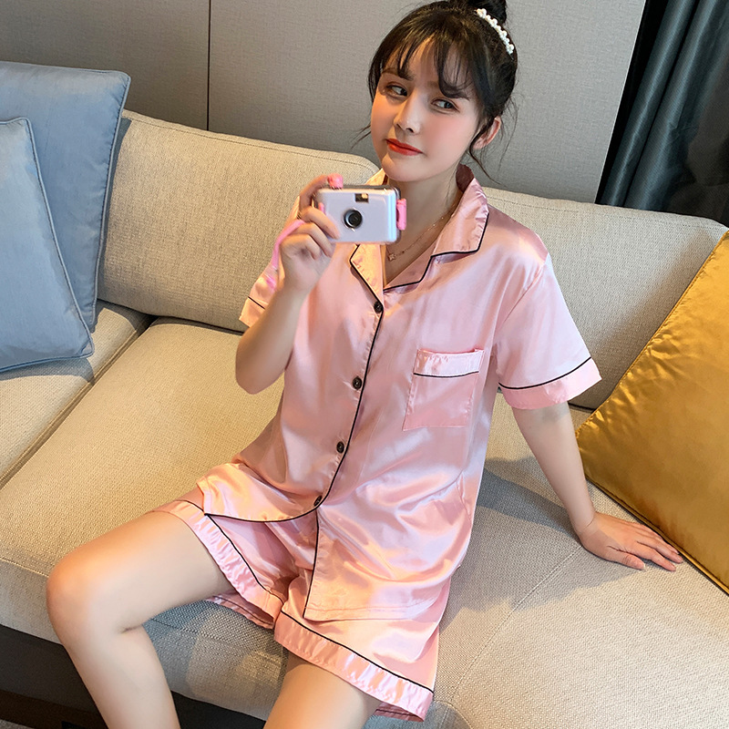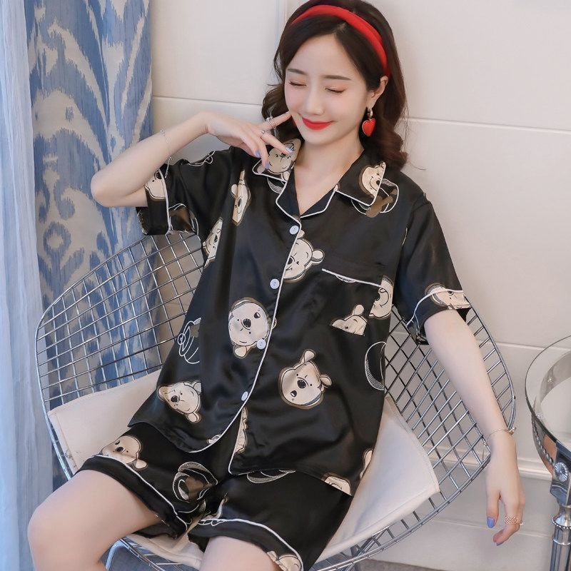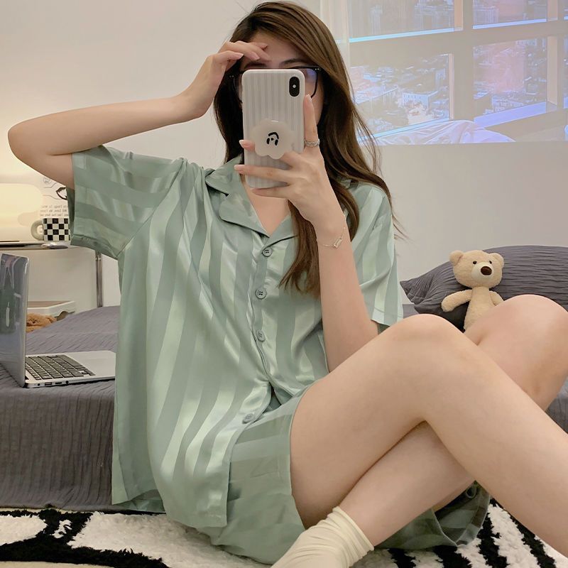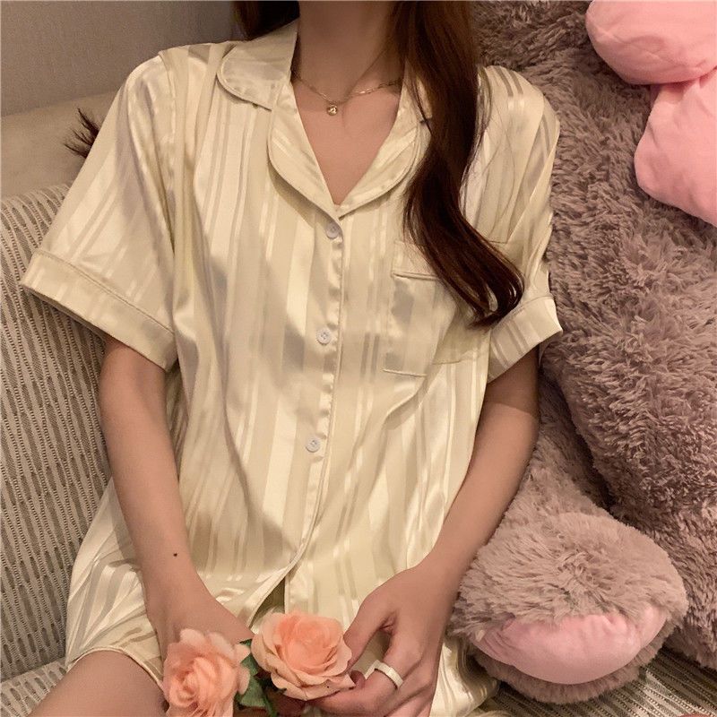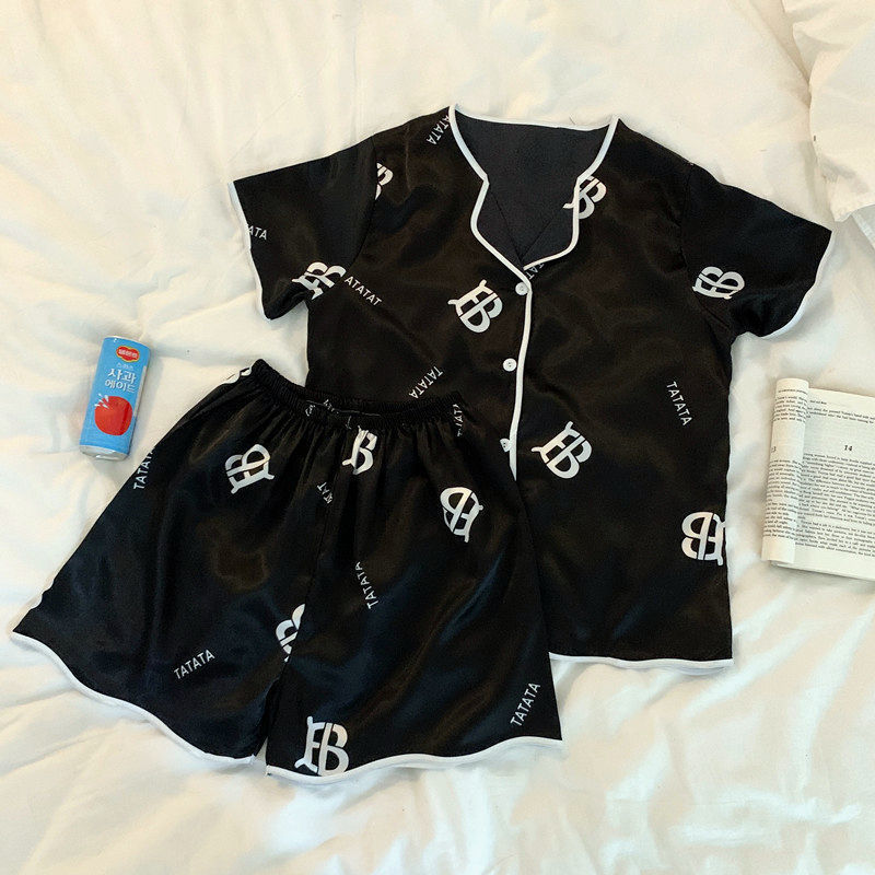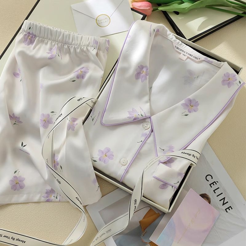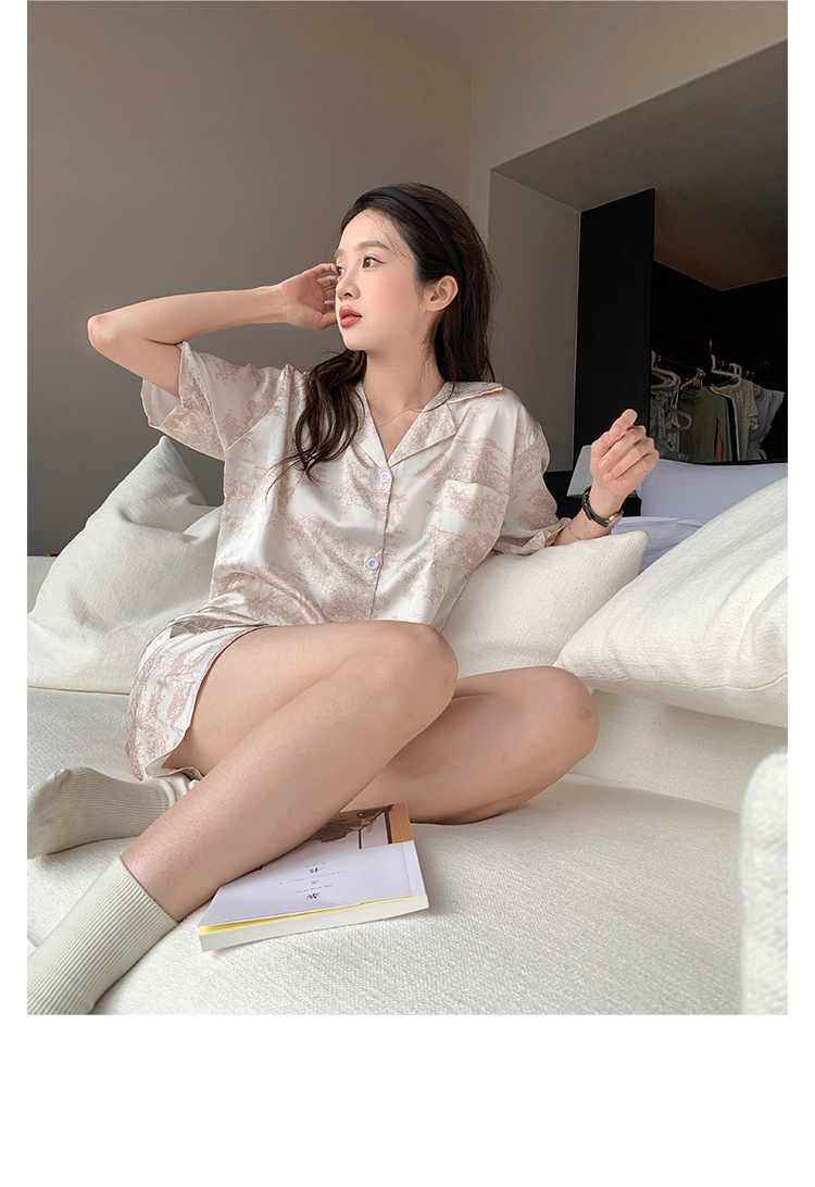 프랑스 잠옷 여성의 여름 2024 새로운 소녀 인쇄 반팔 하이 엔드 아이스 실크 반바지 홈 의류 세트스토어 가기