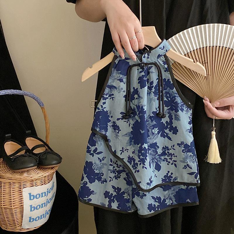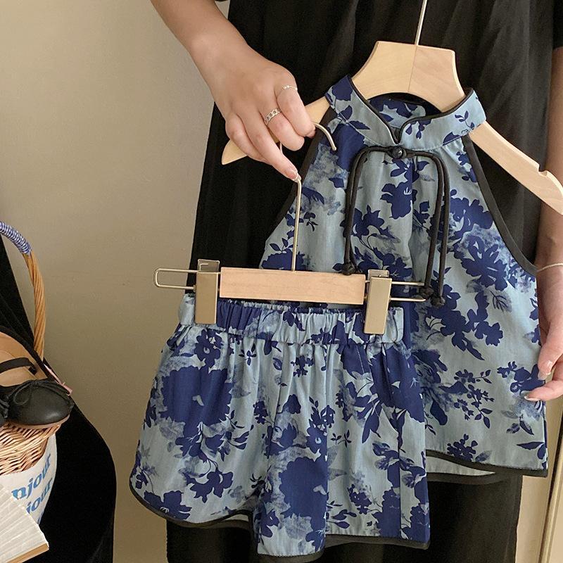 중국 스타일 아동복 2024 여름 새로운 소녀 디자인 감각 매달려 목 꽃 cheongsam 조끼 최고 반바지 세트스토어 가기
