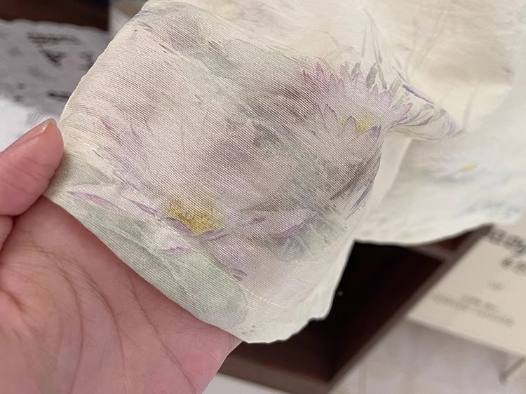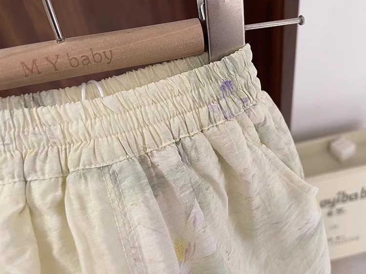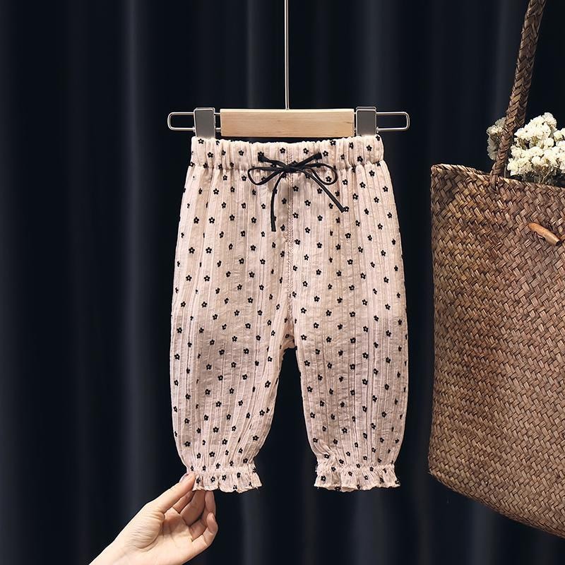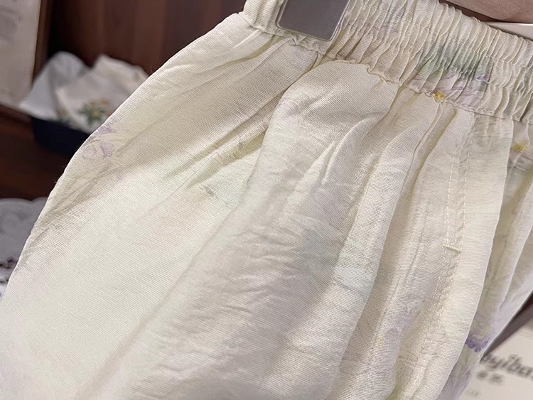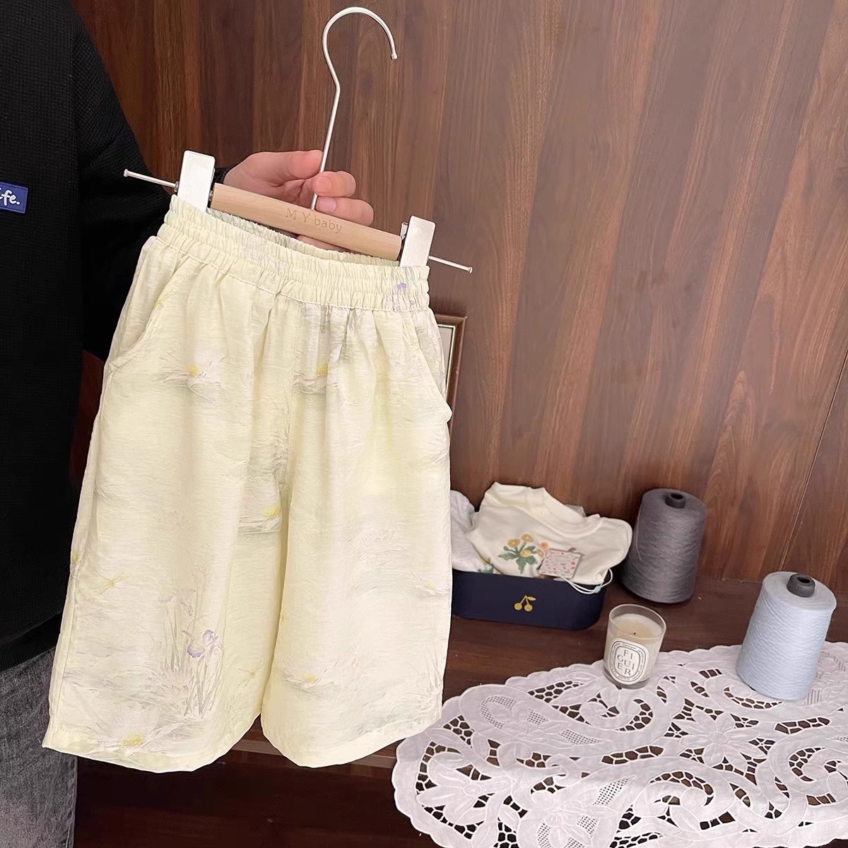 아기 소녀의 얇은 실크면 스트레이트 캐주얼 바지 소녀 여름 새로운 도착 여성 수채화 우아한 국가 스타일 넓은 다리 바지스토어 가기