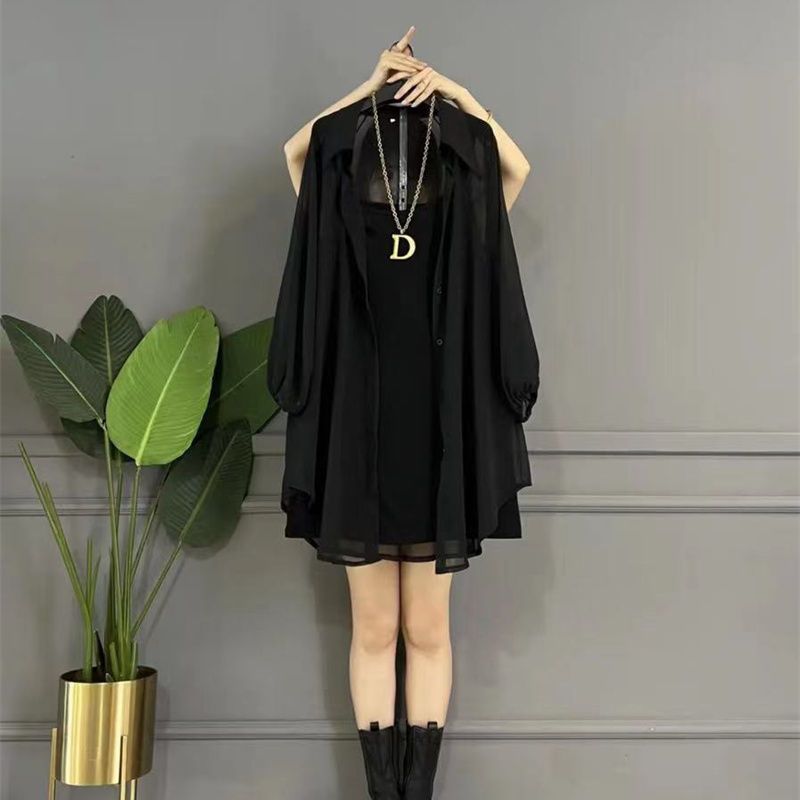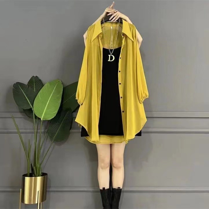 플러스 사이즈 여성의 여름 뉴 에이지 감소 카디건 패션 태양 보호 의류 플라잉 슬리브 슬링 원피스 투피스 세트