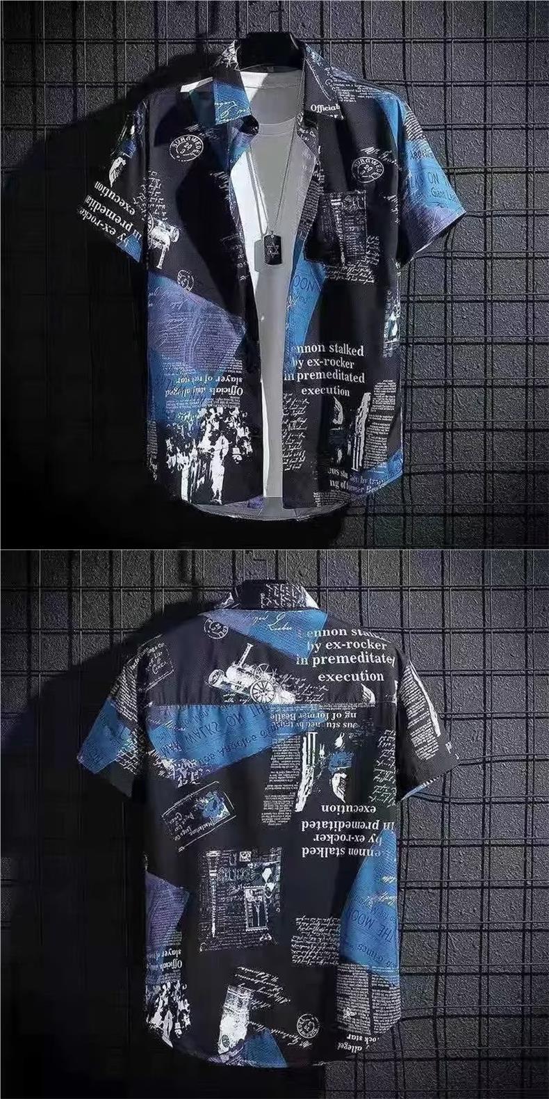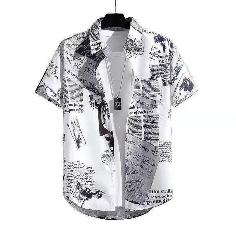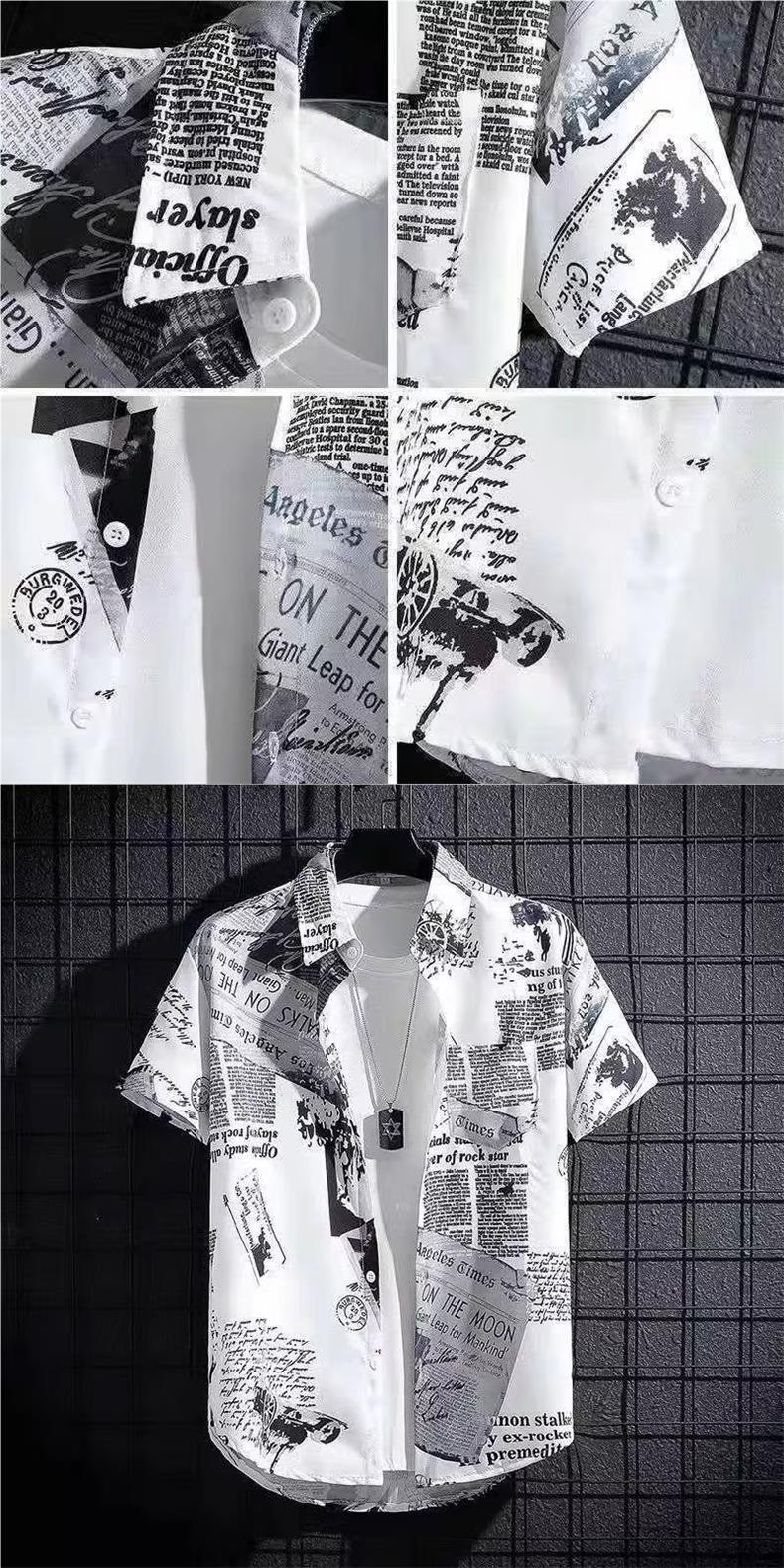厂家夏季报纸插画短袖花衬衫男女潮流复古宽松古巴领衬衣批发스토어 가기