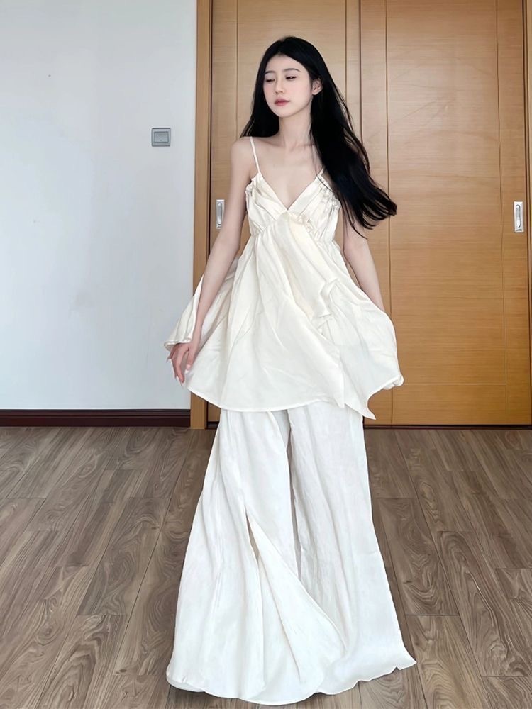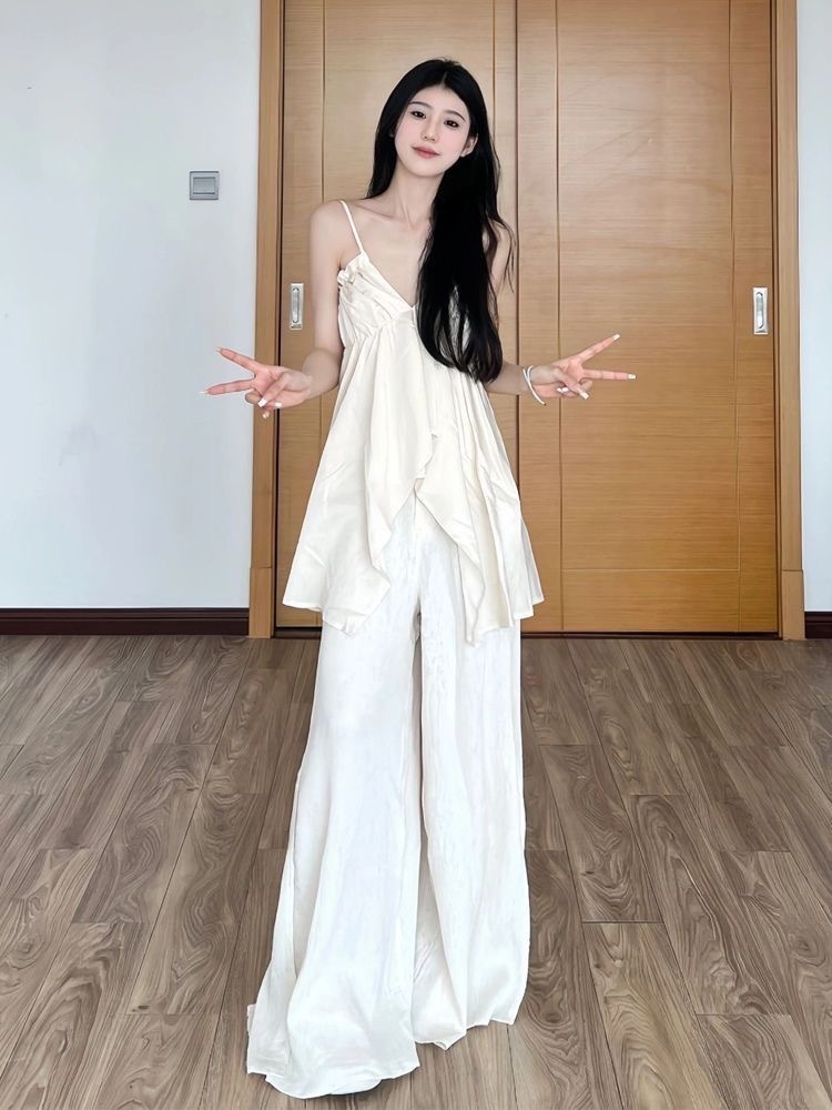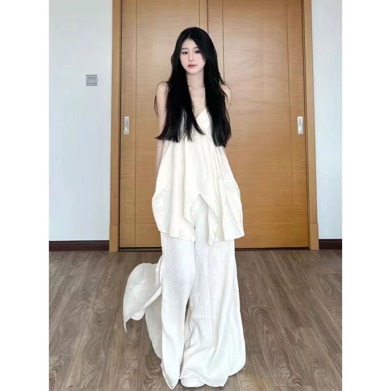 프랑스 스타일 세트 우아한 사교계 불규칙한 순수한 욕망 슬링 캐주얼 와이드 레그 여름 새로운 투피스 유행 세트스토어 가기