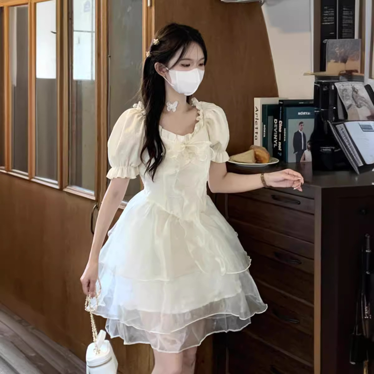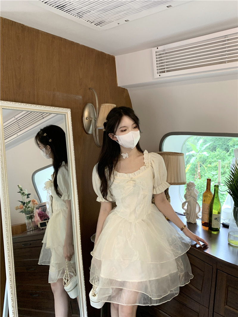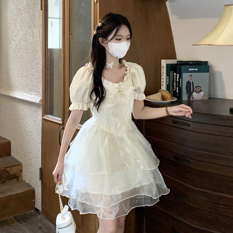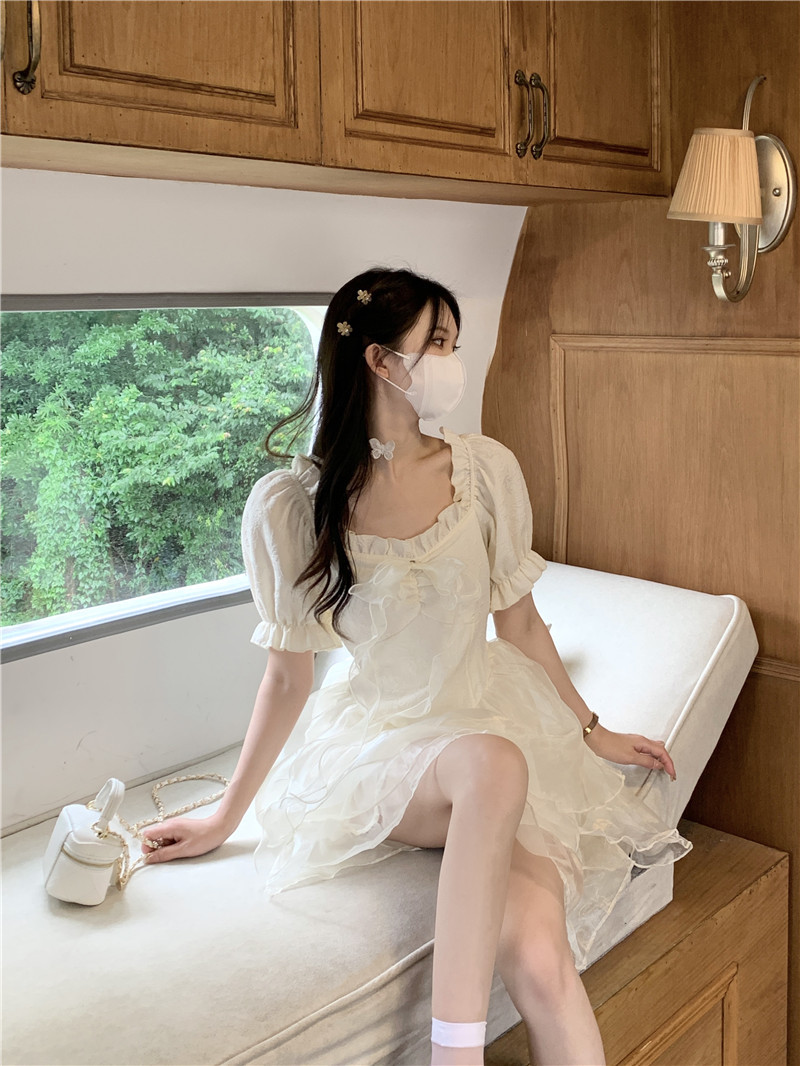 디자인 센스 요정 우드 이어 사이드 스퀘어 칼라 원피스 여성 여름 새로운 공주 스타일 첫사랑 슬림 핏 퍼프 케이크 원피스