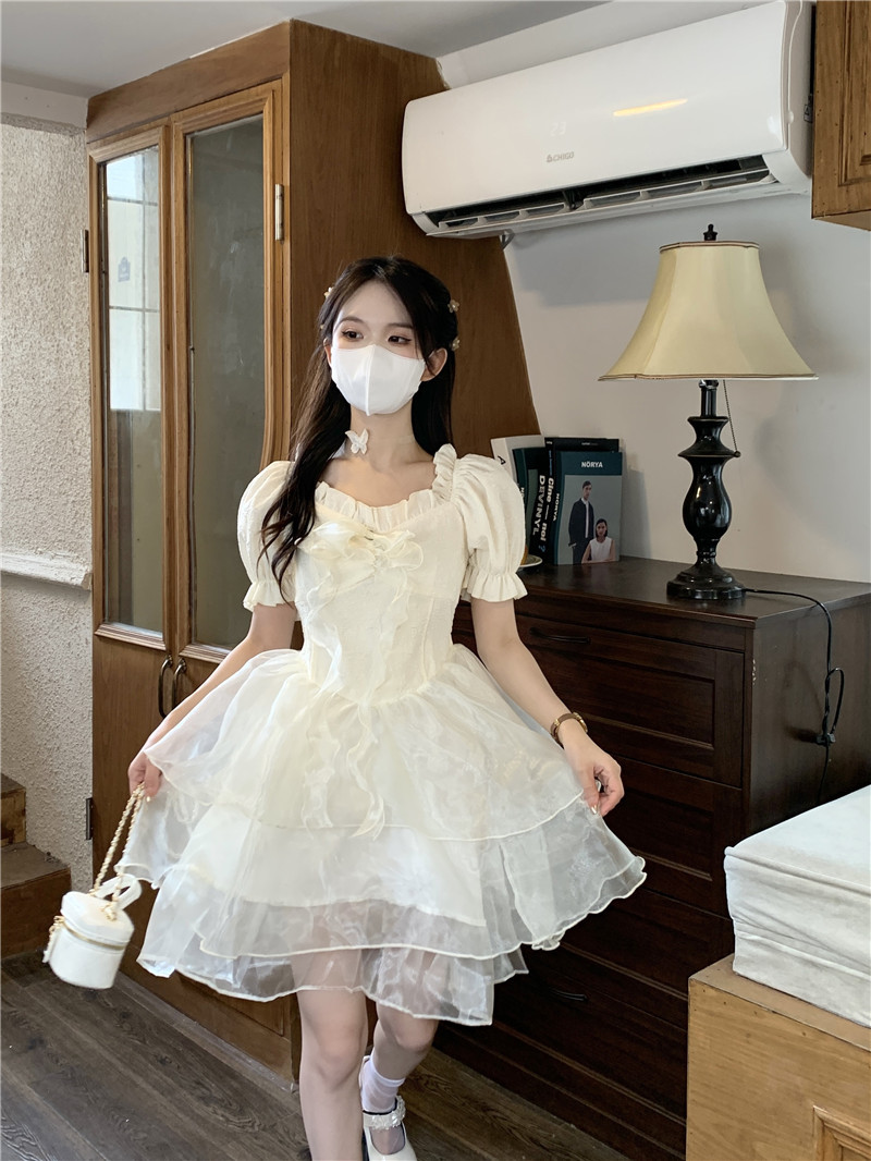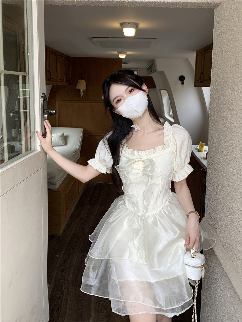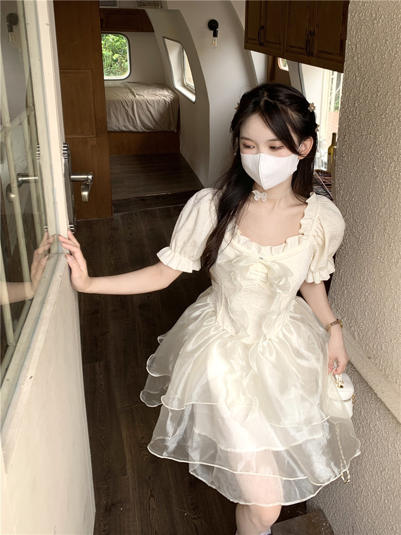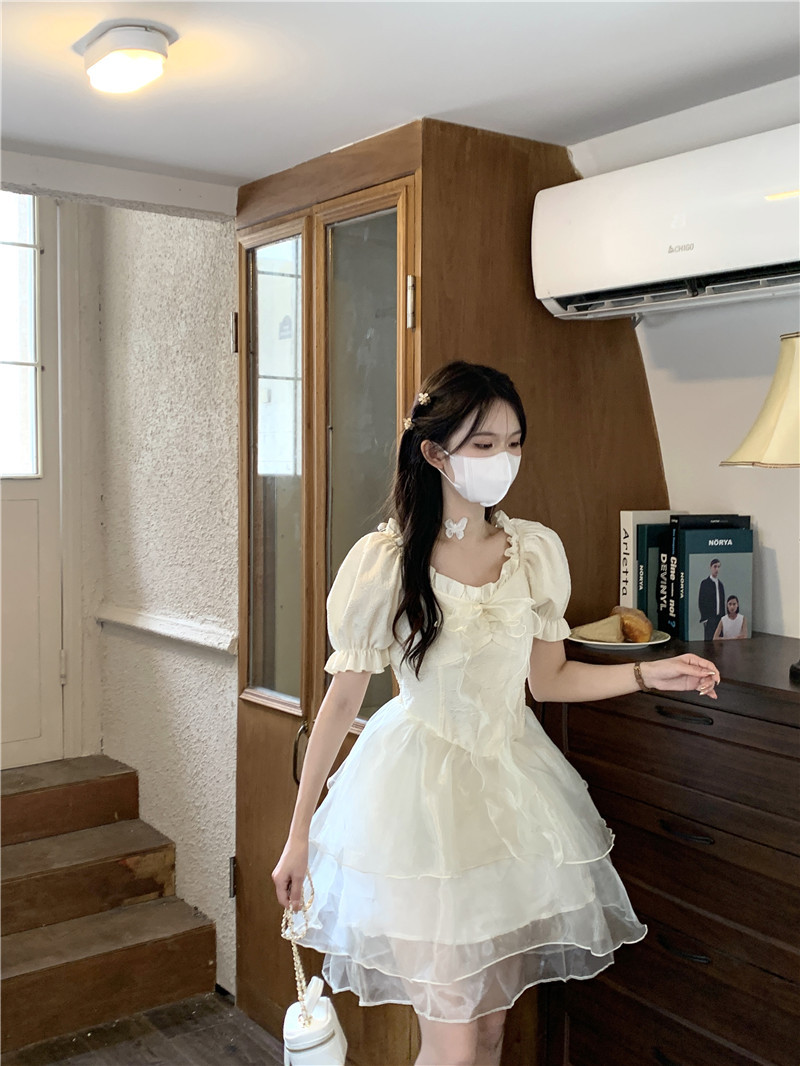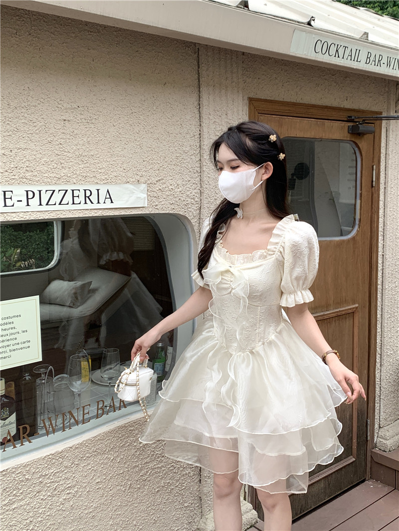 디자인 센스 요정 우드 이어 사이드 스퀘어 칼라 원피스 여성 여름 새로운 공주 스타일 첫사랑 슬림 핏 퍼프 케이크 원피스