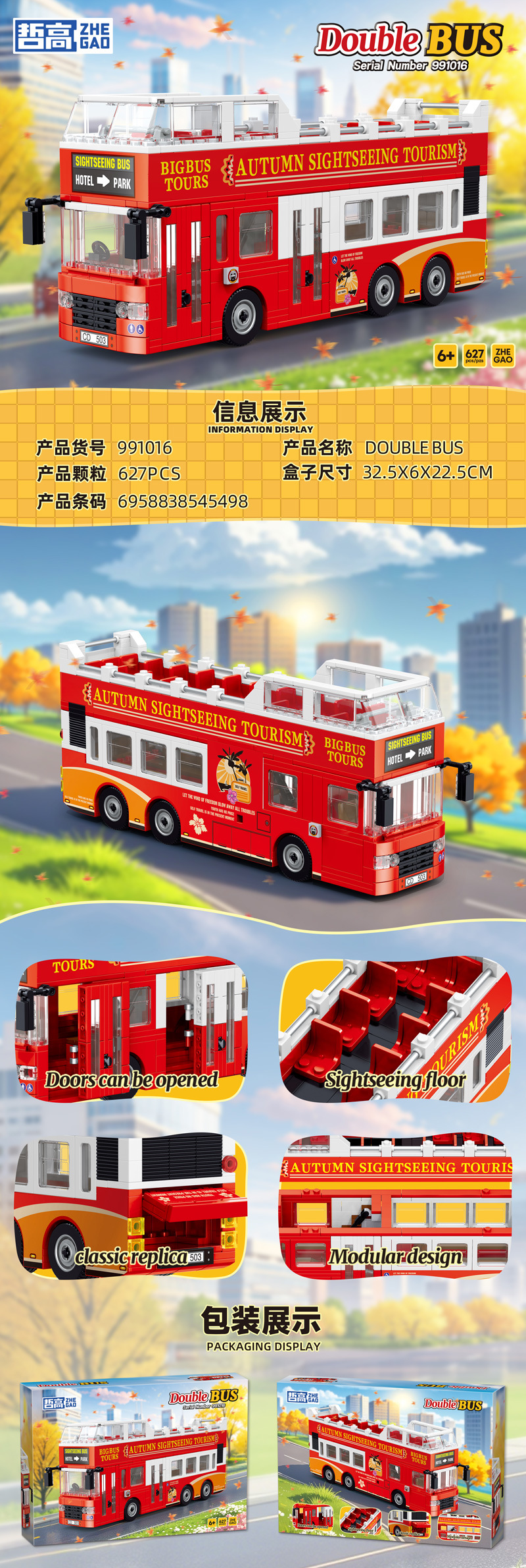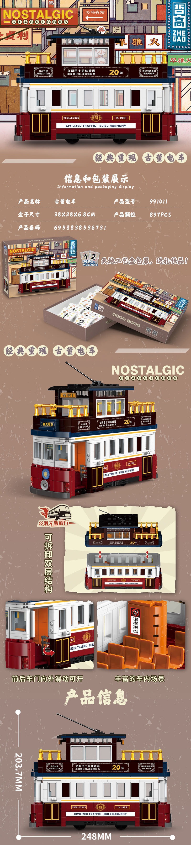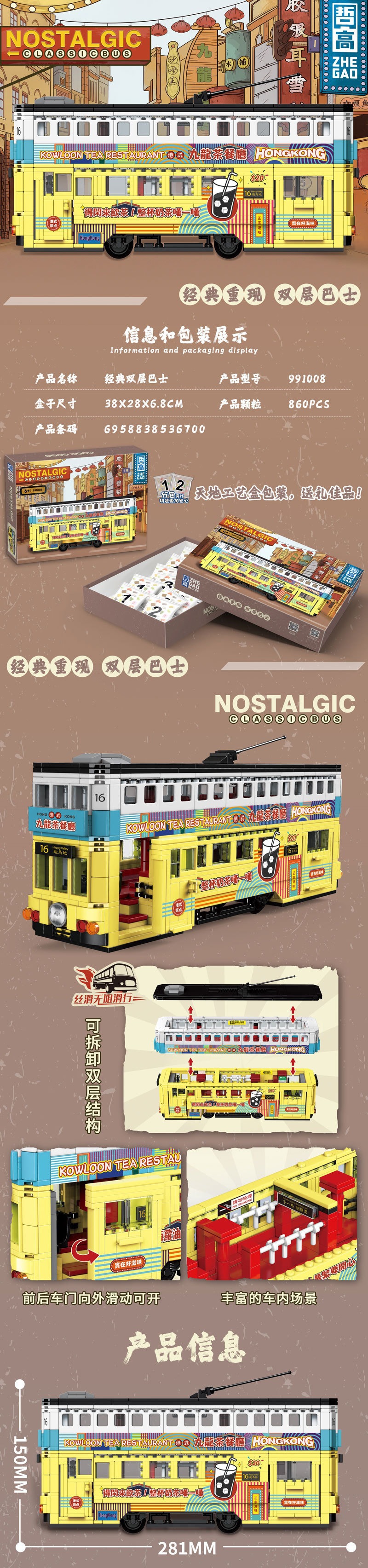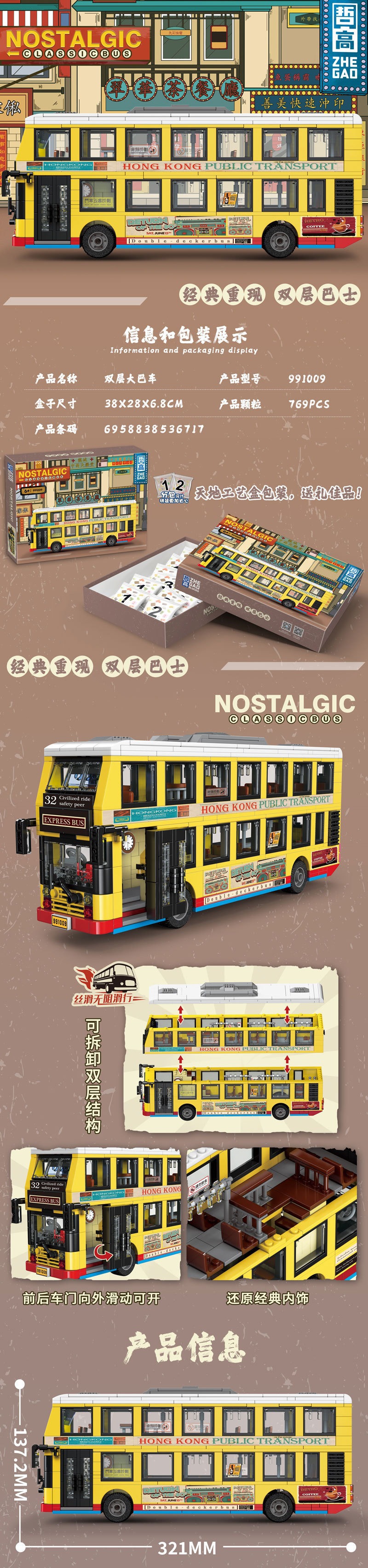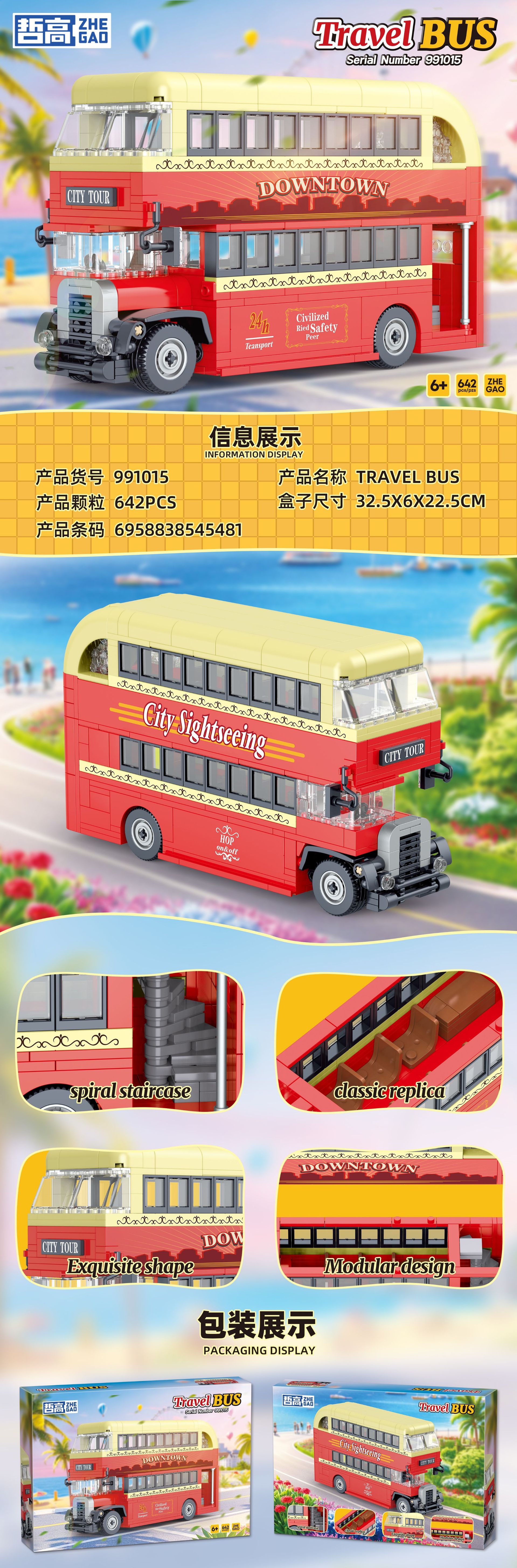 제고 블록 991008-16 클래식 이층버스 레트로 모델 트렌디한 교육용 조립 장난감