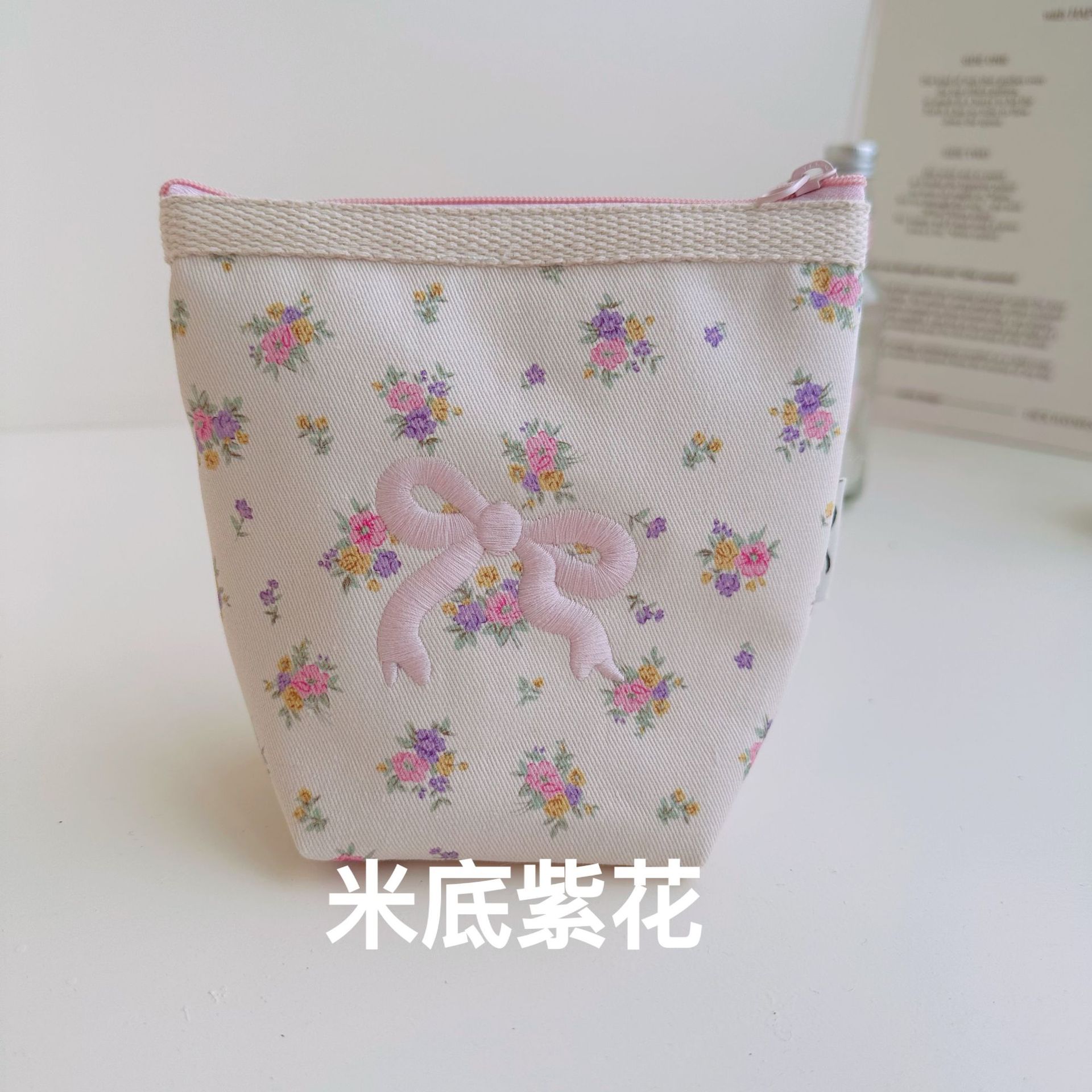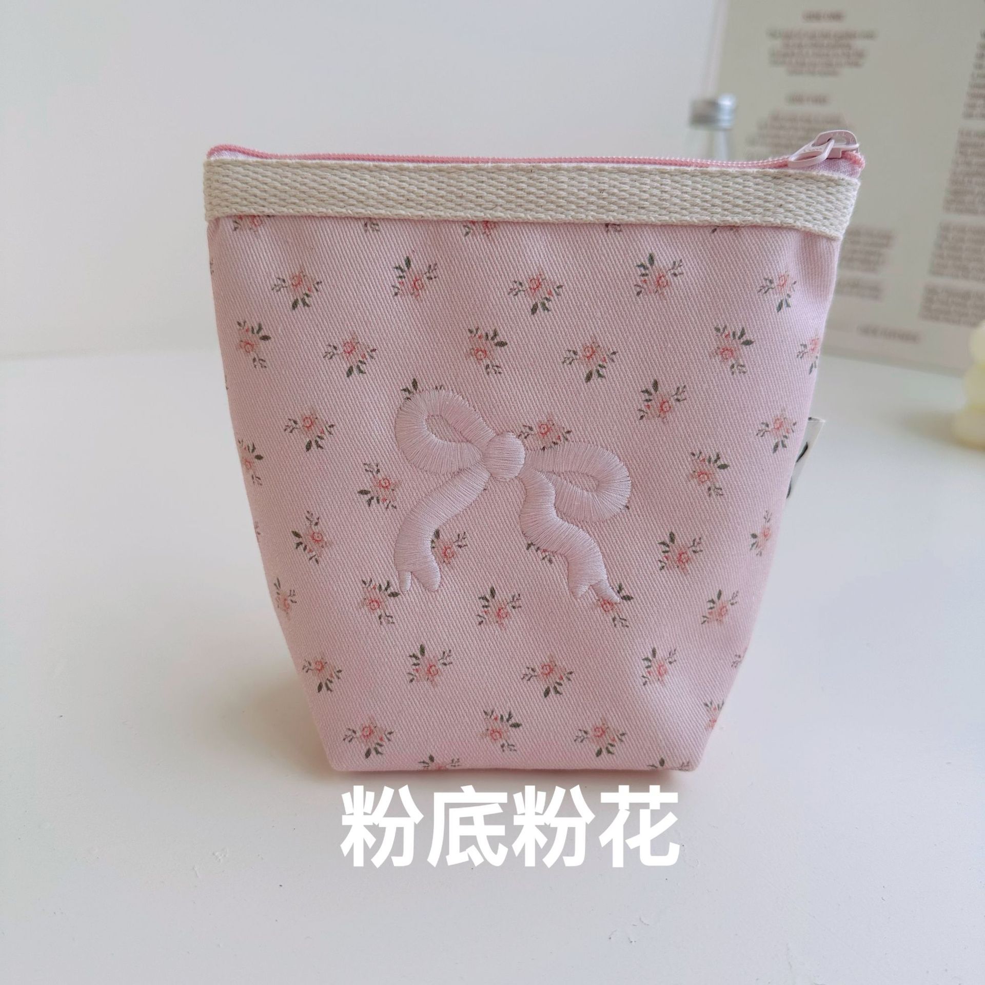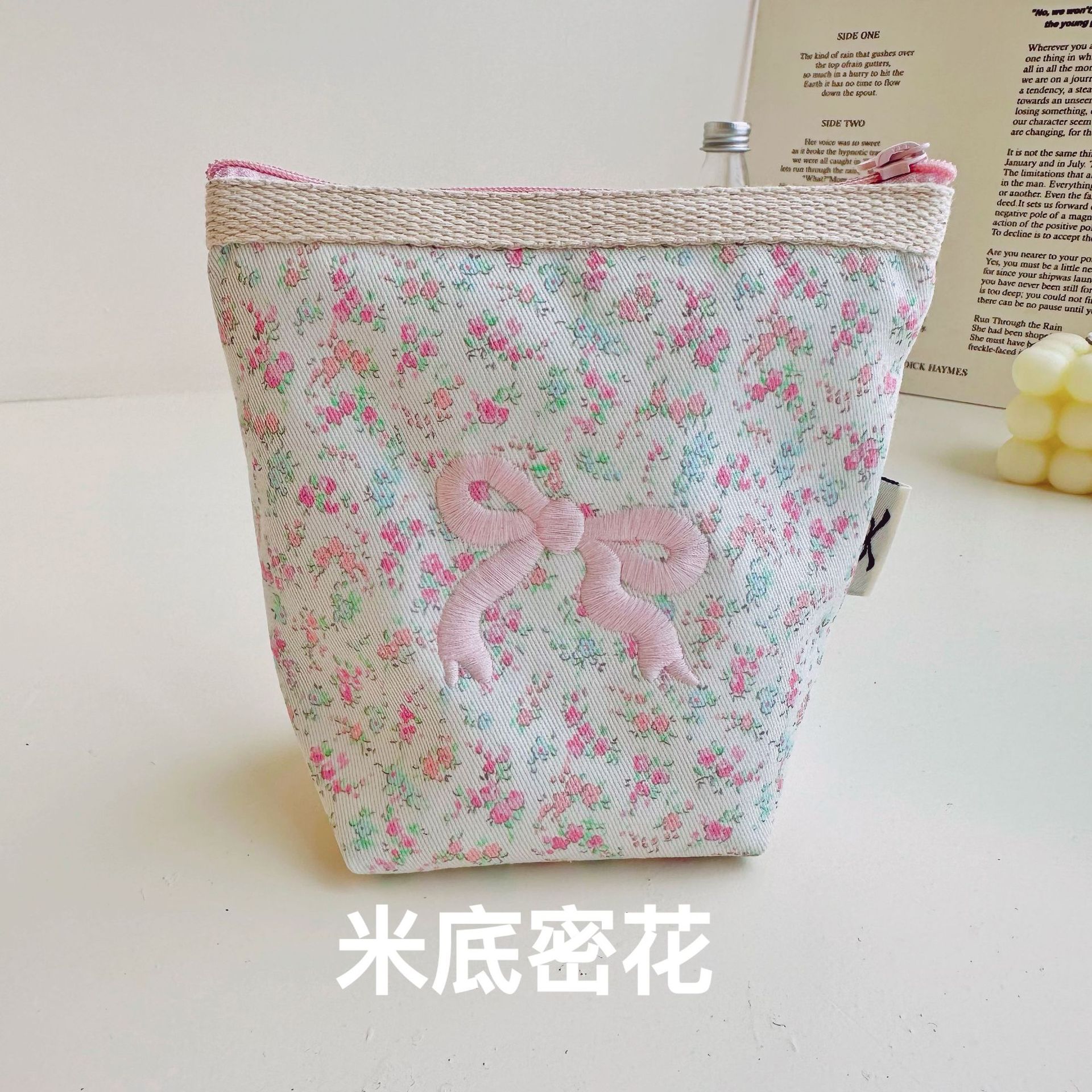 常规尺寸的一款布艺化妆包,面料是全棉印花加上刺绣,这个蝴蝶结刺绣也是棉线。里布是锦纶添加防水工艺,质感特别好。拉链全部采用正品YKK,支持贴牌定制生产。