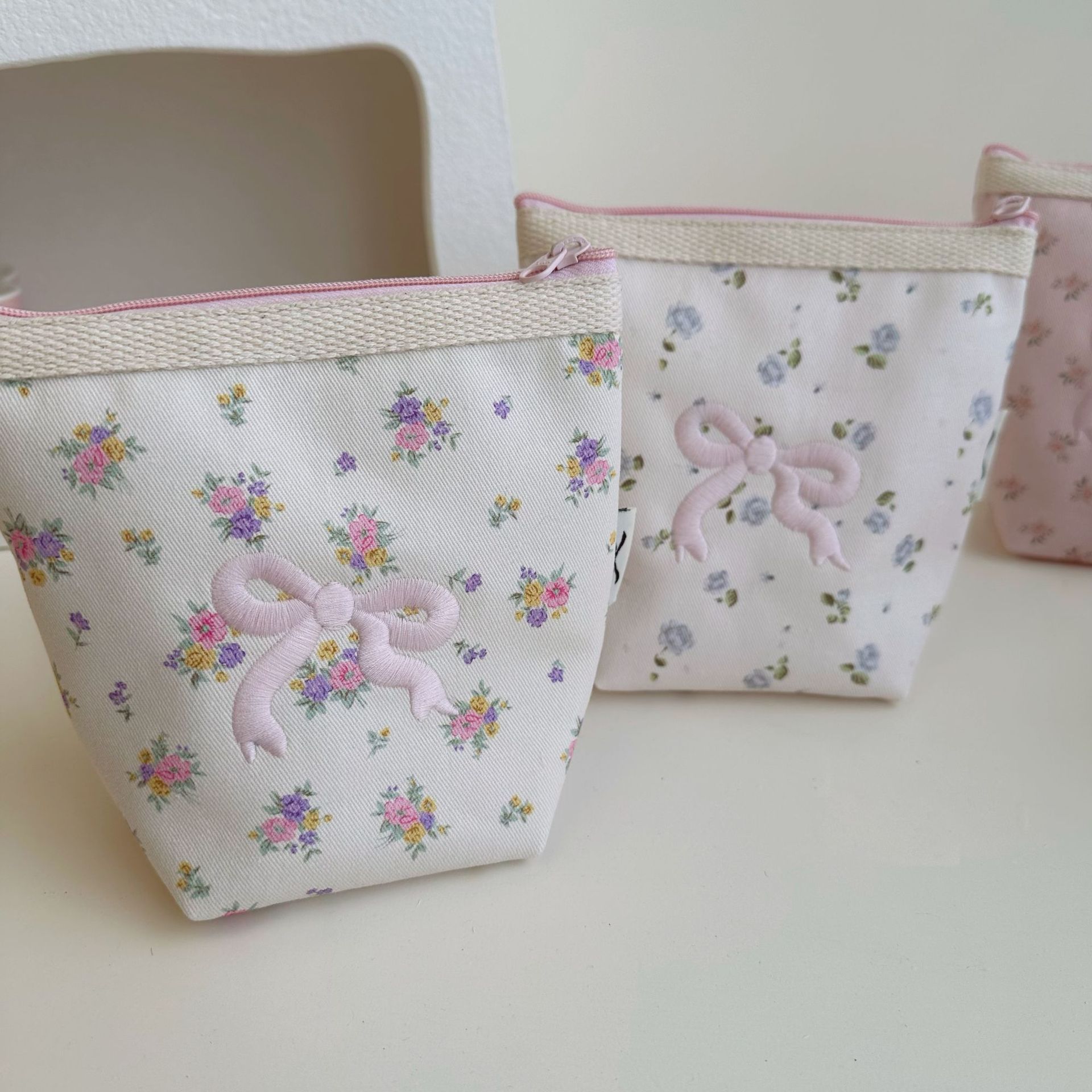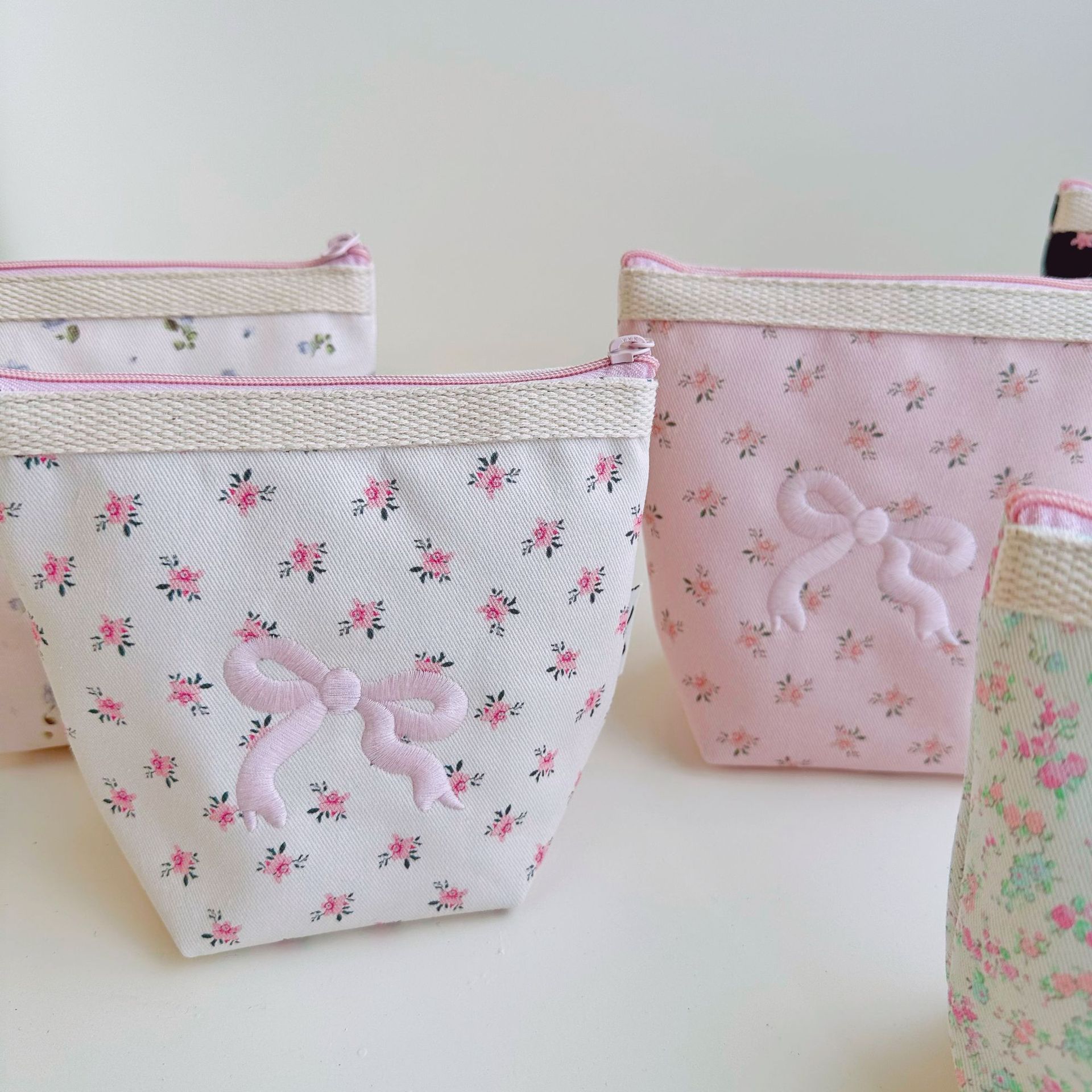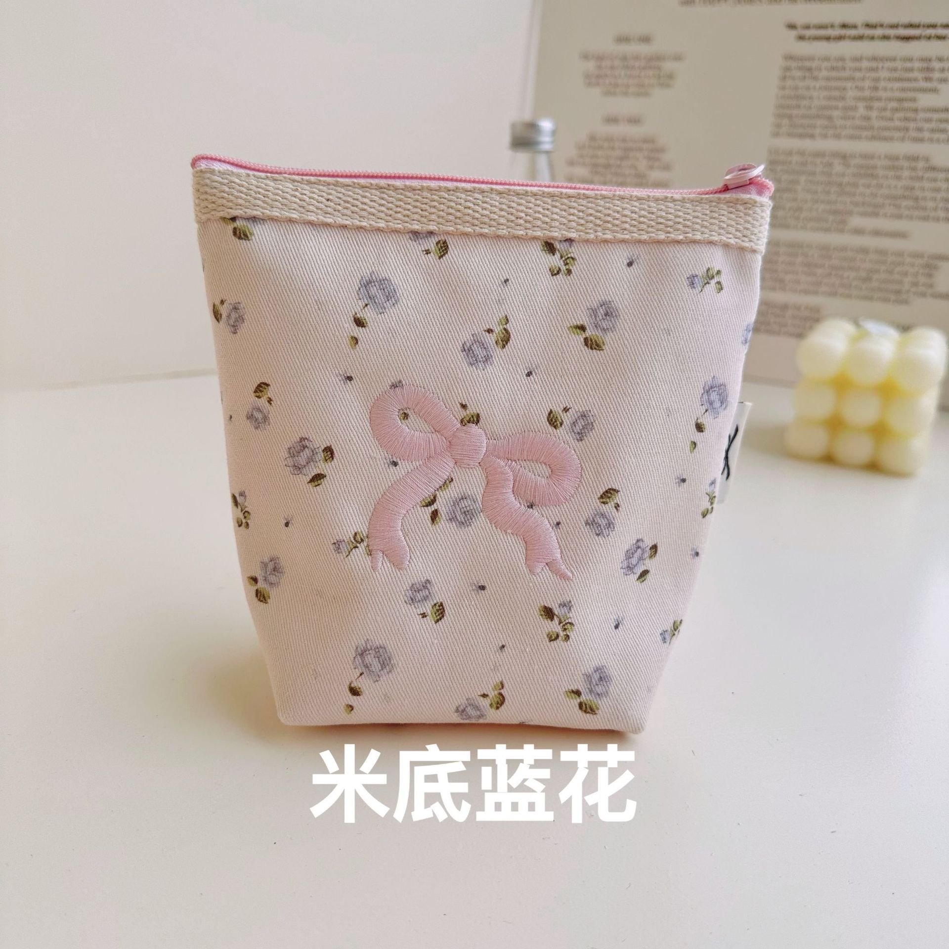 常规尺寸的一款布艺化妆包,面料是全棉印花加上刺绣,这个蝴蝶结刺绣也是棉线。里布是锦纶添加防水工艺,质感特别好。拉链全部采用正品YKK,支持贴牌定制生产。