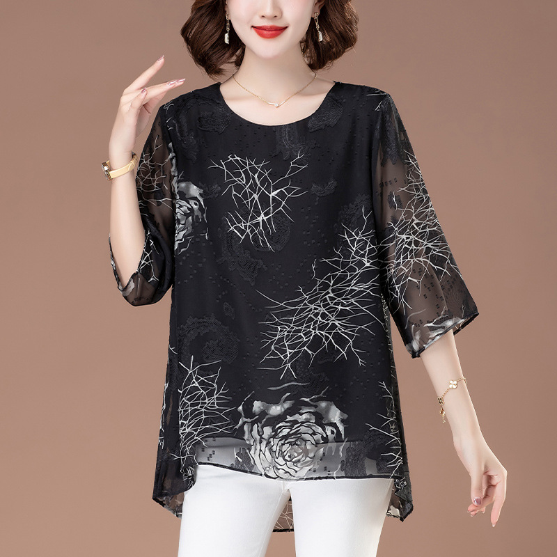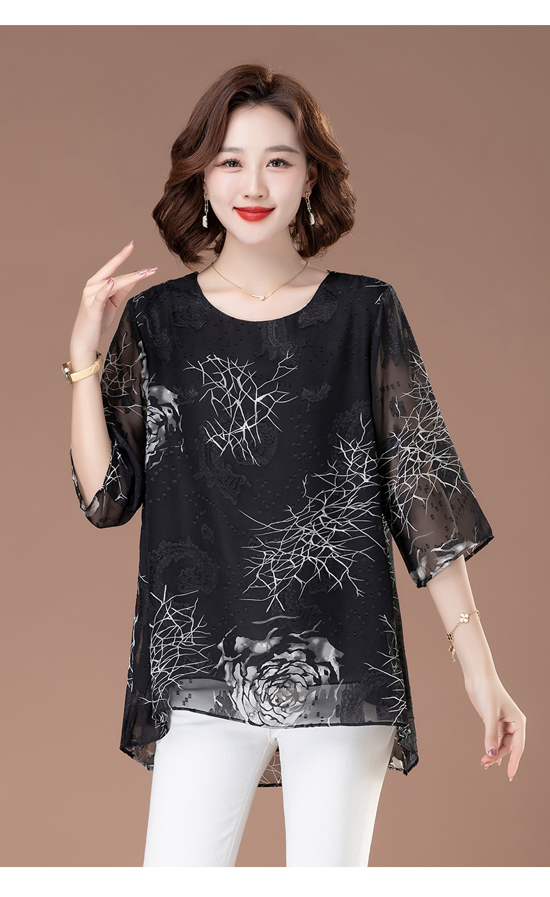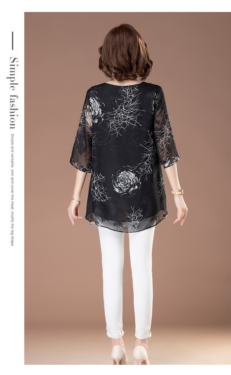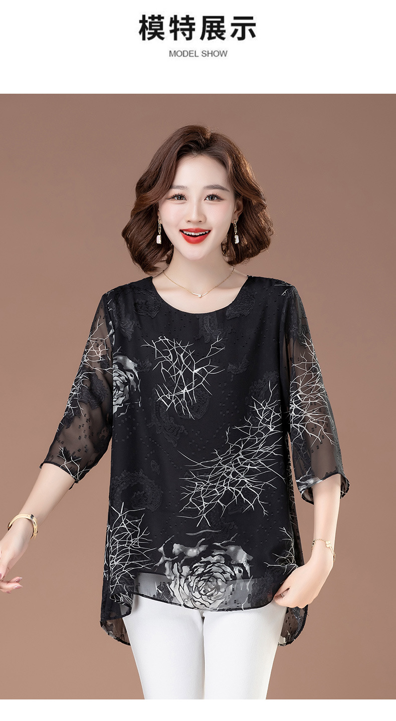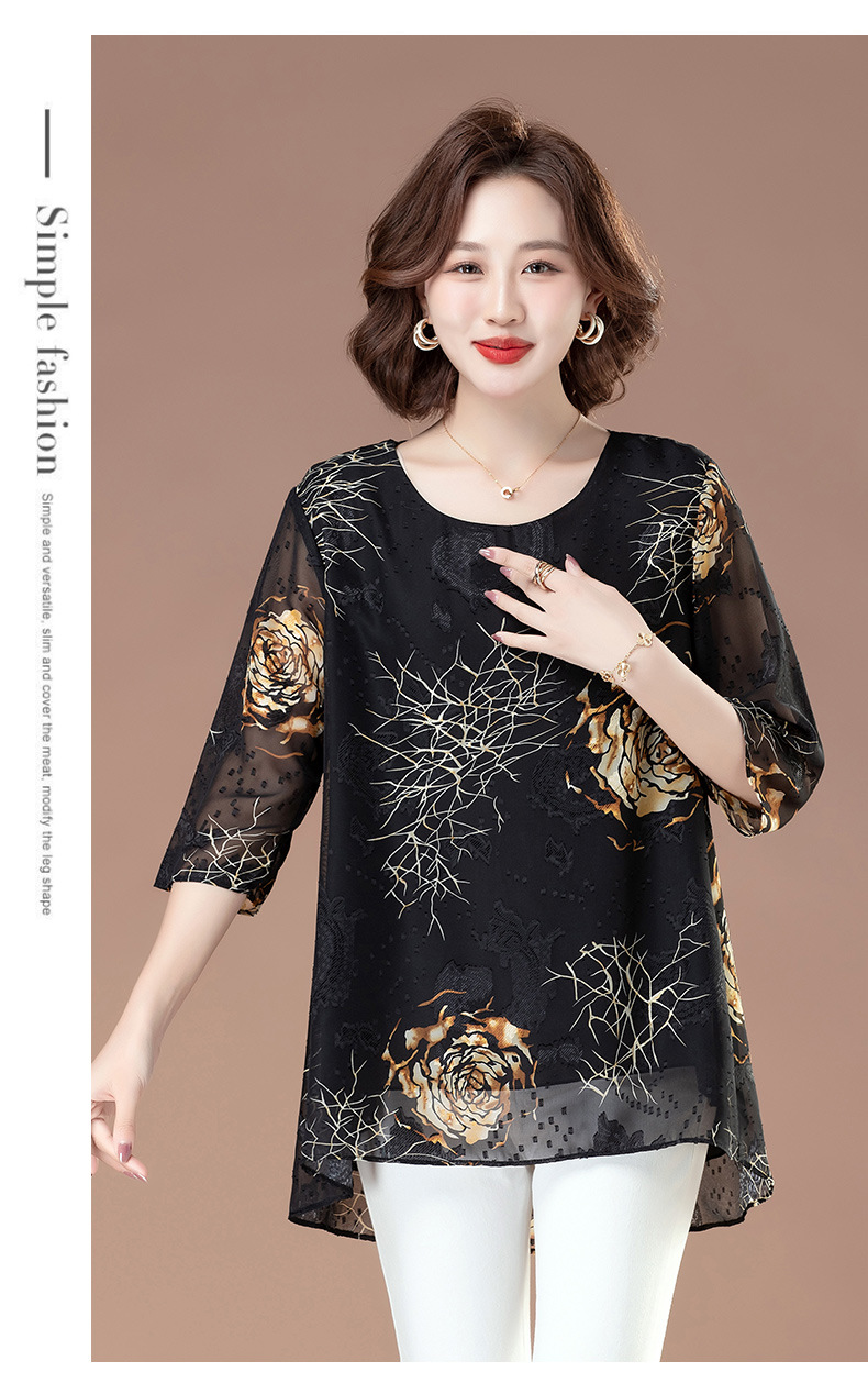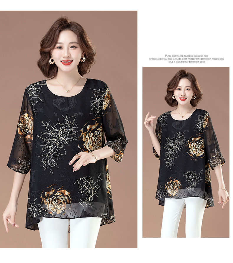 중년 및 노인 여성을위한 7부 소매 쉬폰 셔츠 2025 봄, 여름 어머니의 바닥 셔츠 서양식 패션 티셔츠 작은 셔츠상의