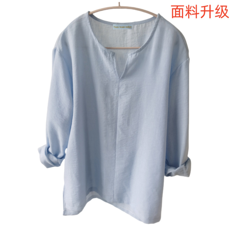 2024 남성과 여성의 청소년 중국 T 스타일 코튼 및 리넨 단색 느슨한 옷 중국 스타일 V 넥 긴 소매 셔츠스토어 가기