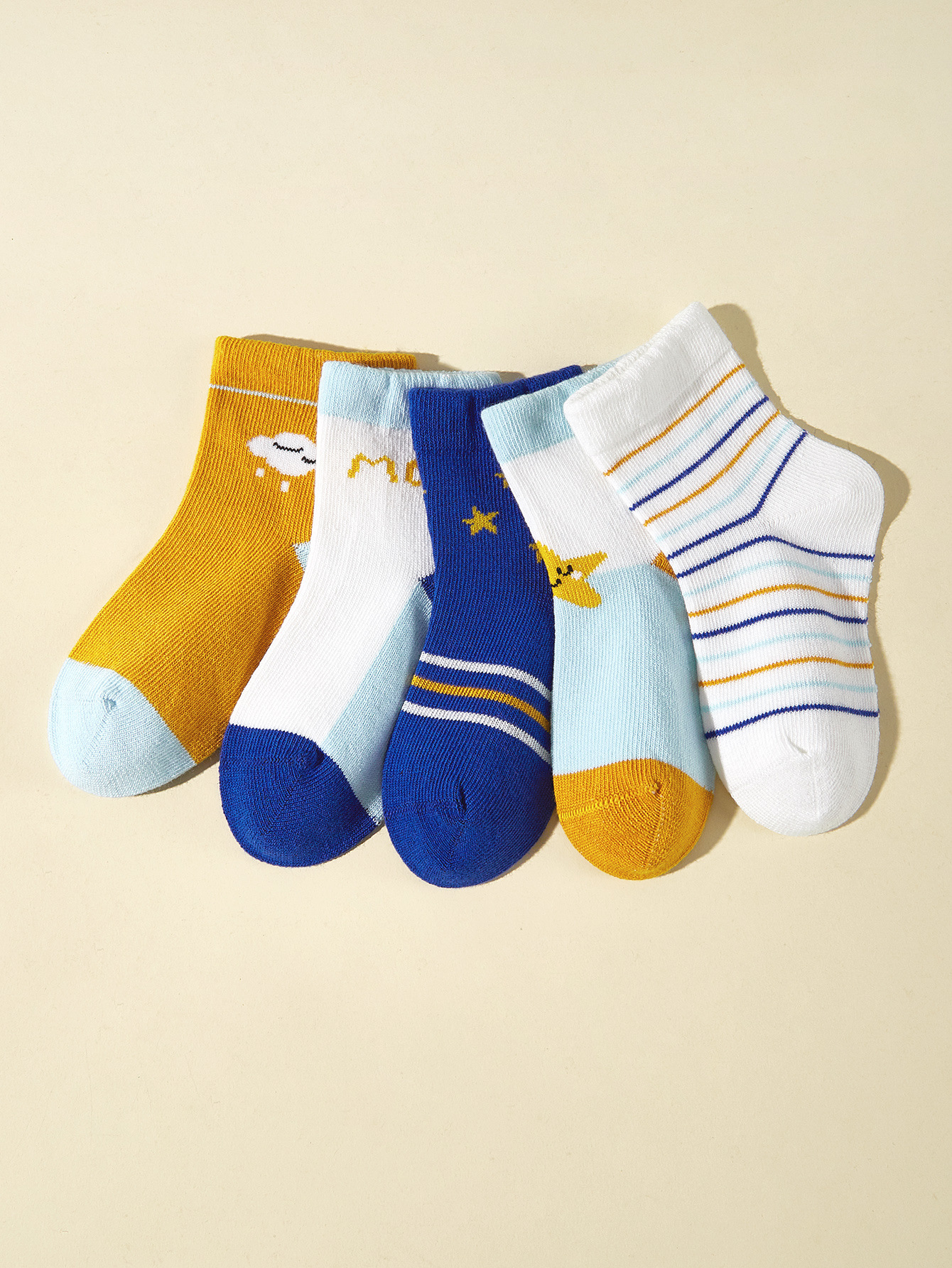 5 쌍의 남녀 어린이 줄무늬 글자 수 놓은 짧은 튜브 양말 뼈없는 바느질 양말 머리는 발을 아프게하지 않습니다.
