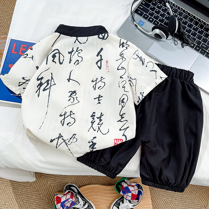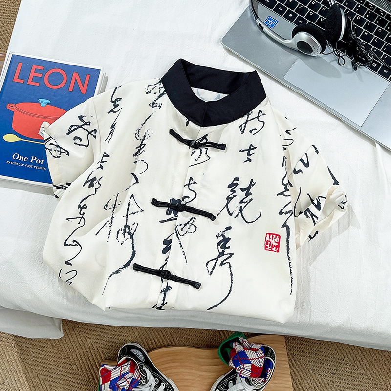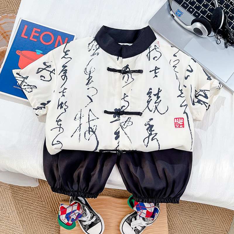 소년 Guofeng 반팔 세트 여름 새로운 스타일 편안하고 세련된 얇은 전체 인쇄 책 스타일 디스크 버튼 반팔 소매
