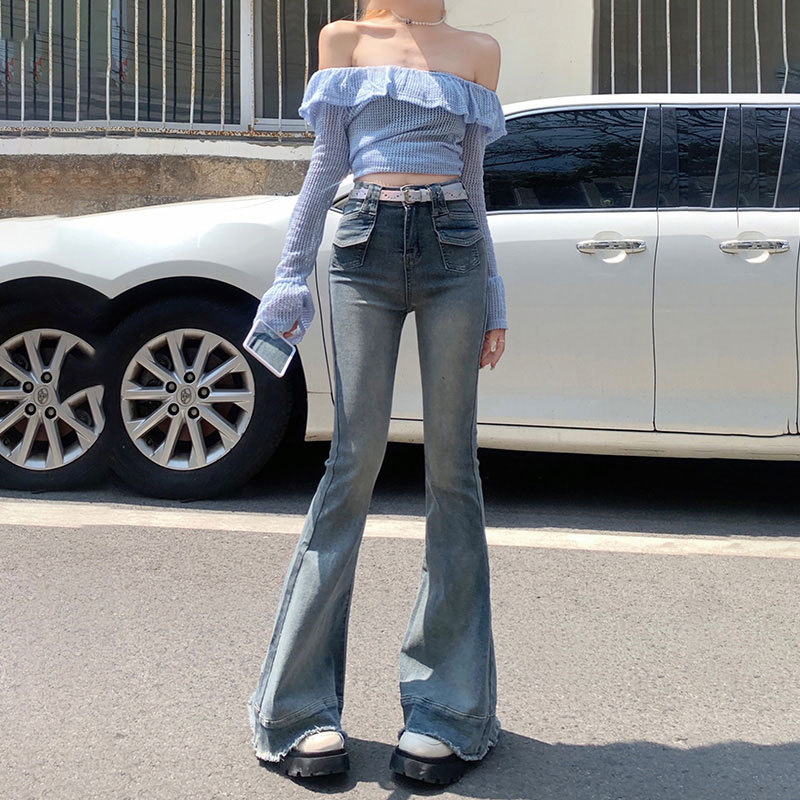 틈새 디자인 센스 데님 마이크로 블러 바지 여성 스트레이트 혼 하이 웨이스트 슬림 핏 스트레치 말굽 바지