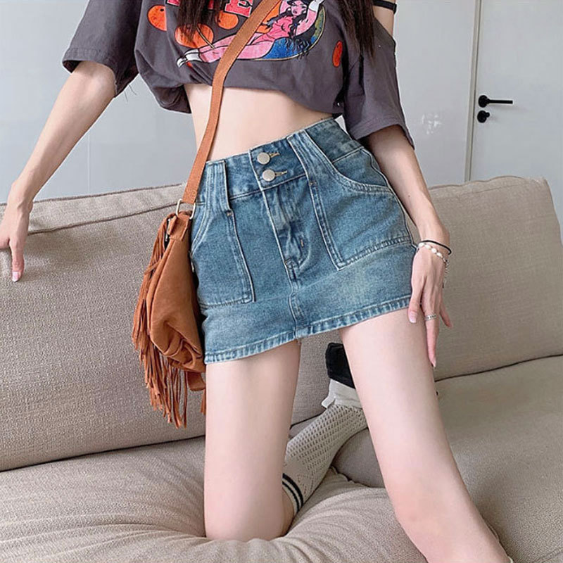 절반 길이 데님 짧은 치마 여성용 트렌디 더블 버튼 하이 허리 안티 러닝 라이트 디자인 센스 힙합 랩 A-모양 틈새 레트로 바지 스커트스토어 가기