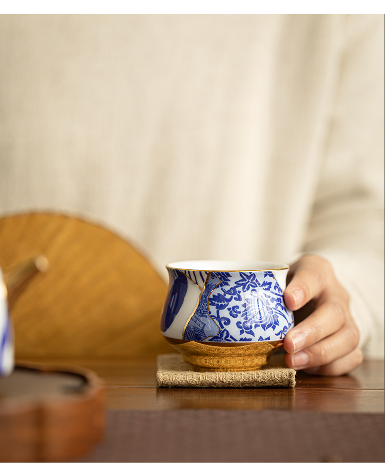 Dehua 차 세트 파란색과 흰색 손으로 그린 도자기 타이어 금도금 티 컵 마스터 컵 차 시음 컵 쿵푸 차 세트 개인 선물 상자