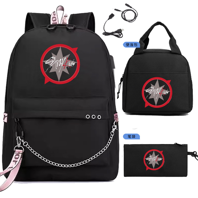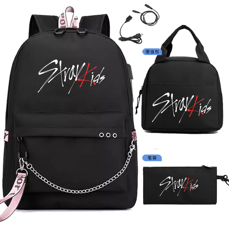 새로운 StrayKids Shengwen Peripheral Chain Backpack USB 학생 Schoolbag 단열 런치 백 백팩 3 피스 세트