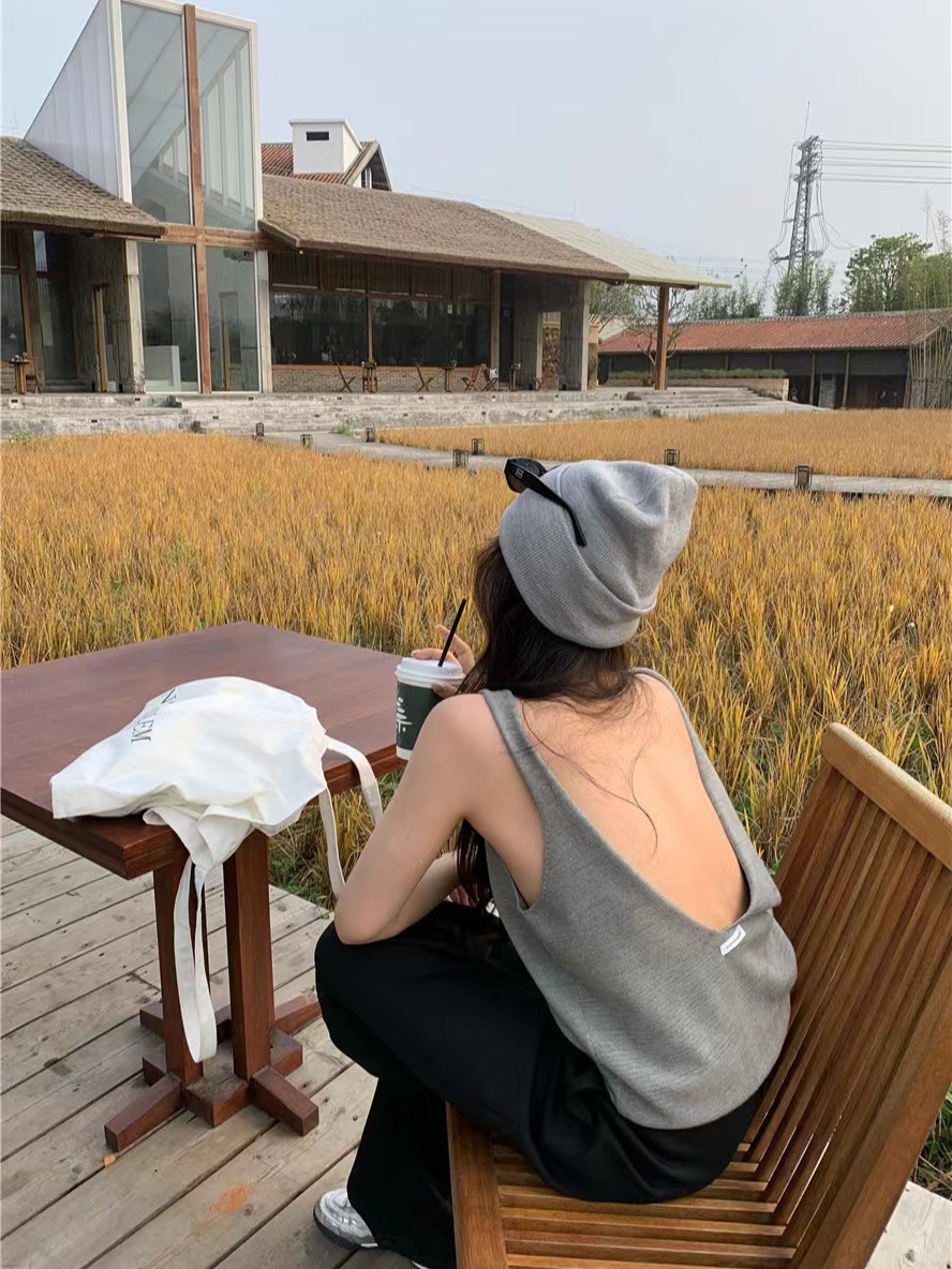 뜨거운 소녀 틈새 니트 그레이 카미 솔 여성의 2024 여름 느슨한 캐주얼 디자인 센스 빅 백리스 탑
