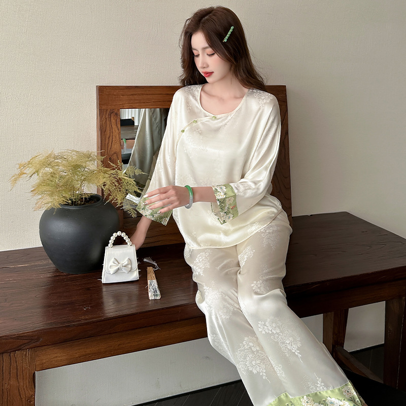 중국풍 여성용 풀오버 잠옷, 고대풍 자카드 세트, 가볍고 얇은 아이스 실크 홈웨어, 고급스러운 궁전풍스토어 가기