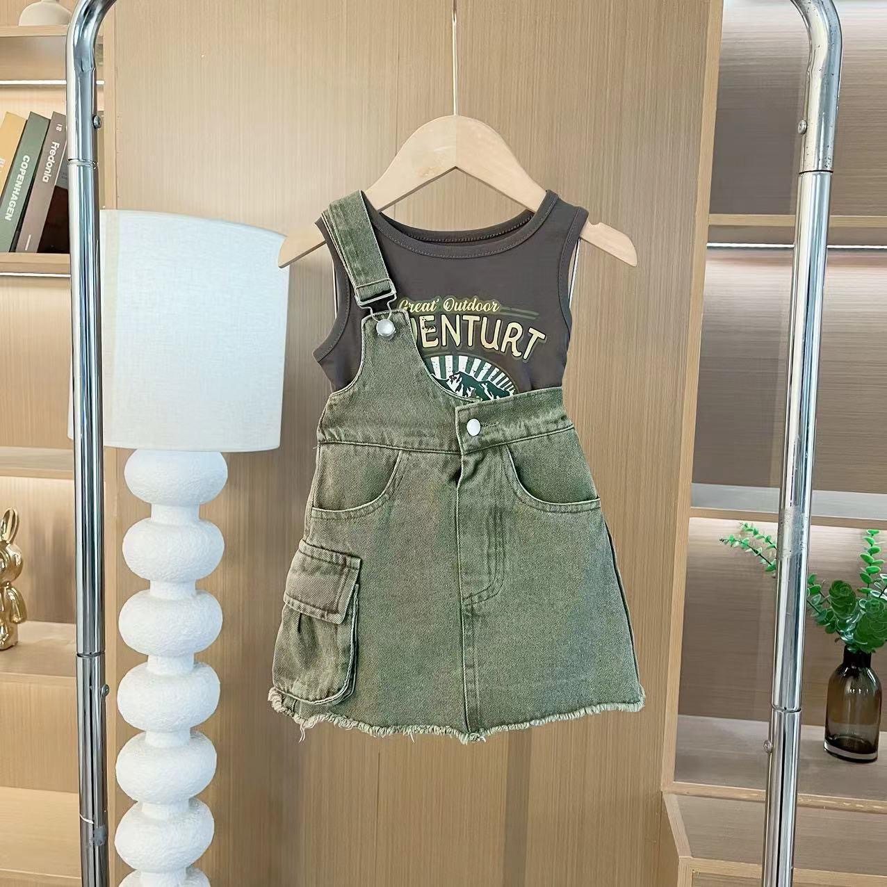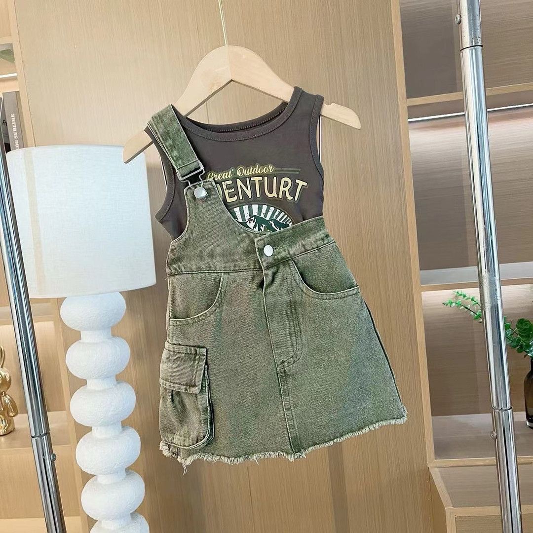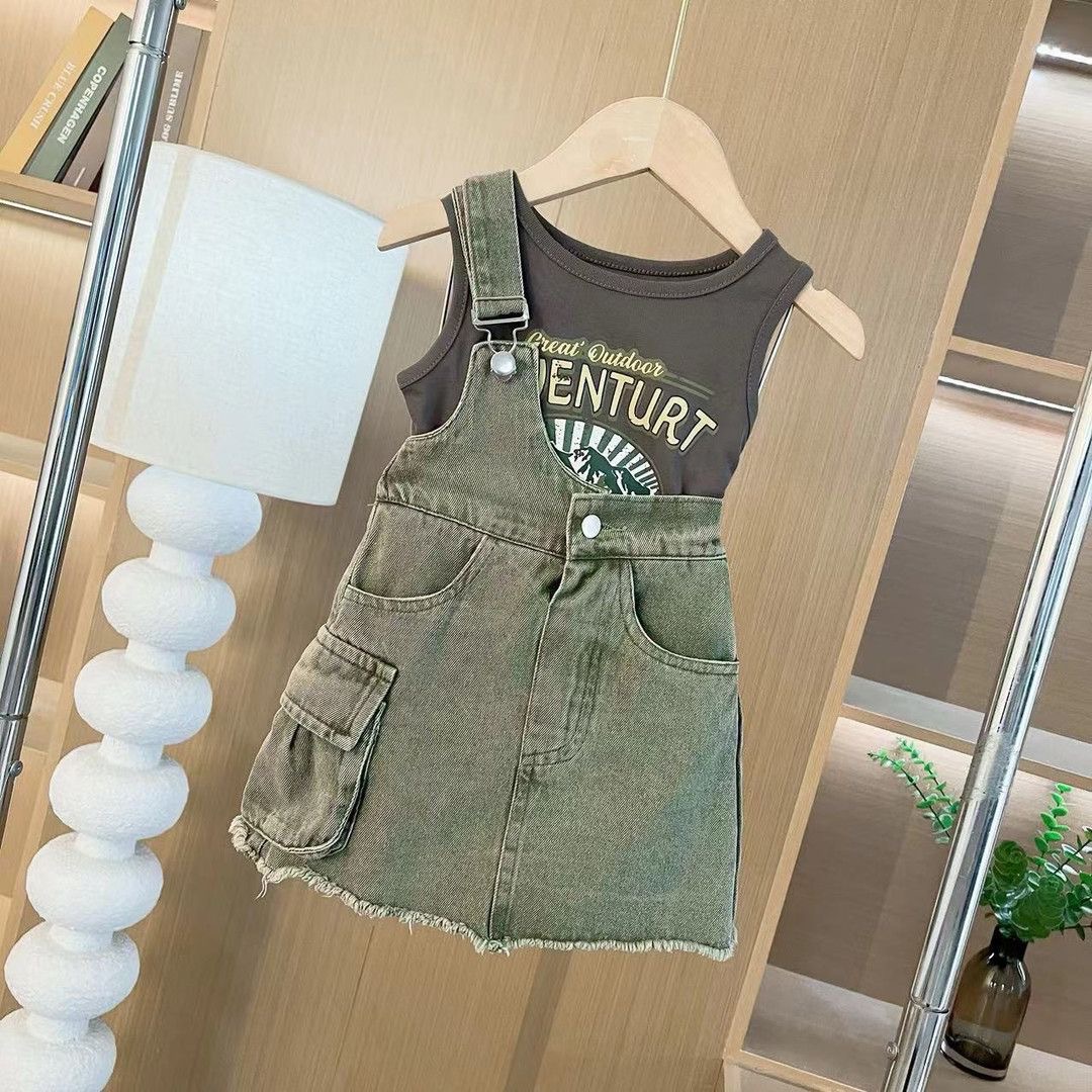 한국 스타일 걸스 스트랩 쇼트 스커트 2024 여름 새 스타일 소녀의 날씬한 어깨 데님 스트레이트 스커트 올매치 캐주얼