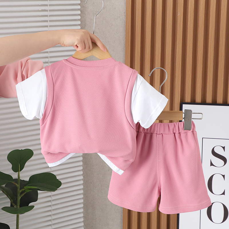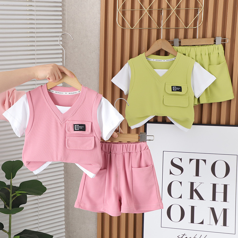 소년의 반팔 세트 여름 새로운 스타일 편안하고 세련된 얇은 V 넥 조끼 거짓 투피스 반팔 세트스토어 가기