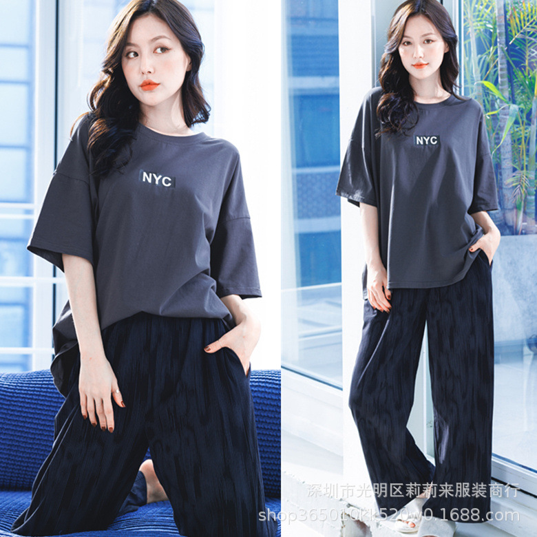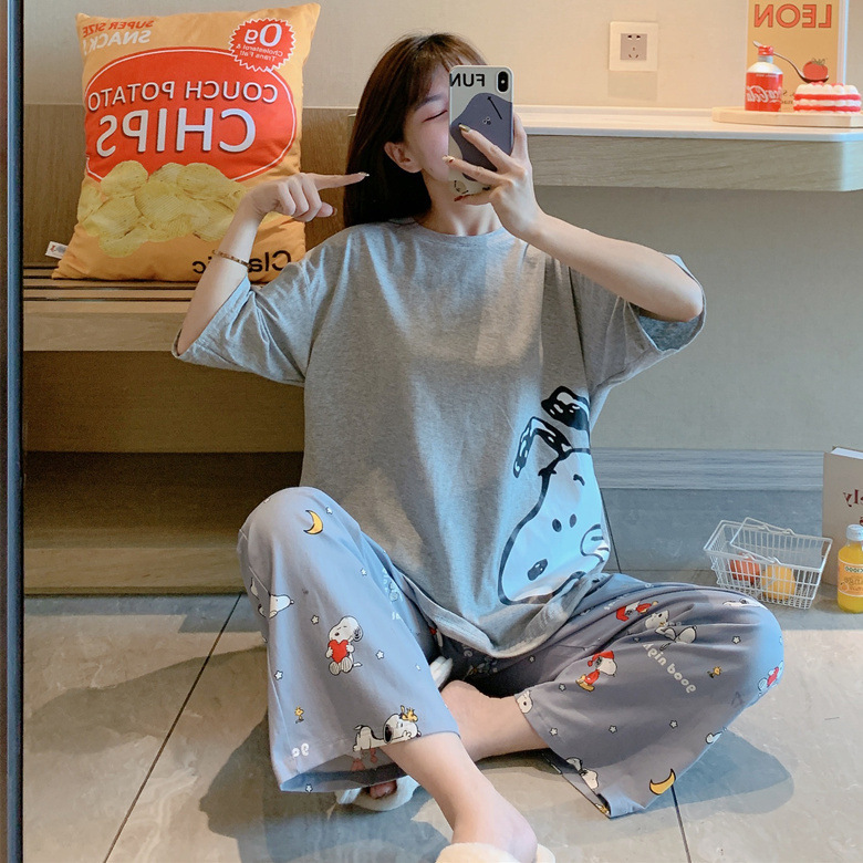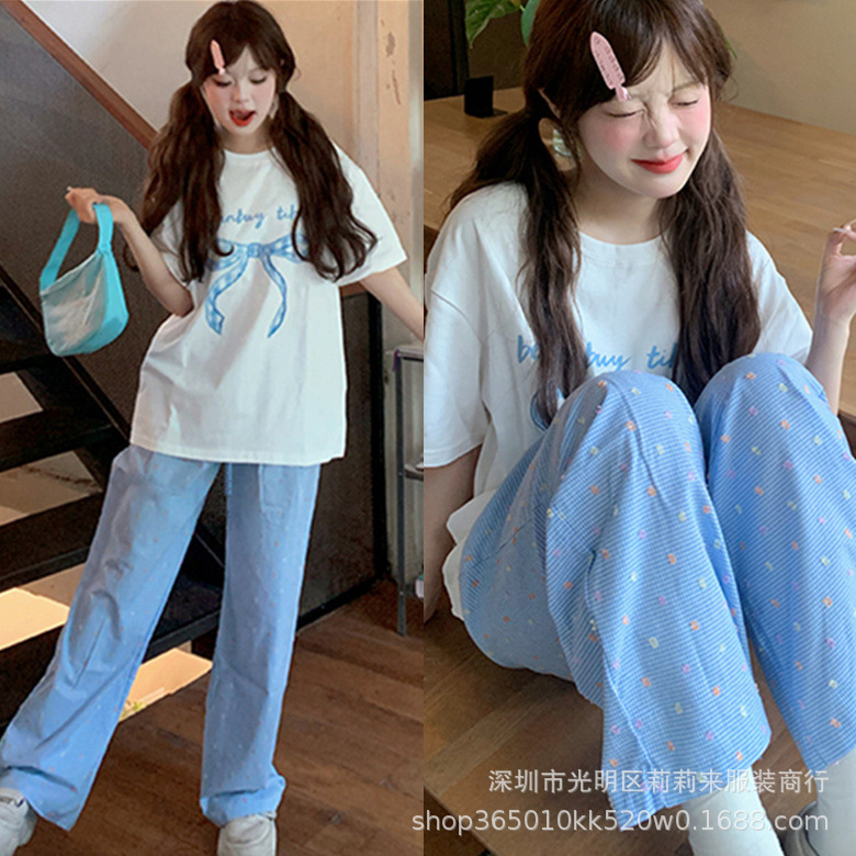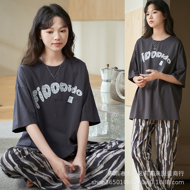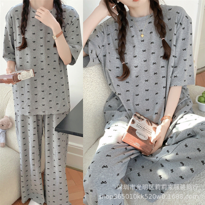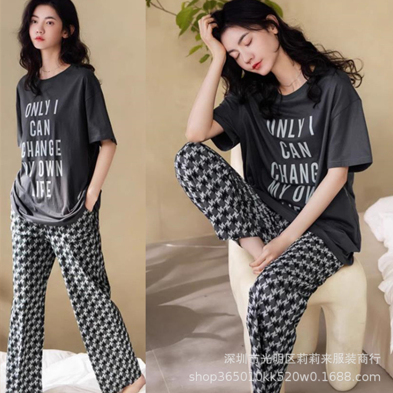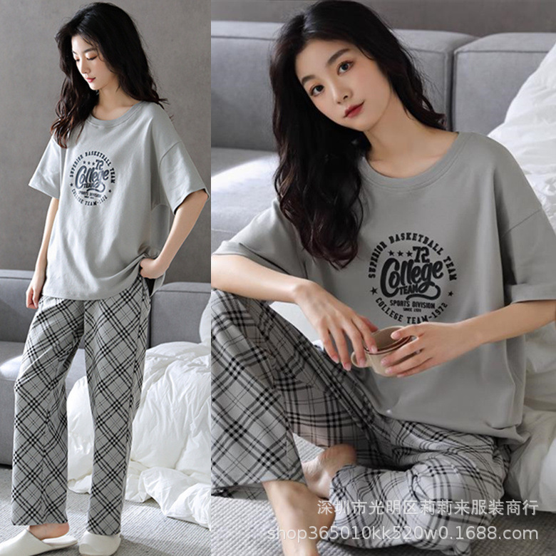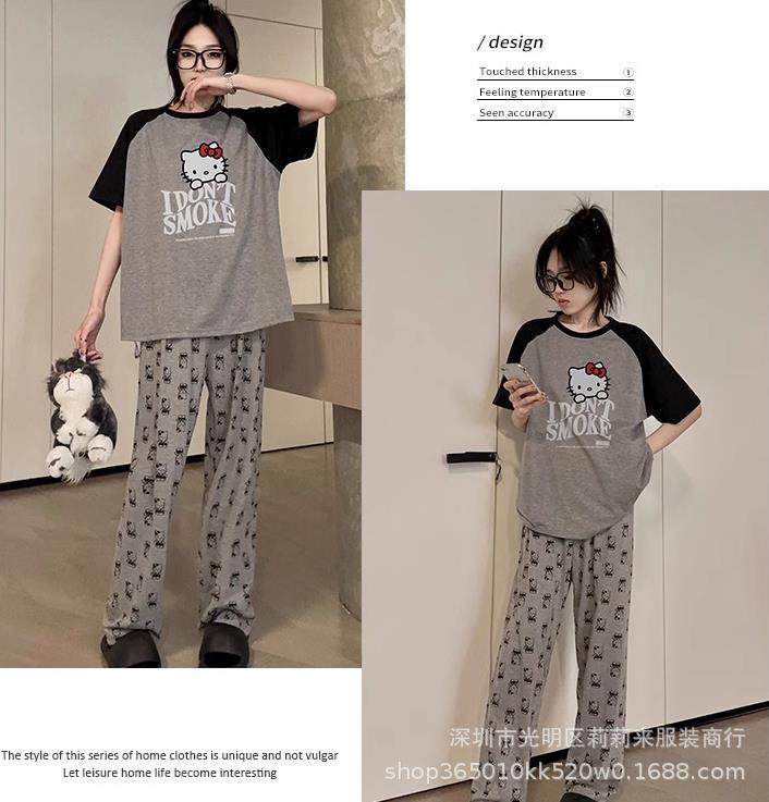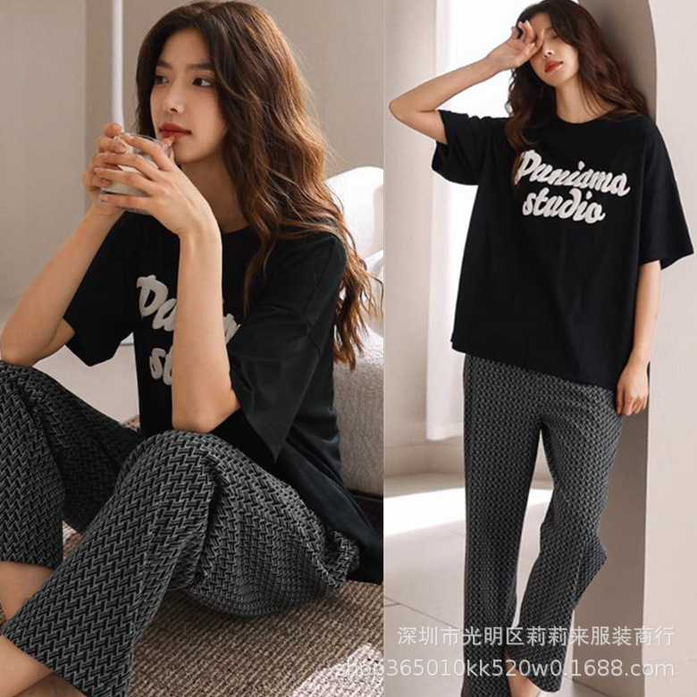 공장 도매 여름 가을 잠옷 여성 캐주얼 세트 홈 옷, 달콤한 핑크 소녀 짧은 소매 바지스토어 가기