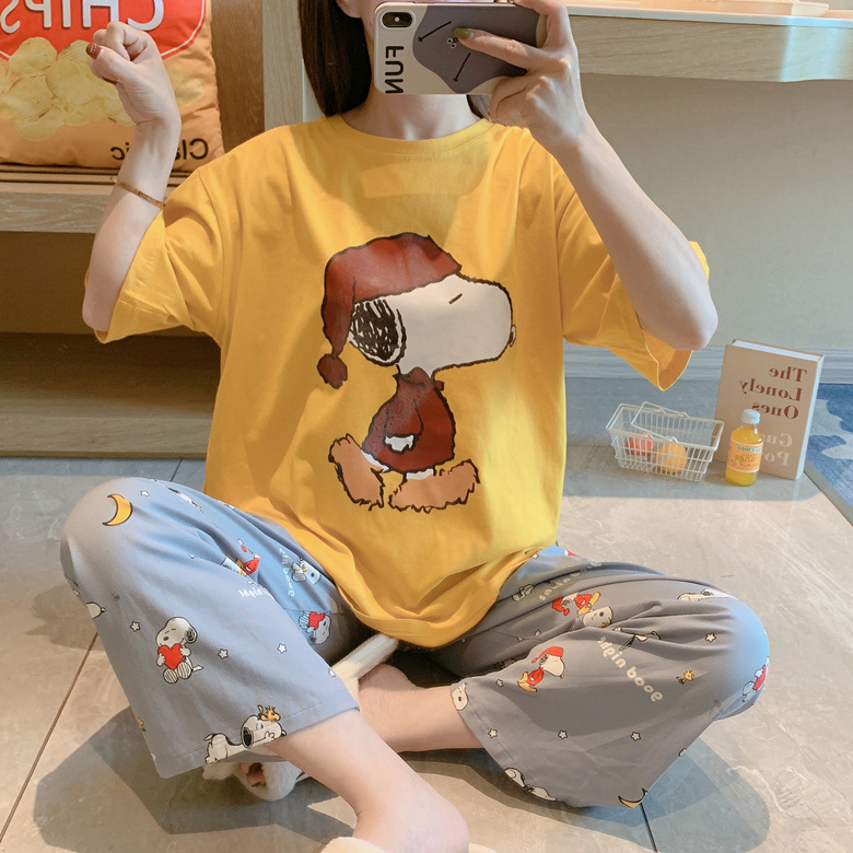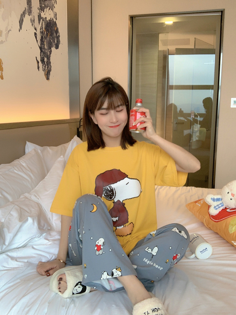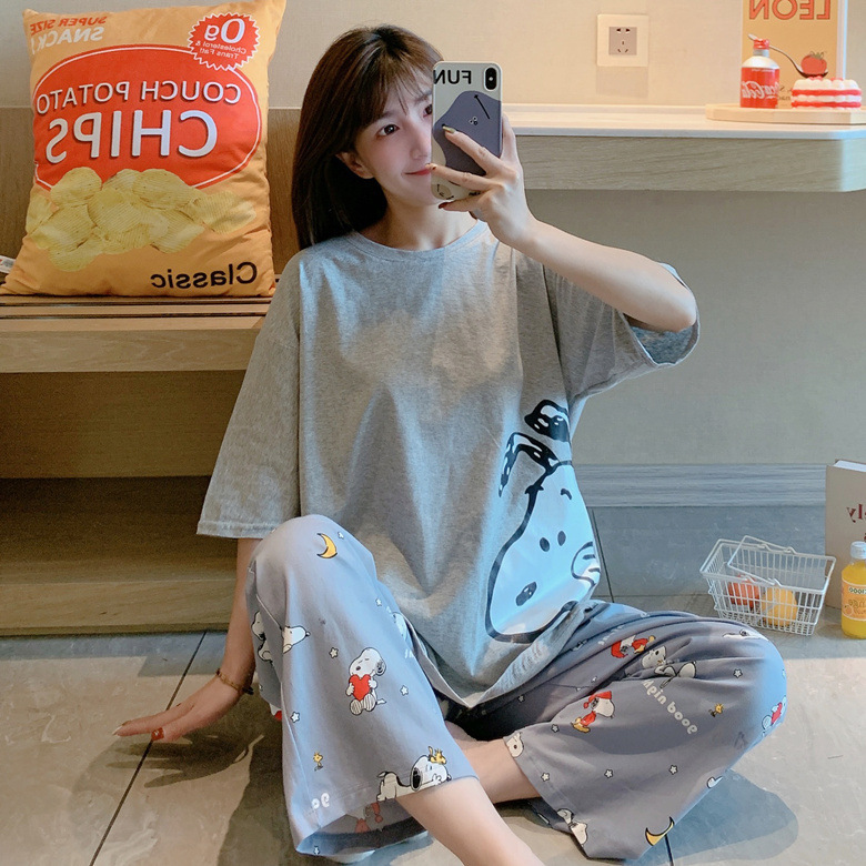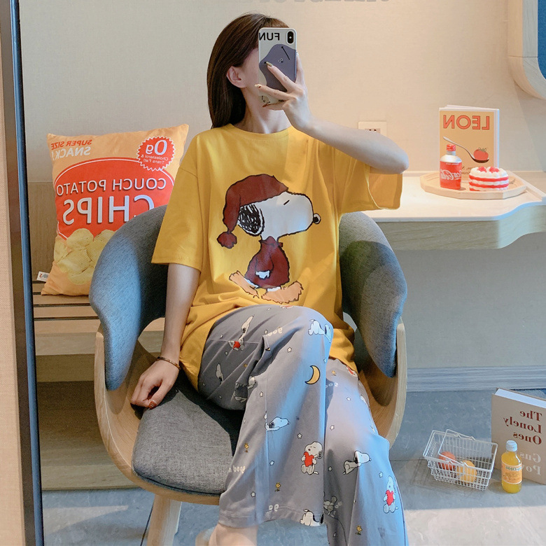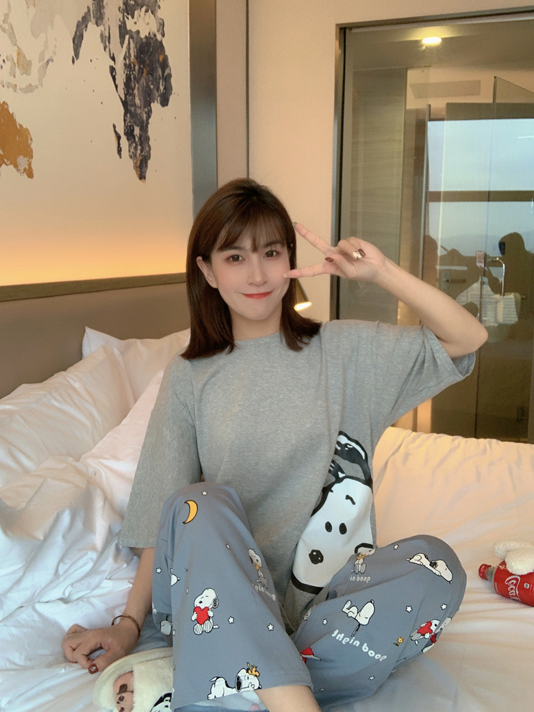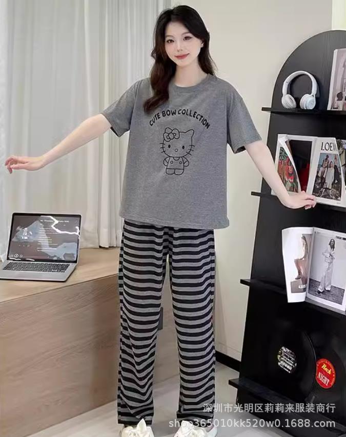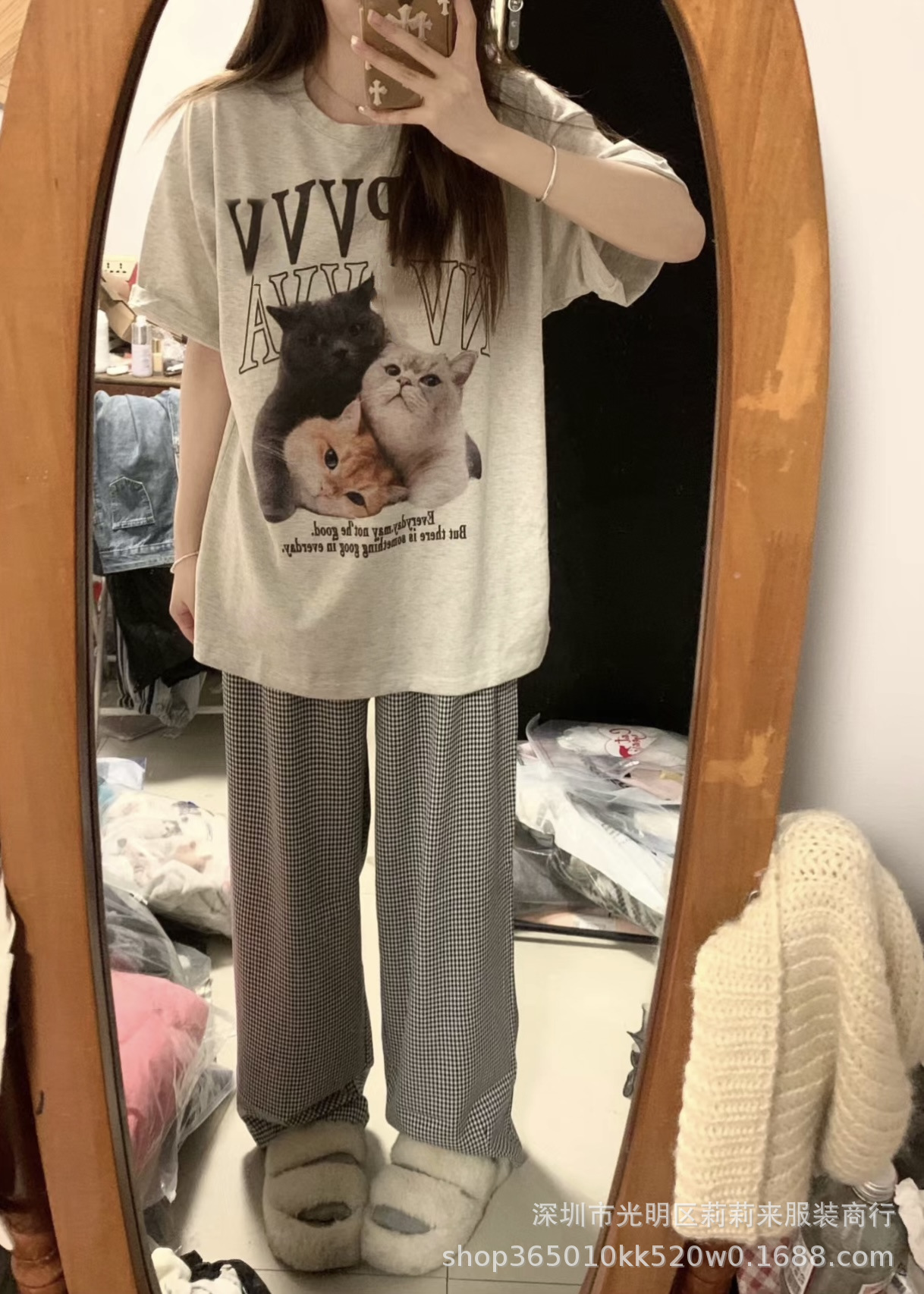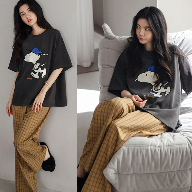 공장 도매 여름 가을 잠옷 여성 캐주얼 세트 홈 옷, 달콤한 핑크 소녀 짧은 소매 바지스토어 가기