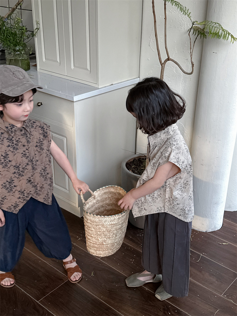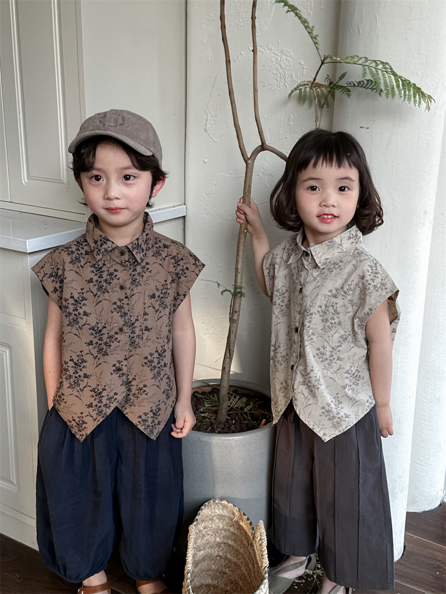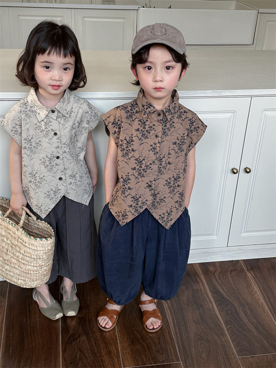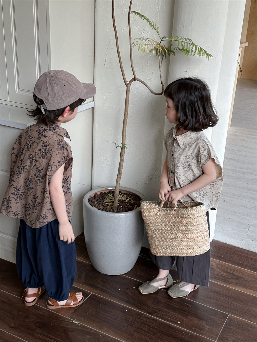 Jiaye 어린이 제품 2025 어린이 여름 새로운 꽃 반팔 셔츠 남성과 여성 아기 숲 복고풍 반팔 셔츠