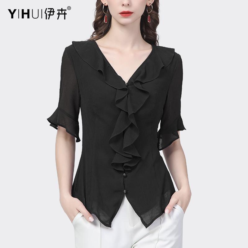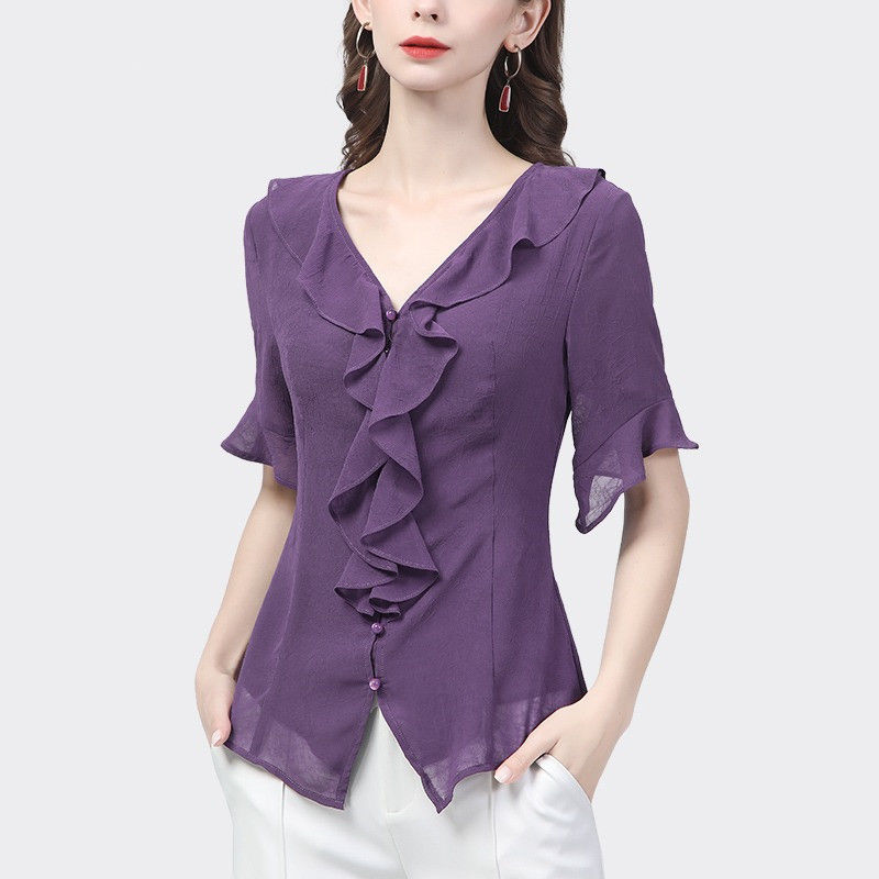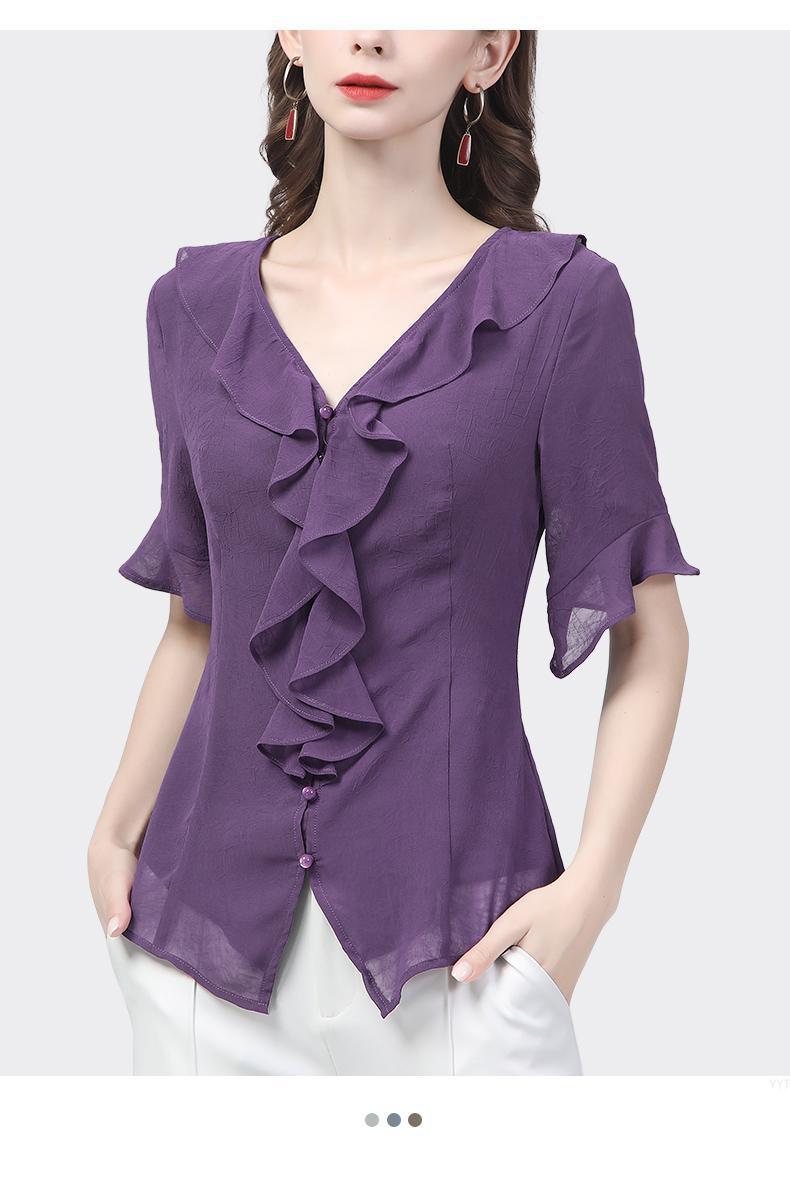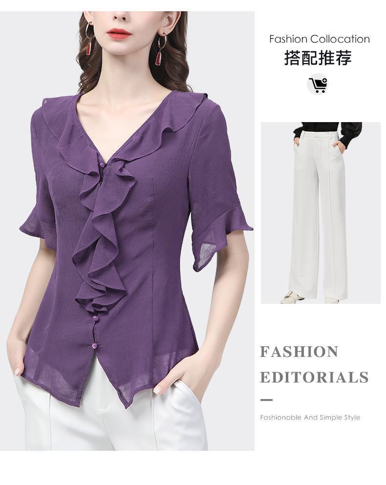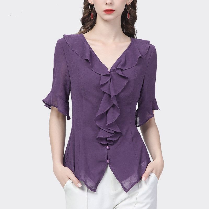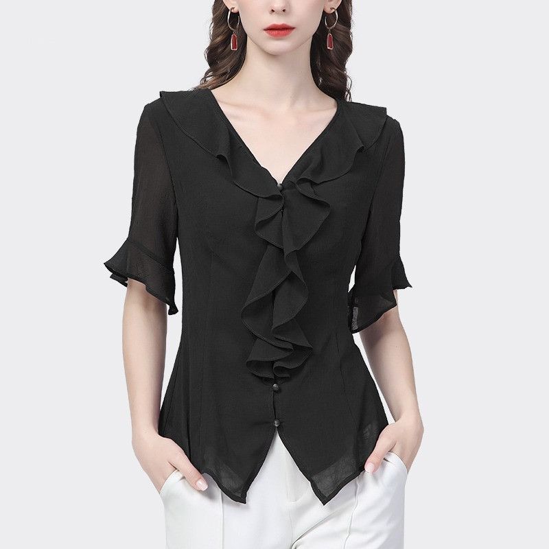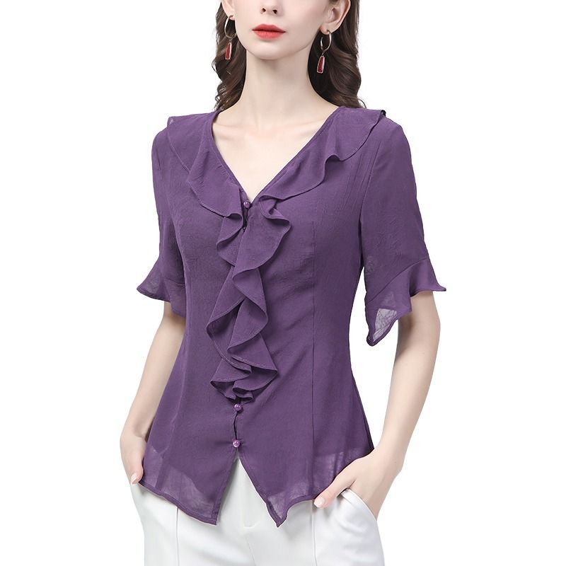 시폰 셔츠 디자인 센스 러플 반팔 셔츠 여성용 V 넥 패션 세련된 작은 셔츠 슬림 2024 여름 새로운스토어 가기
