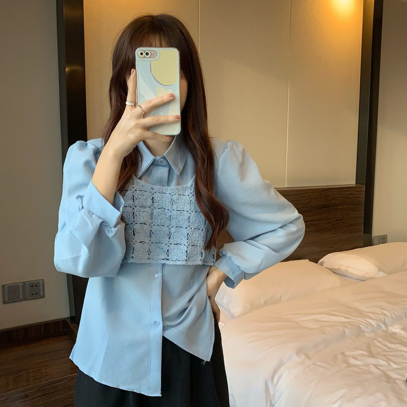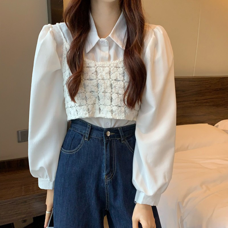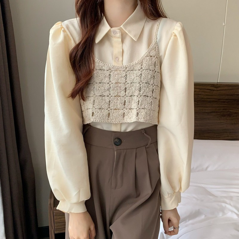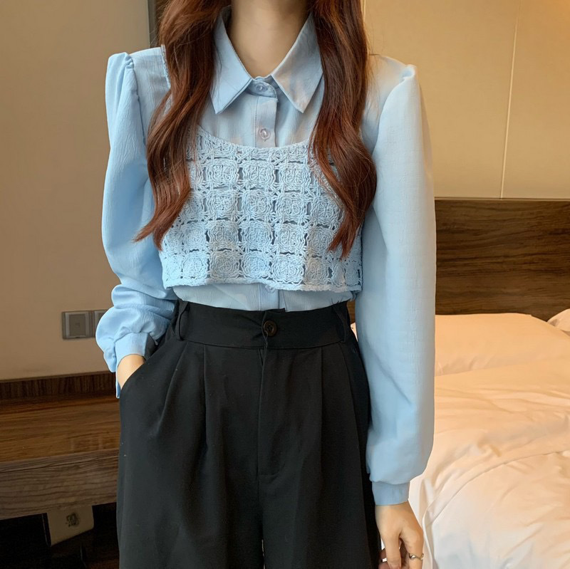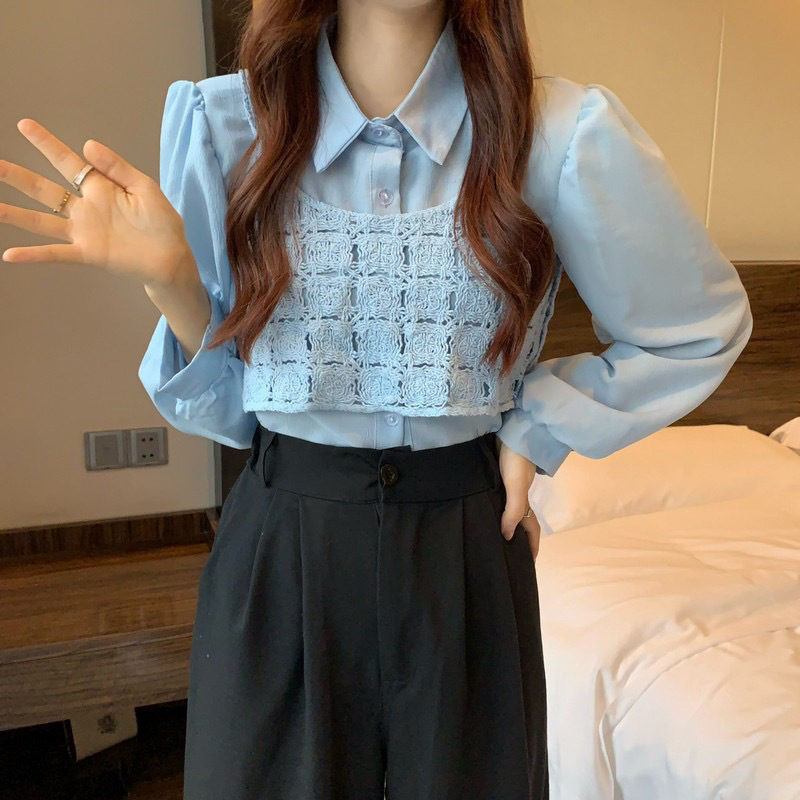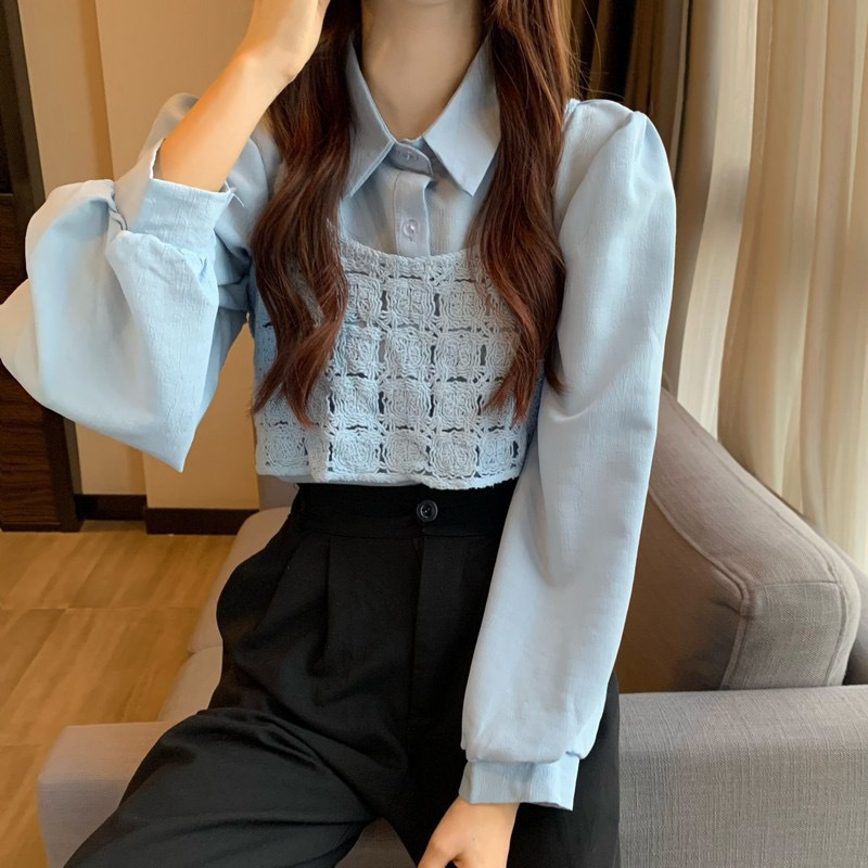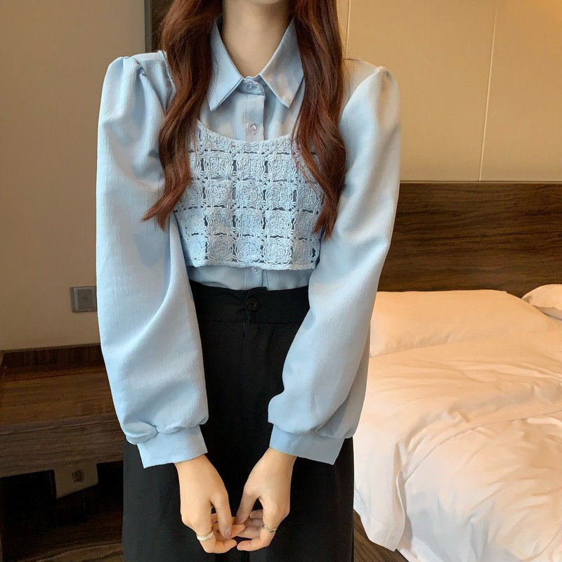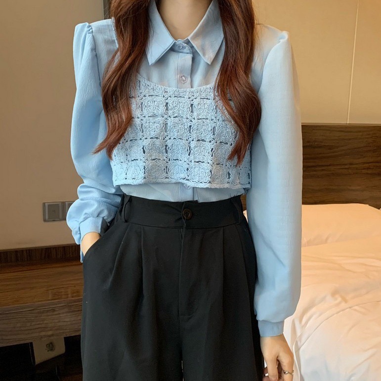 봄 2 피스 세련된 짧은 버튼 카미솔 플라잉 슬리브 대학 스타일 탑 여성스토어 가기
