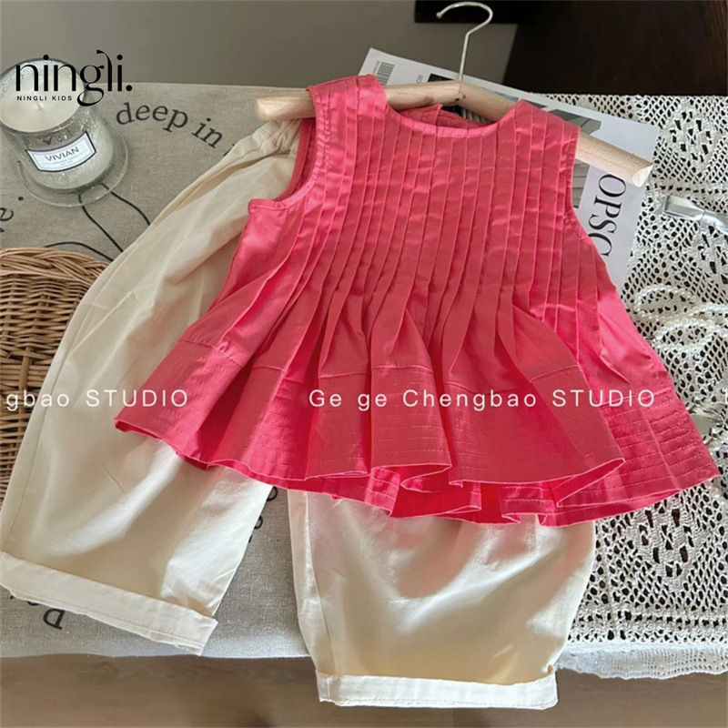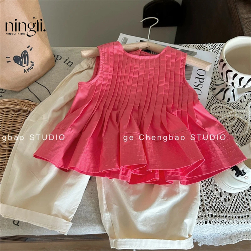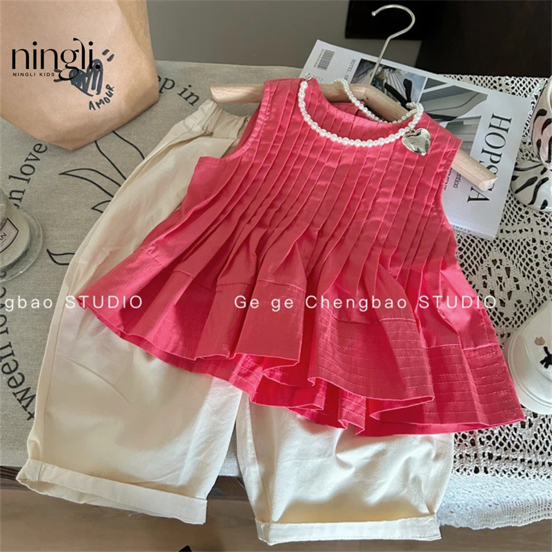 라임 소녀의 여름 세트 새로운 유행 단색 빨간 조끼 살구색 넓은 다리 바지 아기 소녀 세트 트렌디스토어 가기