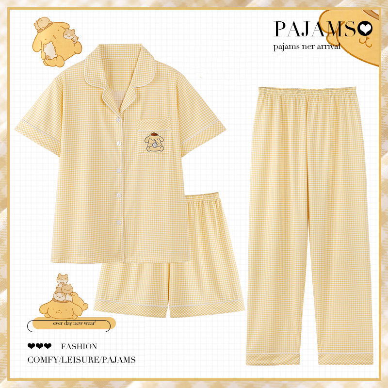 잠옷 여성 여름 새 반팔 바지 파자마 3 종 세트 달콤하고 까만 할 수있는 겉옷 여름 홈 의류 세트스토어 가기