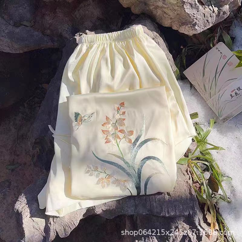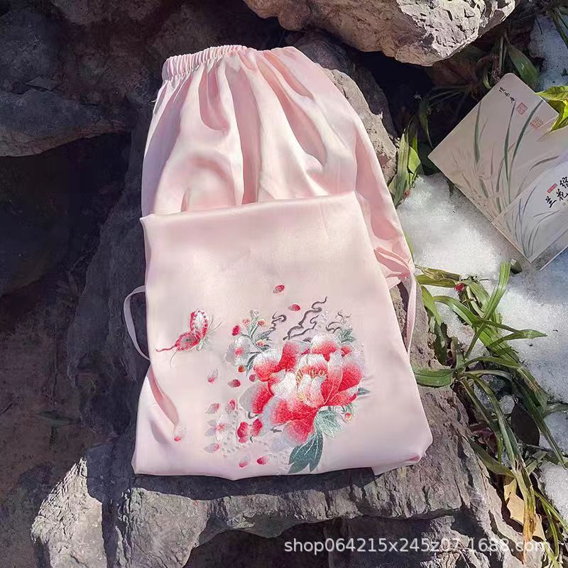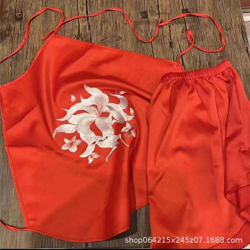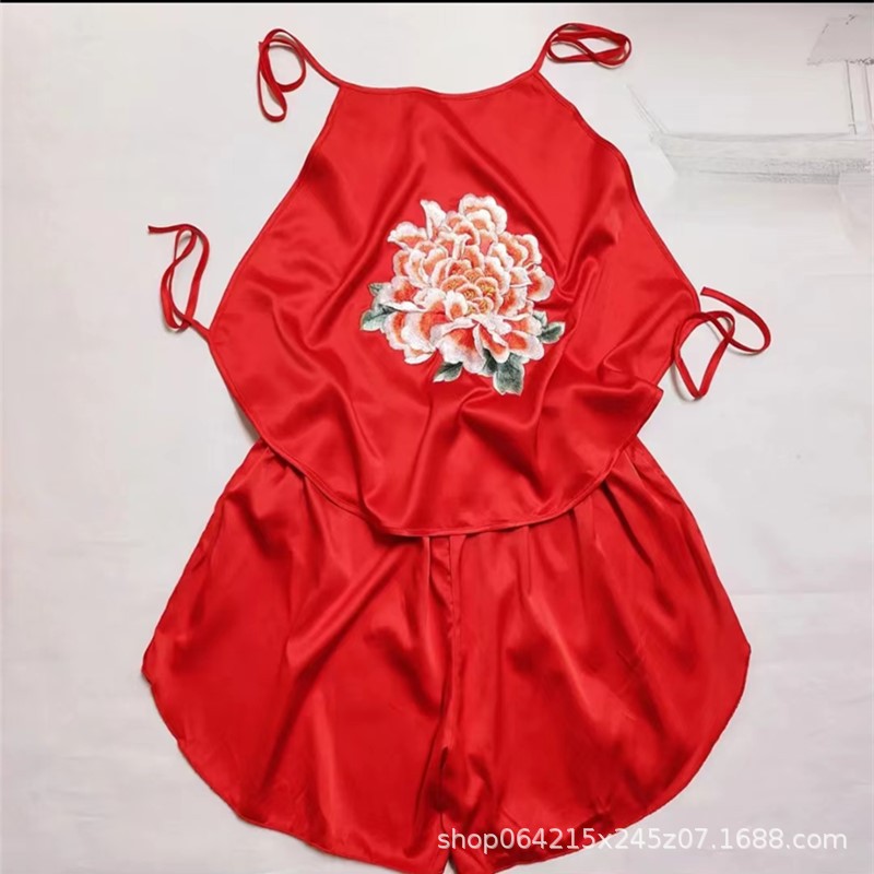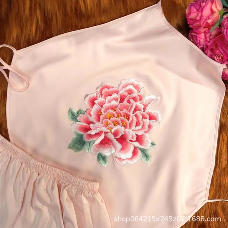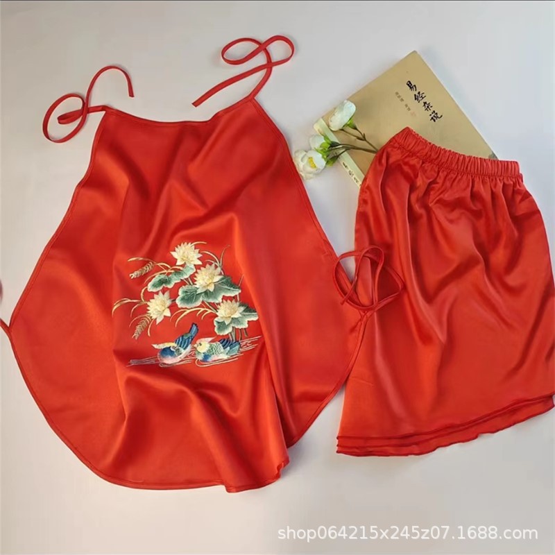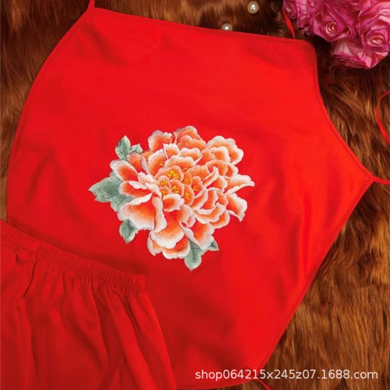 자수 민족 스타일 성인 아이스 실크 벨리 밴드 여성 속옷 더블 레이어 아이스 실크 섹시 파자마 골동품 자수 조끼 세트