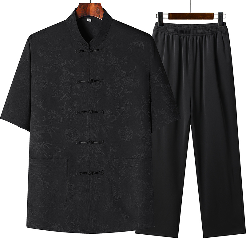여름 중년 및 노인 탕 원피스 남자 얇은 아이스 실크 세트 중국 스타일 아빠의 반팔 노인 생일 할아버지 원피스