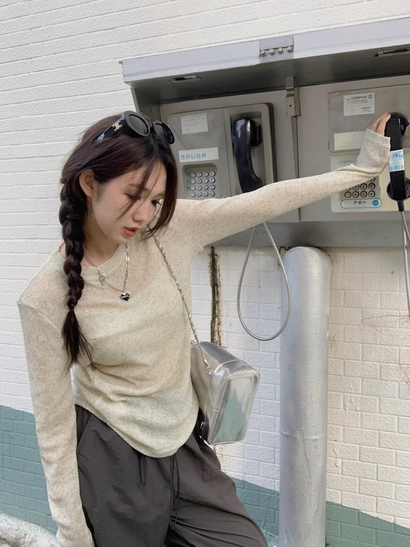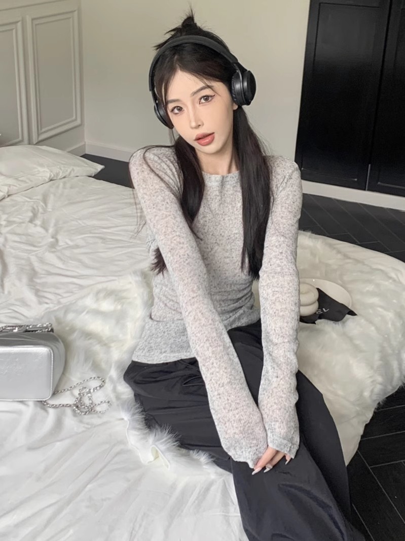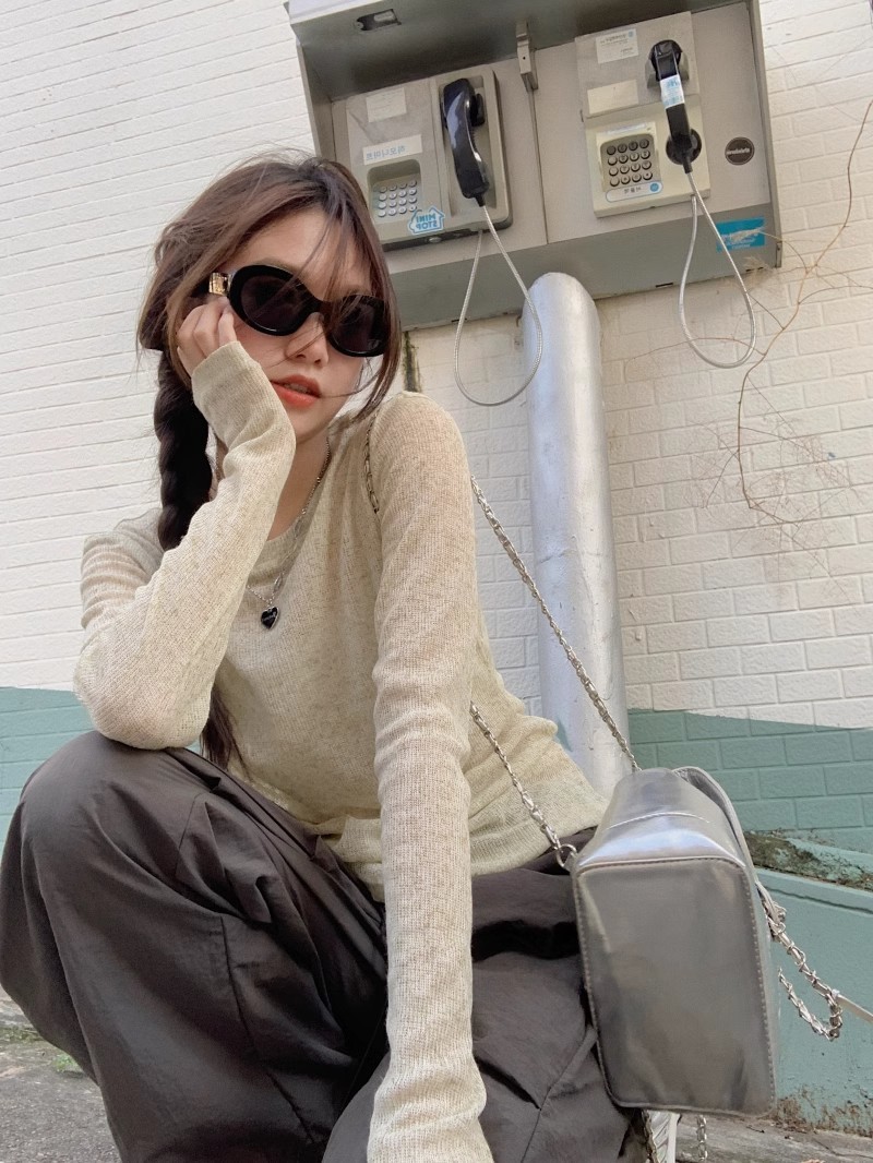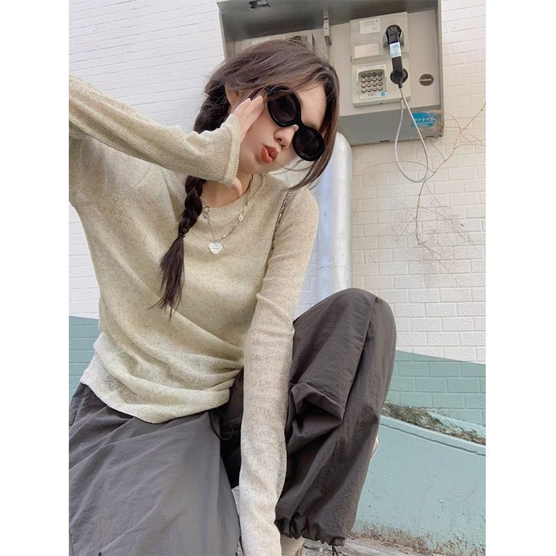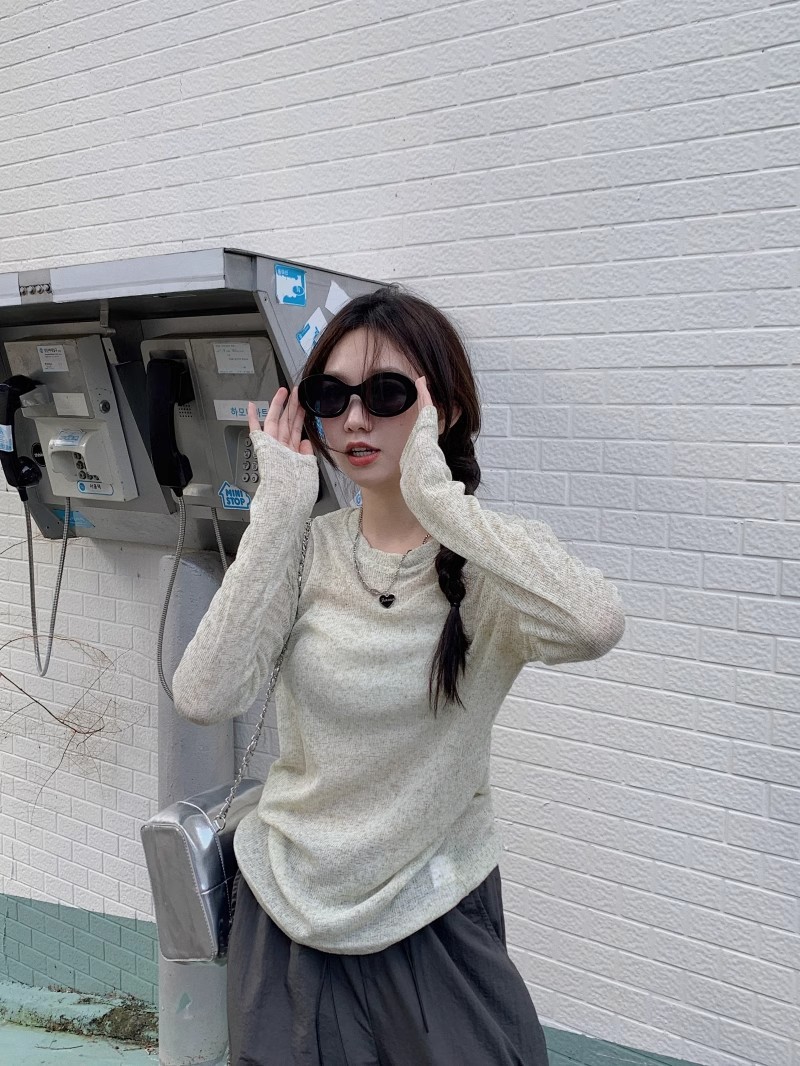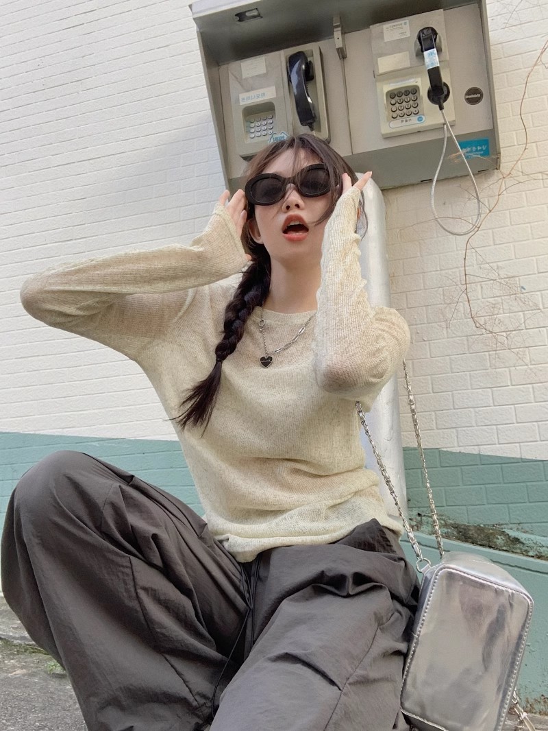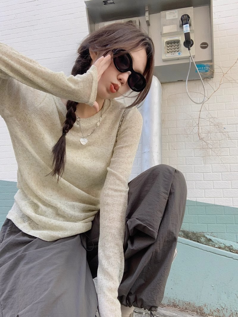 여성 여름 새로운 한국 스타일 라운드 넥 선 스크린 블라우스 슬림 핏 아름다운 탑