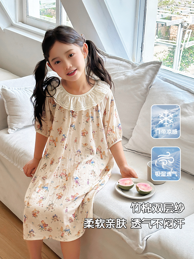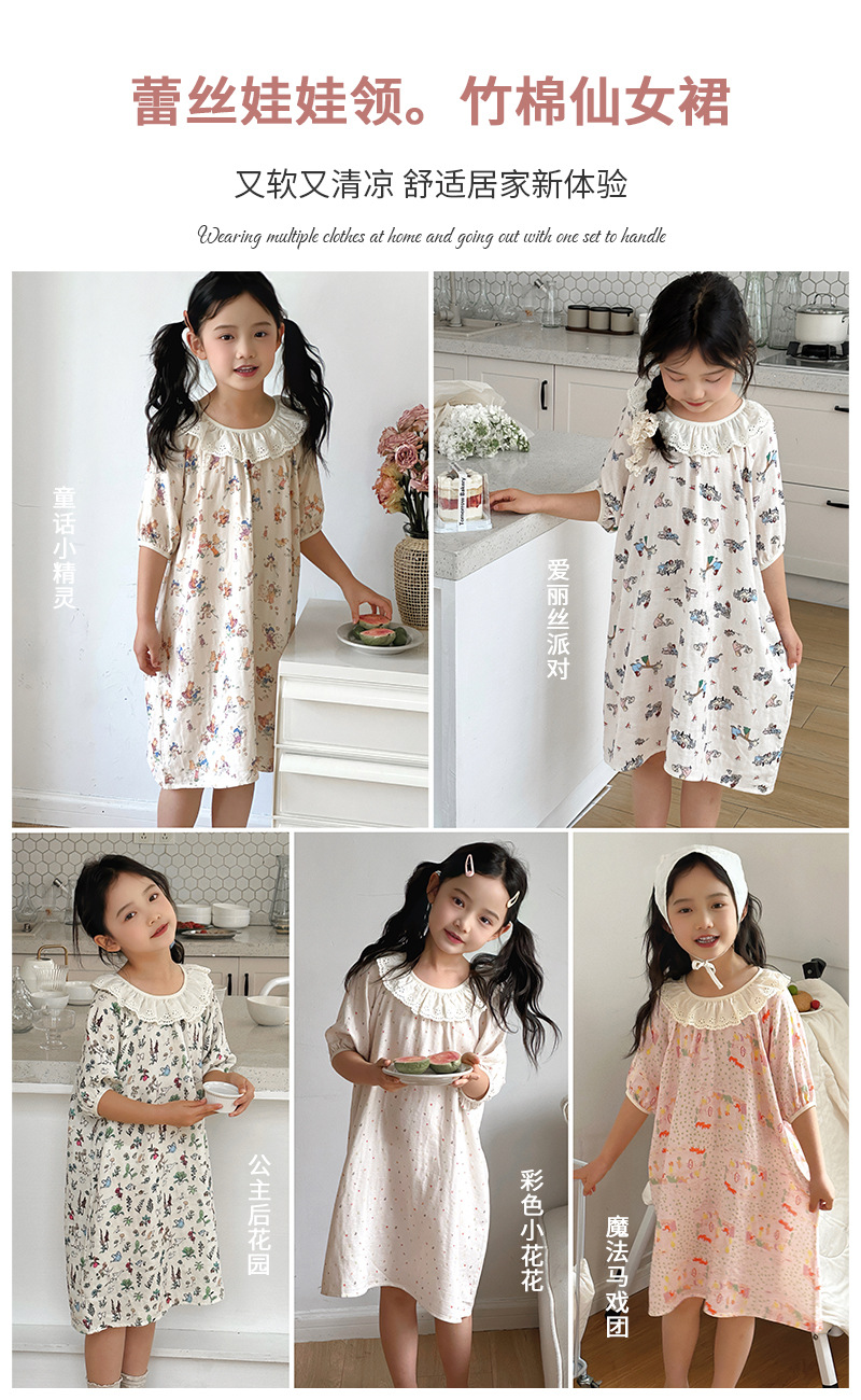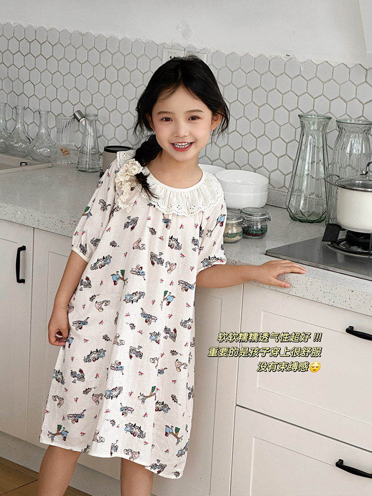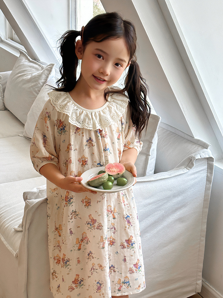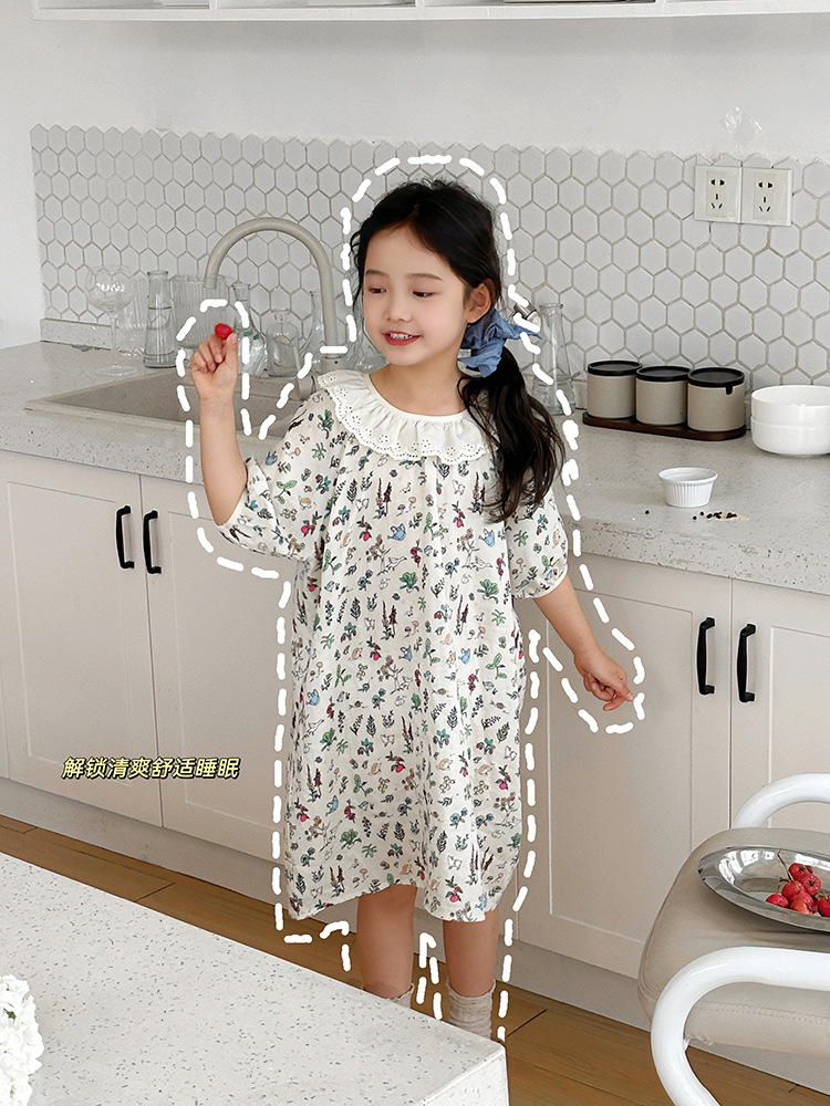 여름용 대나무 면 거즈 잠옷 얇은 아동용 홈웨어 여아 레이스 인형 칼라 원피스 흡습 발한스토어 가기