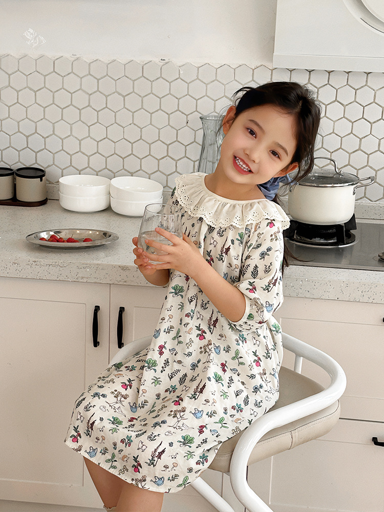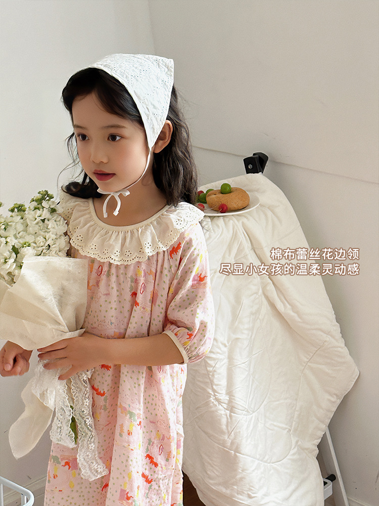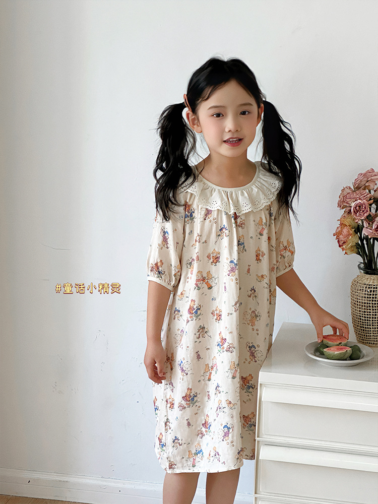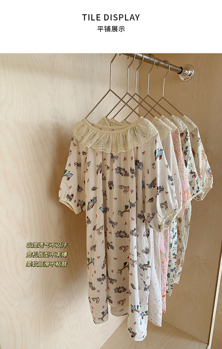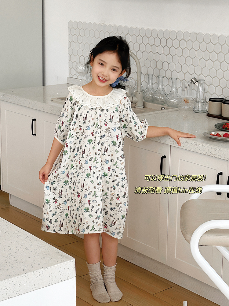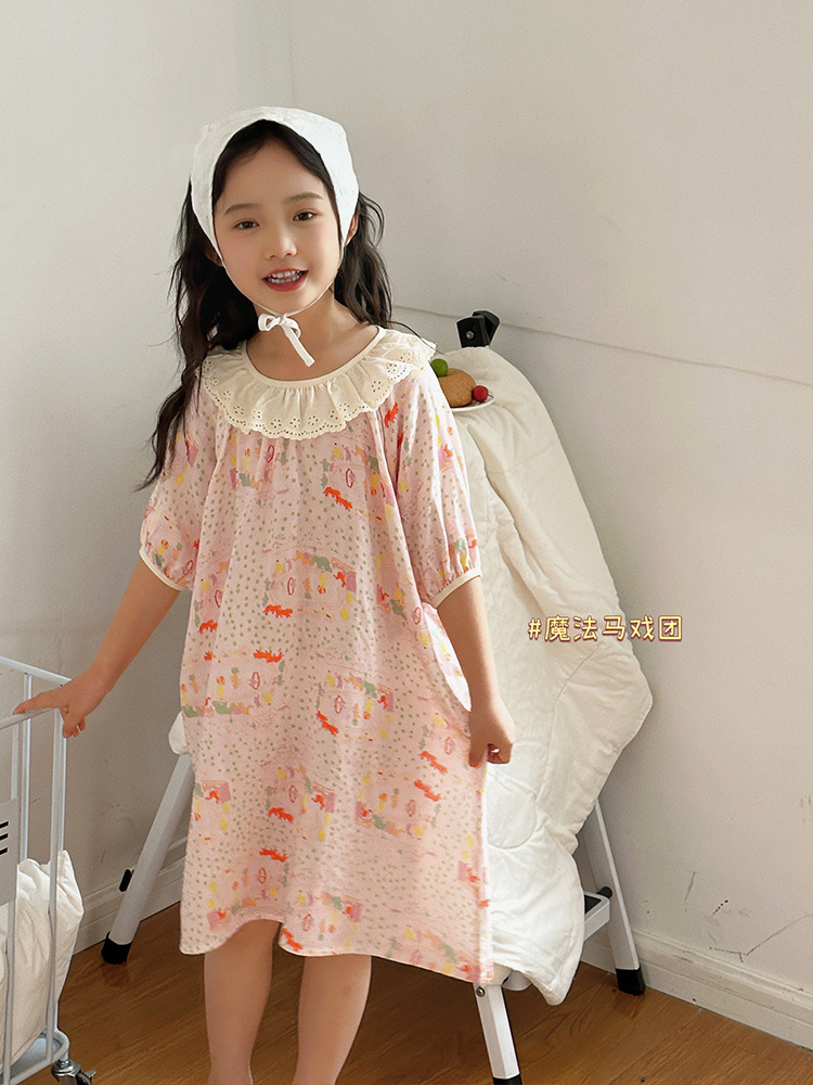 여름용 대나무 면 거즈 잠옷 얇은 아동용 홈웨어 여아 레이스 인형 칼라 원피스 흡습 발한스토어 가기