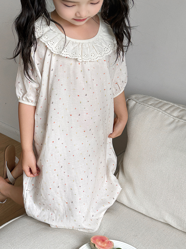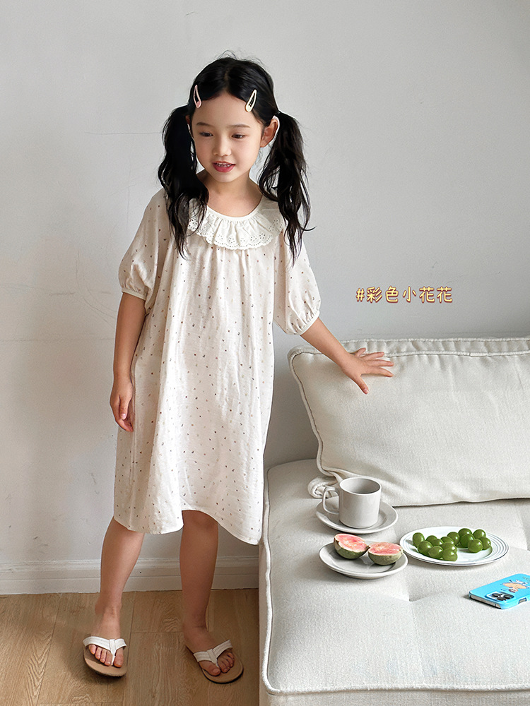 여름용 대나무 면 거즈 잠옷 얇은 아동용 홈웨어 여아 레이스 인형 칼라 원피스 흡습 발한