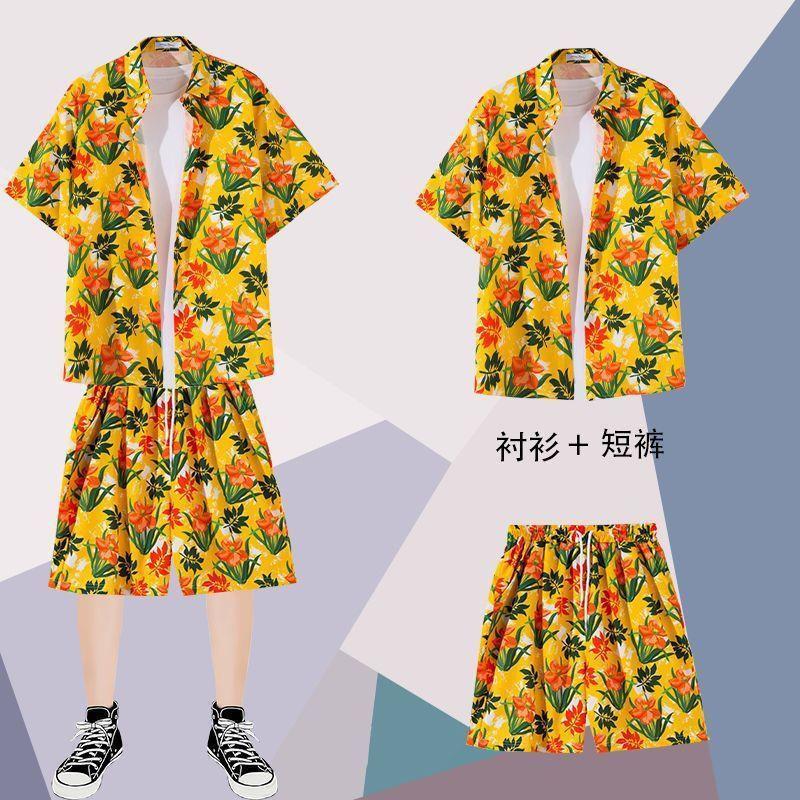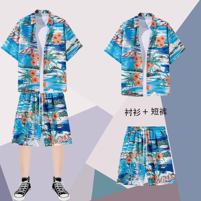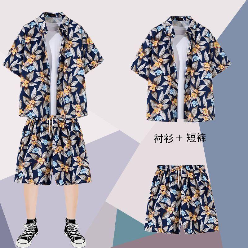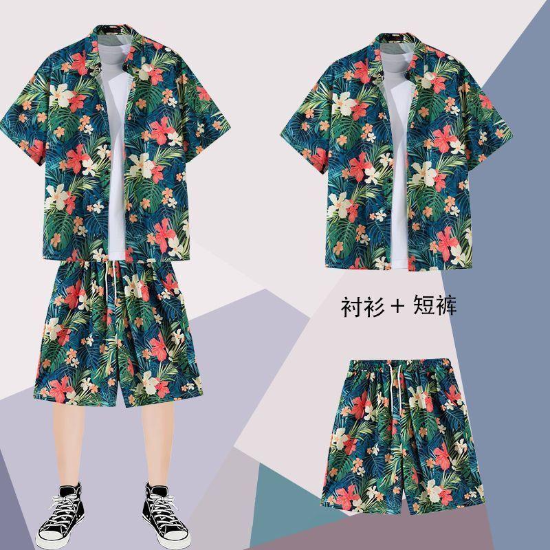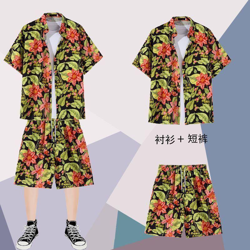 하와이안 셔츠 반바지 남성 정장 홍콩 스타일 여름 홍콩 스타일 해변 휴가 해변 반팔 꽃무늬 셔츠 투피스 세트
