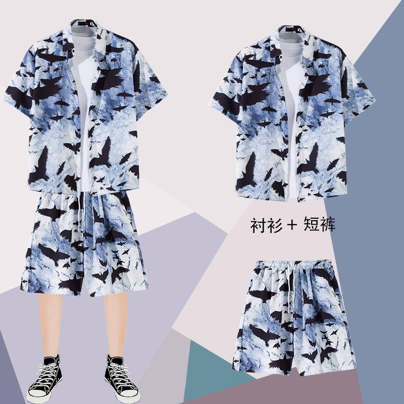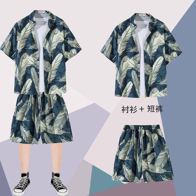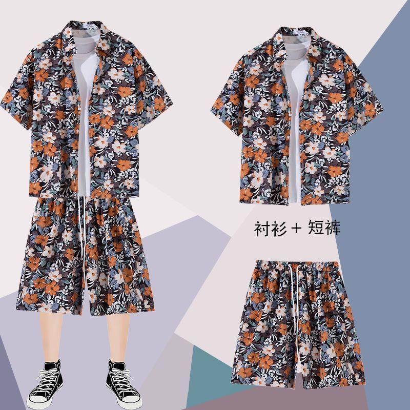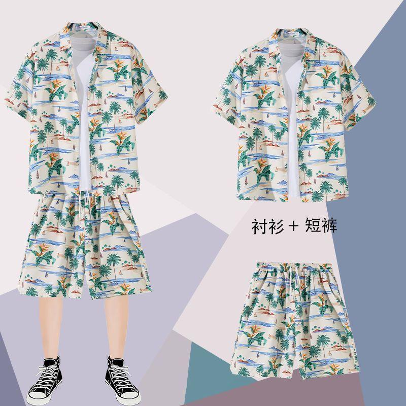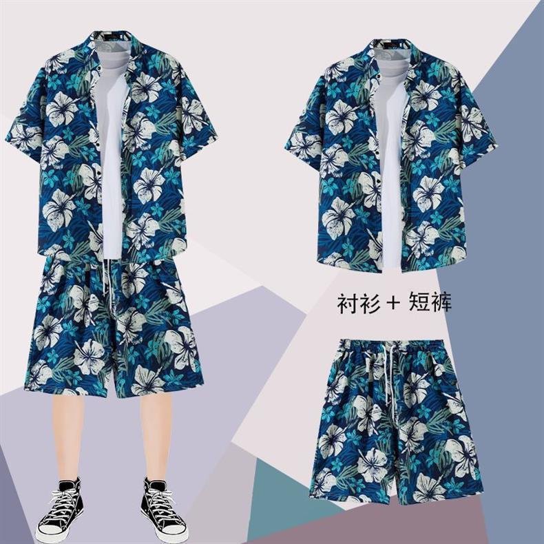 하와이안 셔츠 반바지 남성 정장 홍콩 스타일 여름 홍콩 스타일 해변 휴가 해변 반팔 꽃무늬 셔츠 투피스 세트