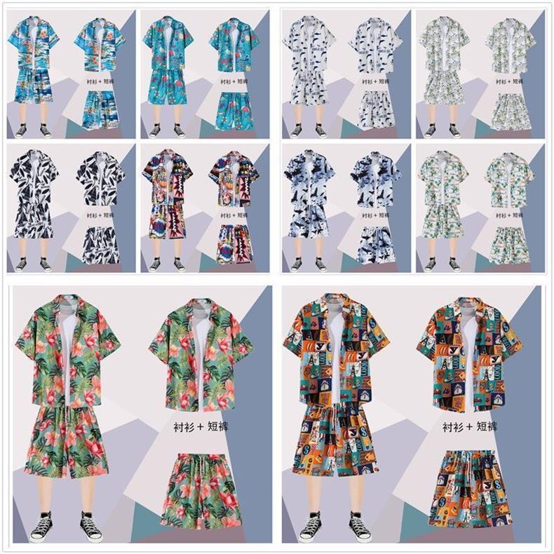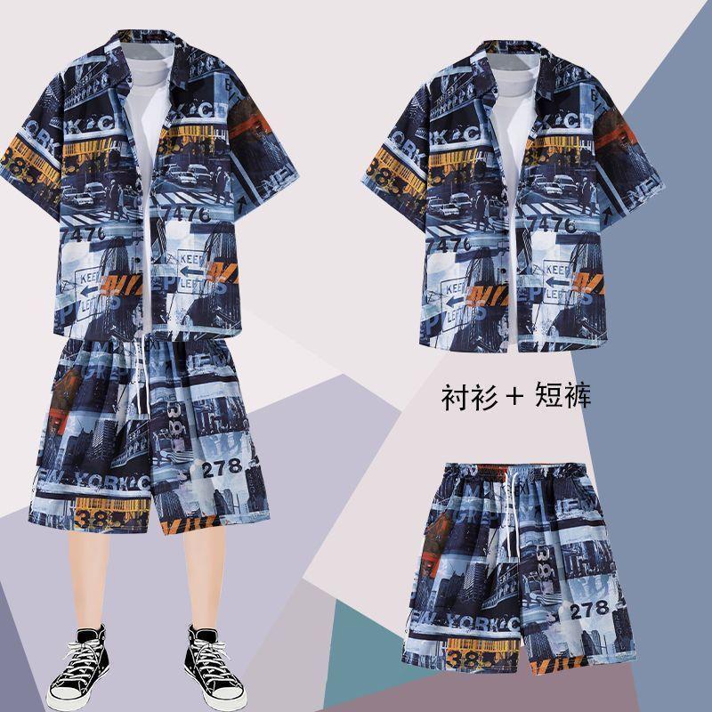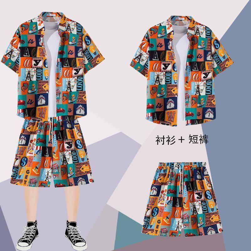 하와이안 셔츠 반바지 남성 정장 홍콩 스타일 여름 홍콩 스타일 해변 휴가 해변 반팔 꽃무늬 셔츠 투피스 세트스토어 가기