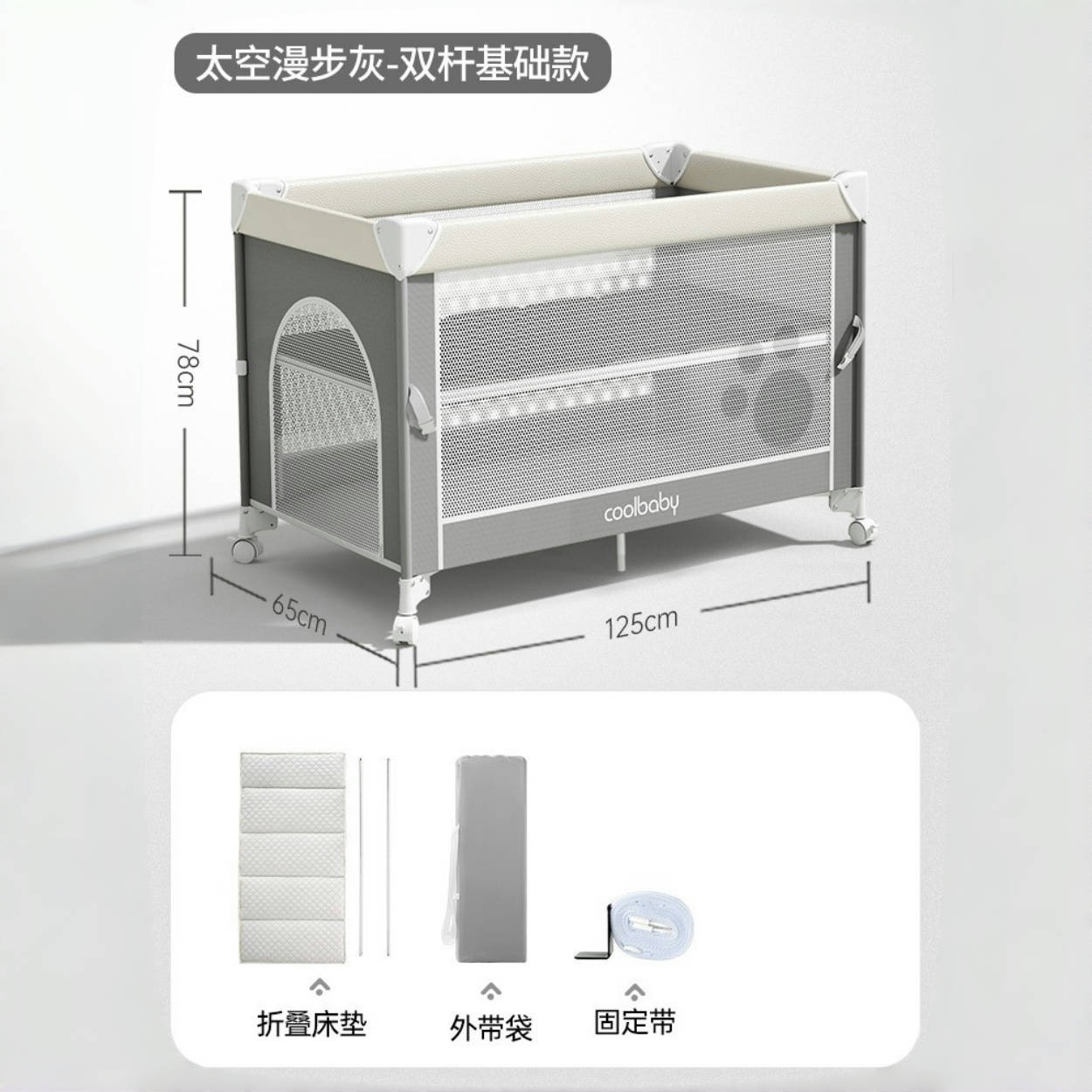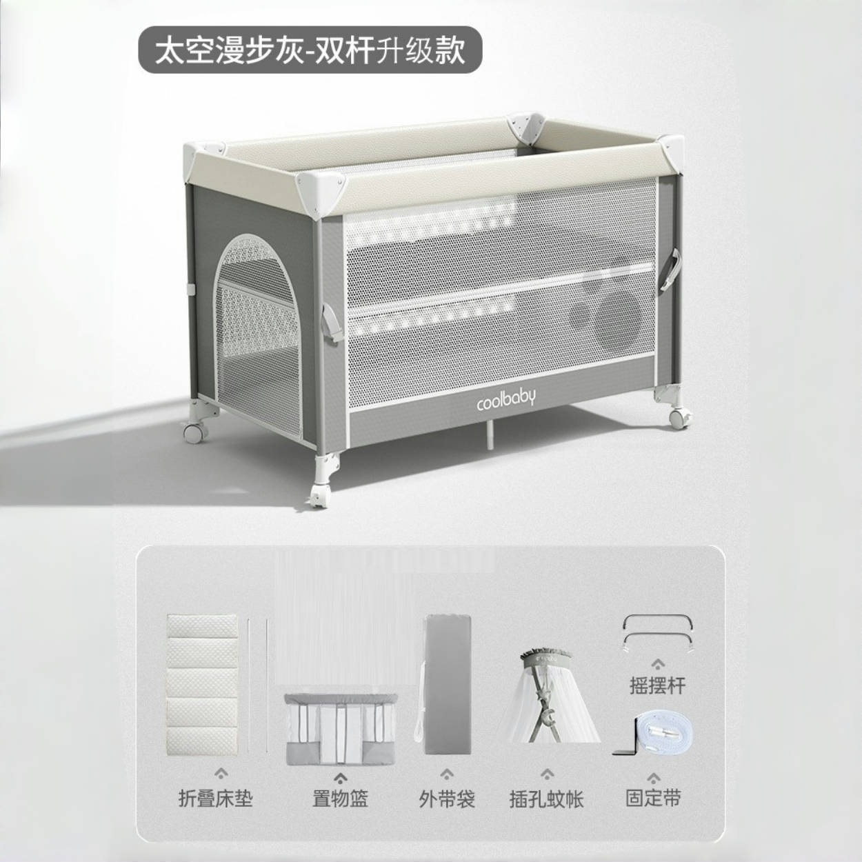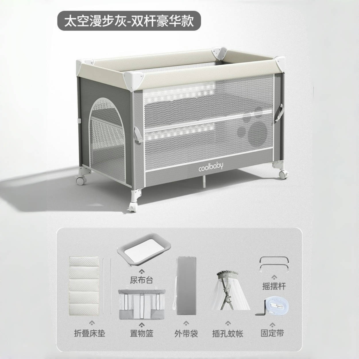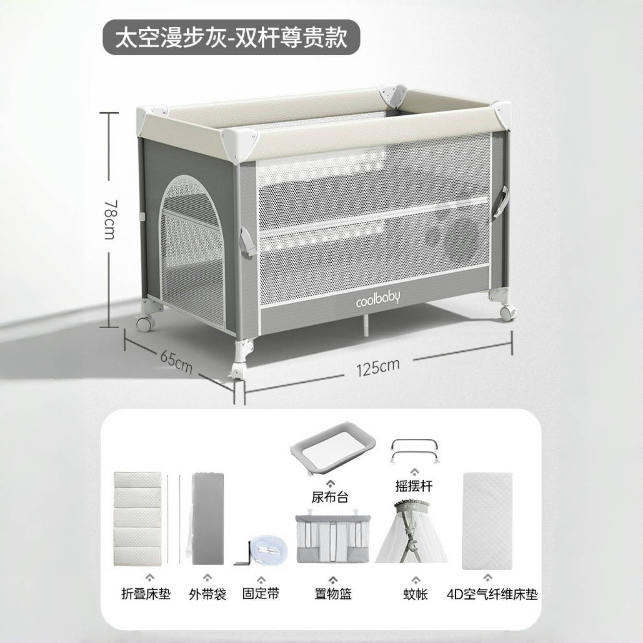 • 스페이스워크 그레이 [프리미엄 모델] 침대 + 접이식 매트리스 + 모기장 + 수납바구니 + 로커 + 기저귀교환대 + 4D 매트리스