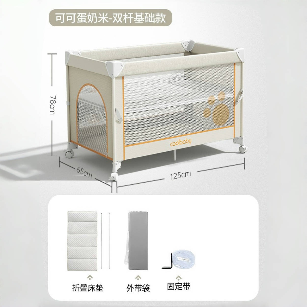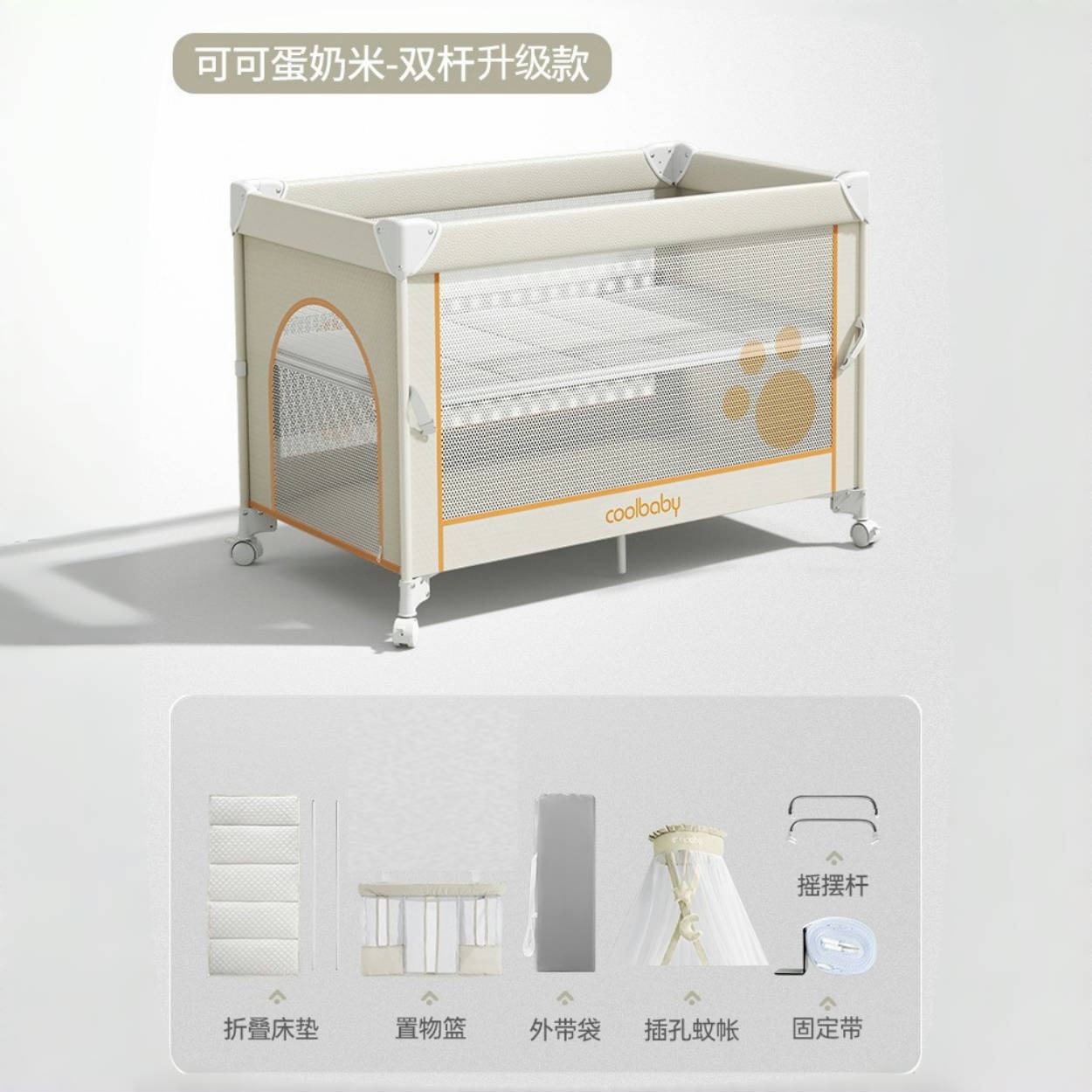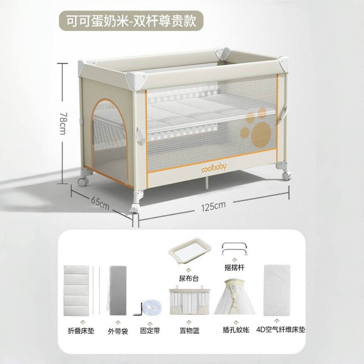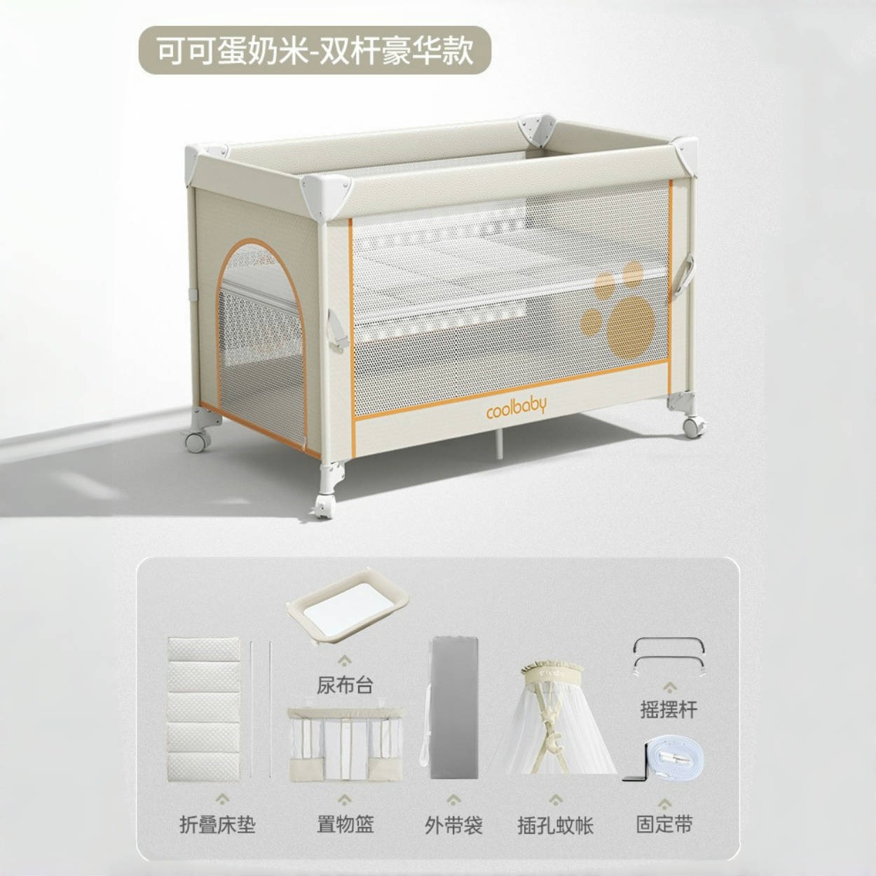 • 코코아 커스터드 라이스 [프리미엄 모델] 침대 + 접이식 매트리스 + 모기장 + 수납바구니 + 로커 + 기저귀교환대 + 4D 매트리스