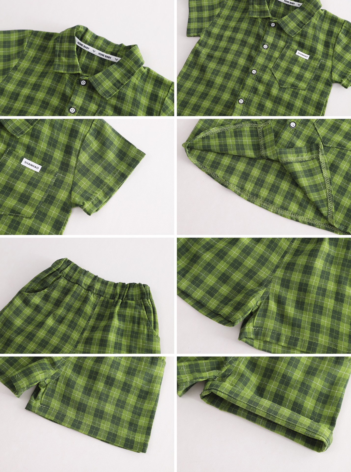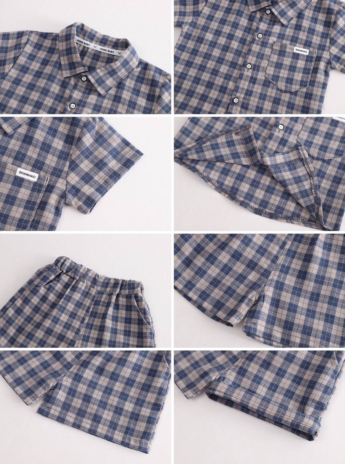 무료 배송 Yikids 여름 격자 무늬 코튼 셔츠 반팔 세트 소년과 아기를위한 투피스 캐주얼 반바지