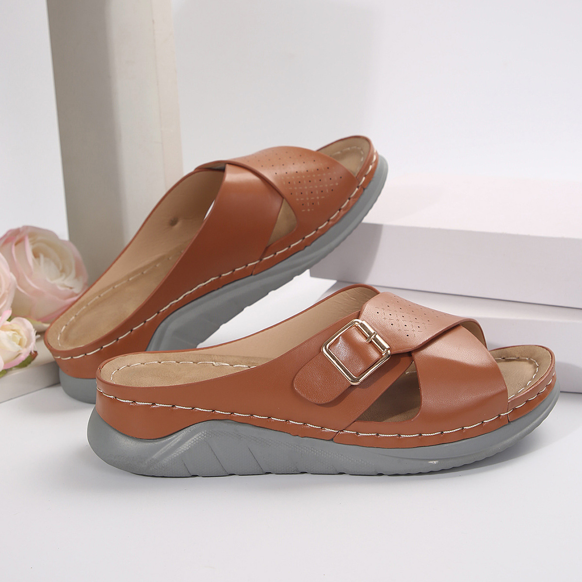 2024 년 새로운 여름 대외 무역 여성 슬리퍼 국경 간 플러스 사이즈 두꺼운 밑창 캐주얼 크로스 스트랩 슬리퍼 여름 비치 슈즈