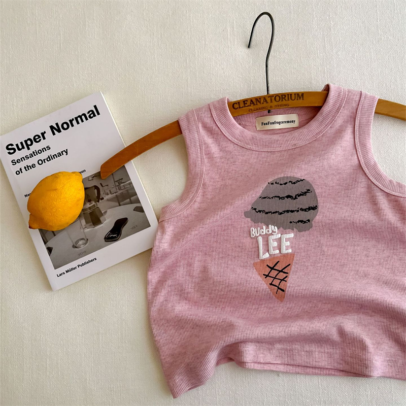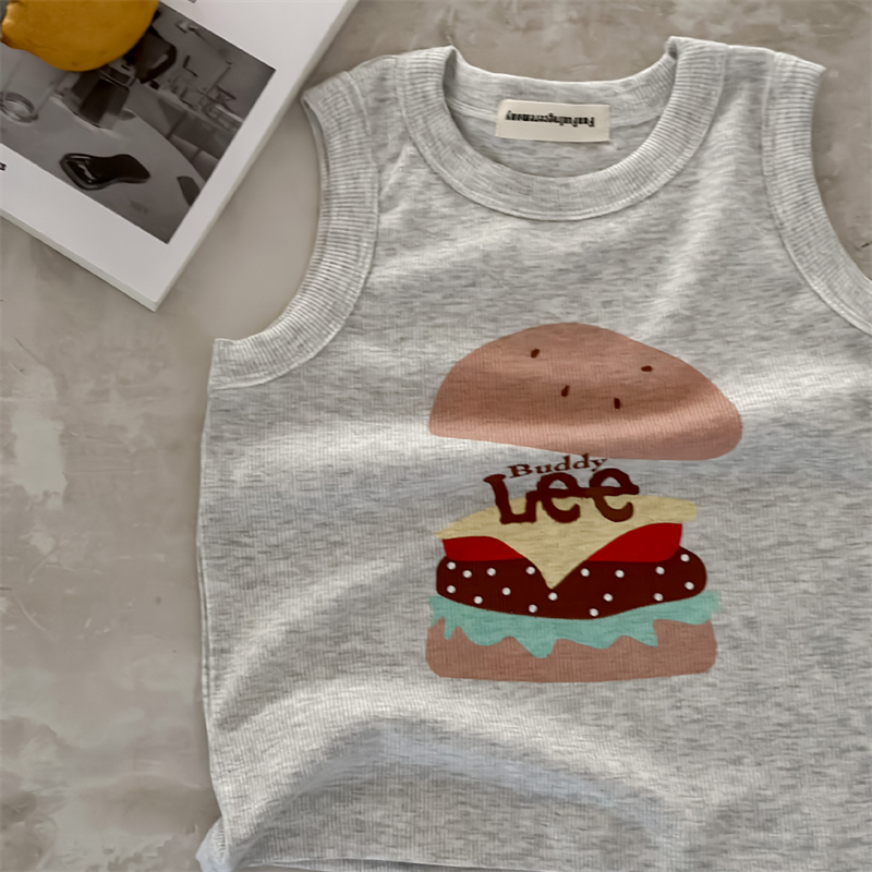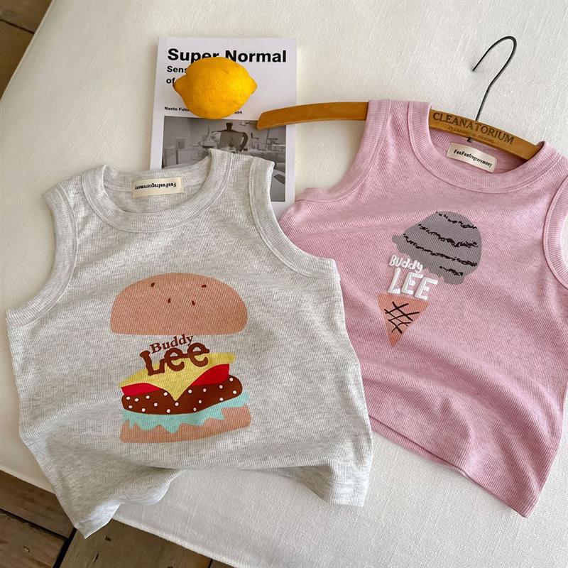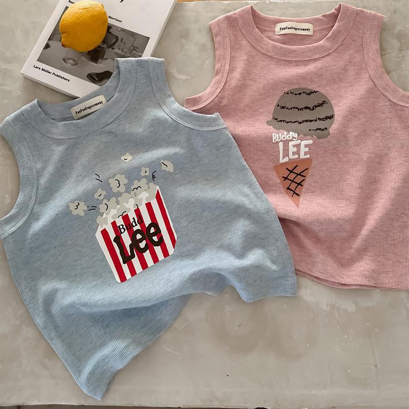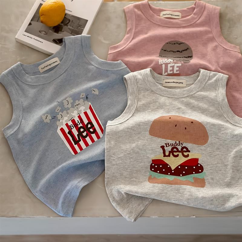 어린이 조끼 2024 여름 새로운 소년과 소녀 만화 민소매 T 아기 일본 구덩이 스트립 탄성 티셔츠스토어 가기