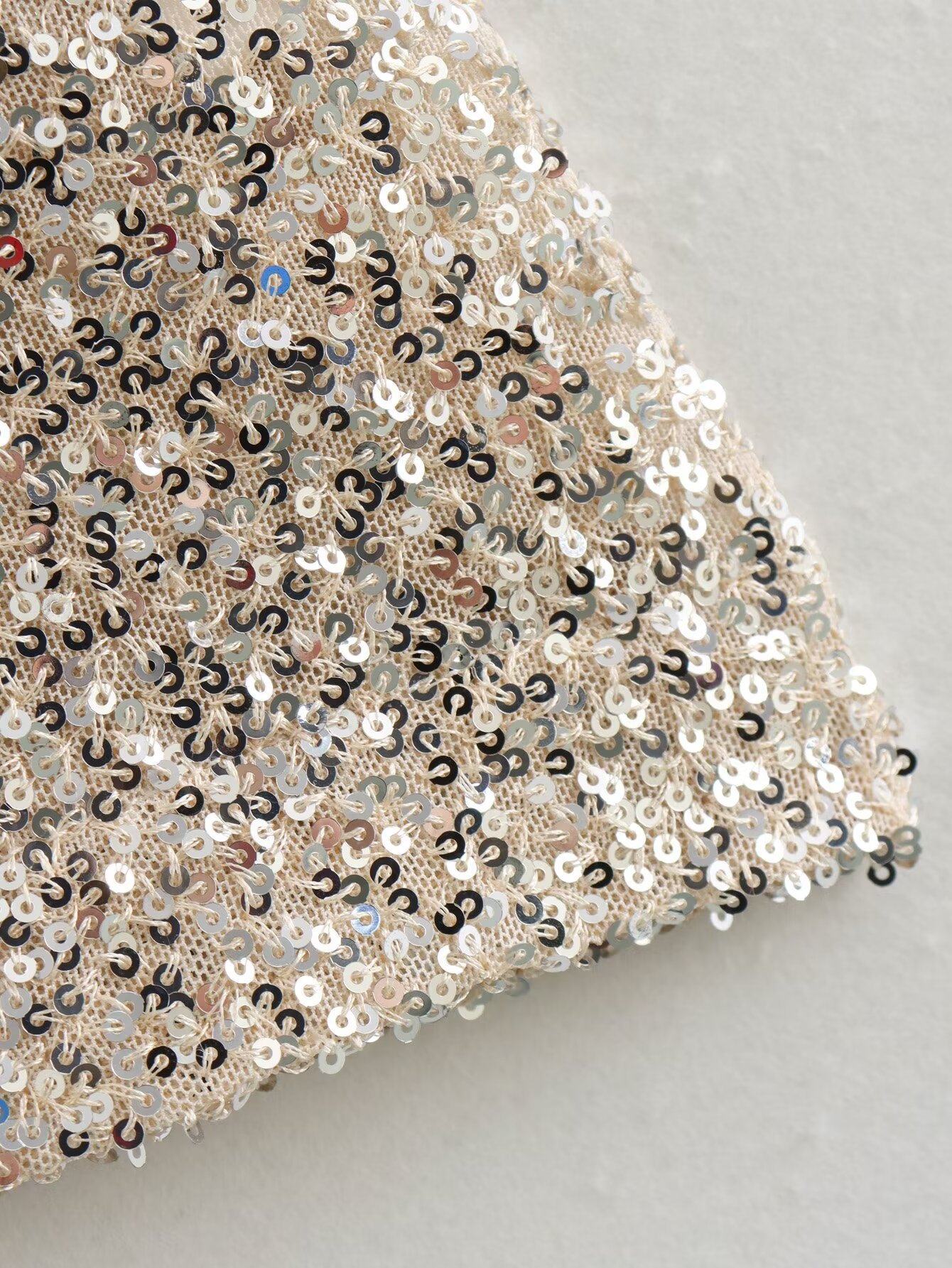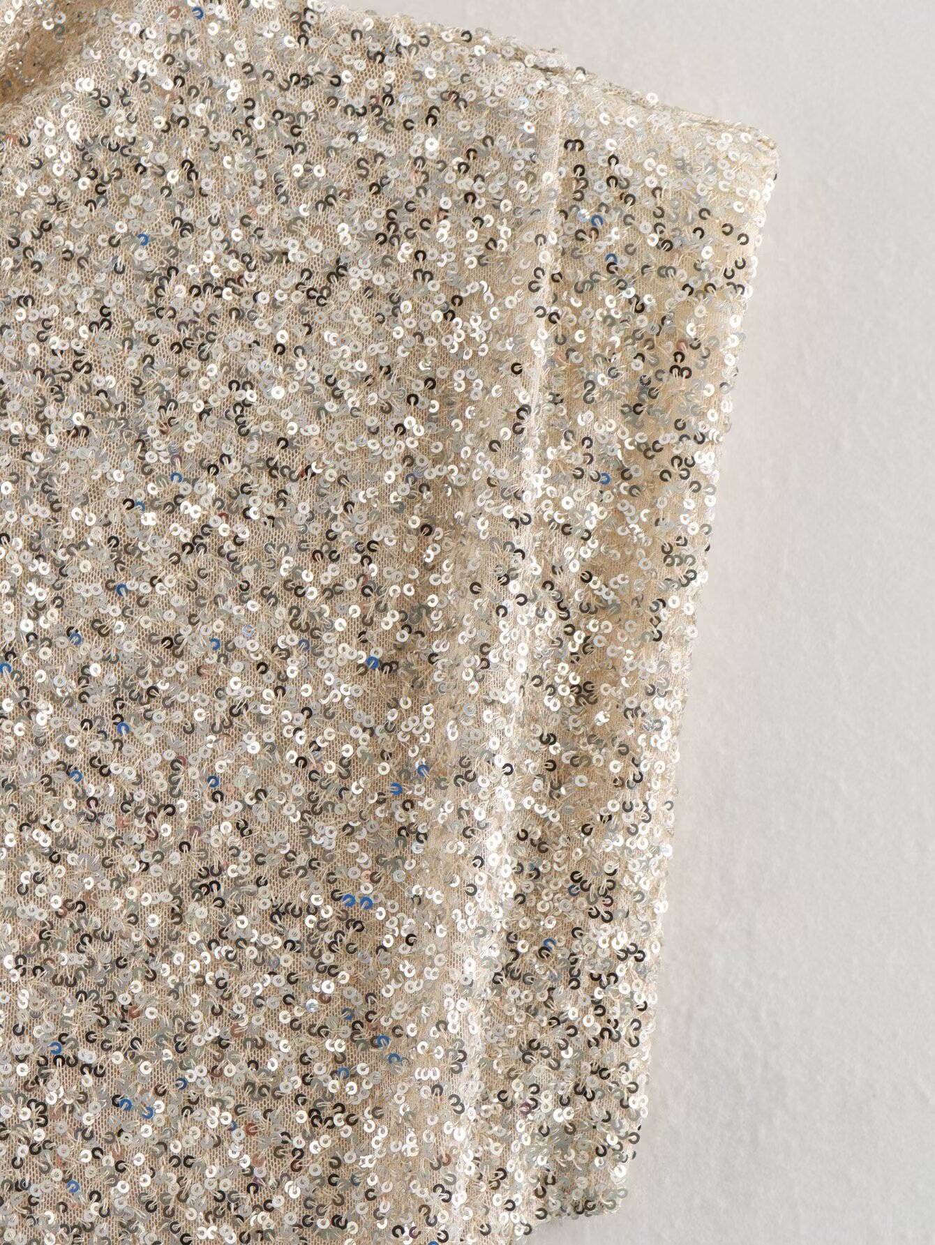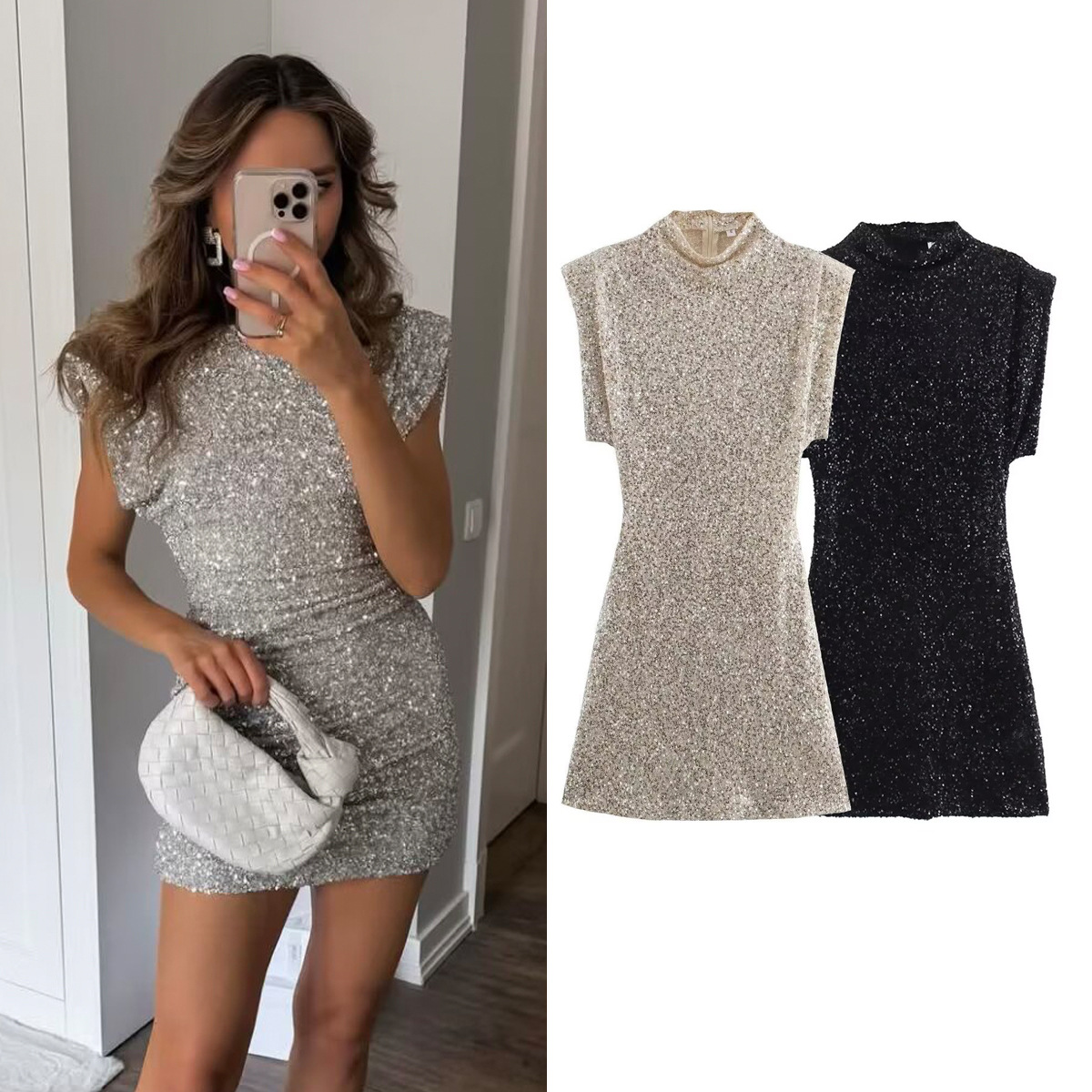 2024 년 새로운 유럽과 미국의 대외 무역 여름 여성 크루 넥 세퀸 슬림 핏 어깨 패드 디자인 엉덩이 치마 원피스 여성 B8