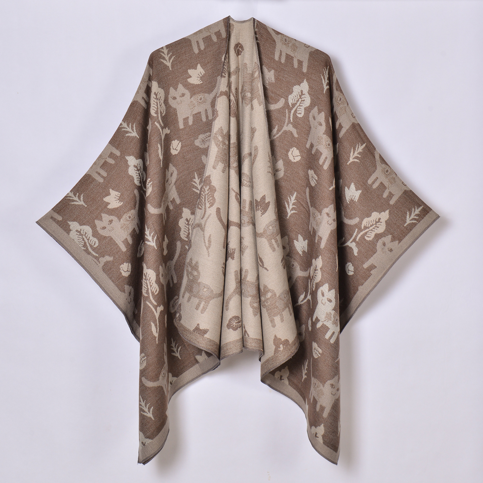 产品属性:披肩经过抓绒处理,表面会有少许浮毛,多清洗几次即可,为避免起静电尽量不要配合毛线衣穿搭,