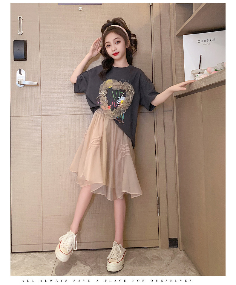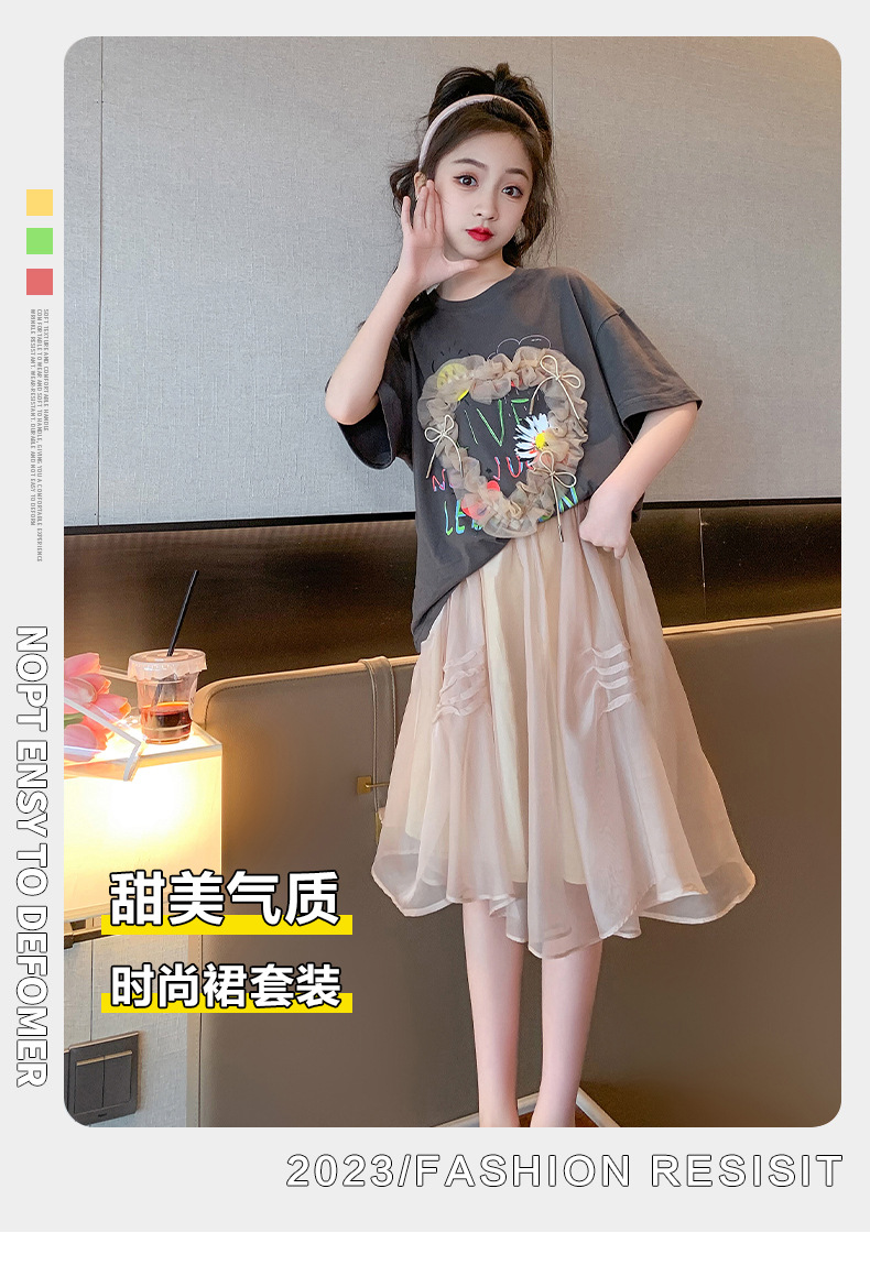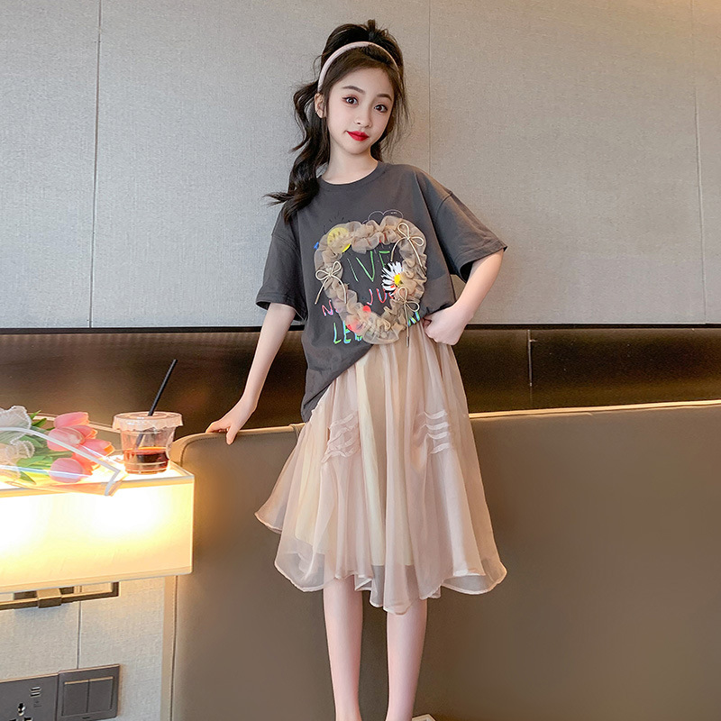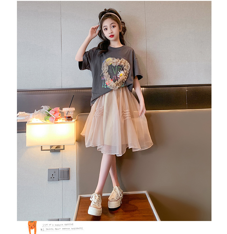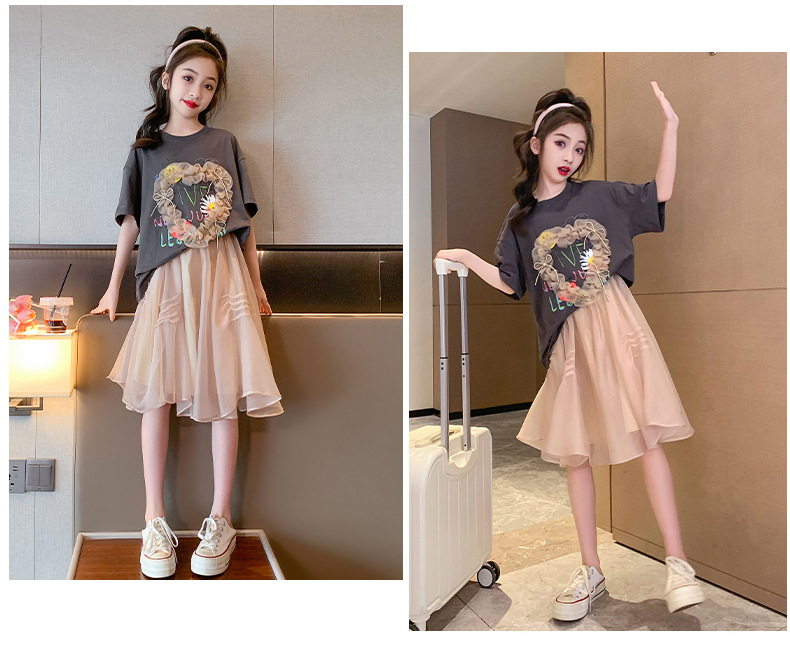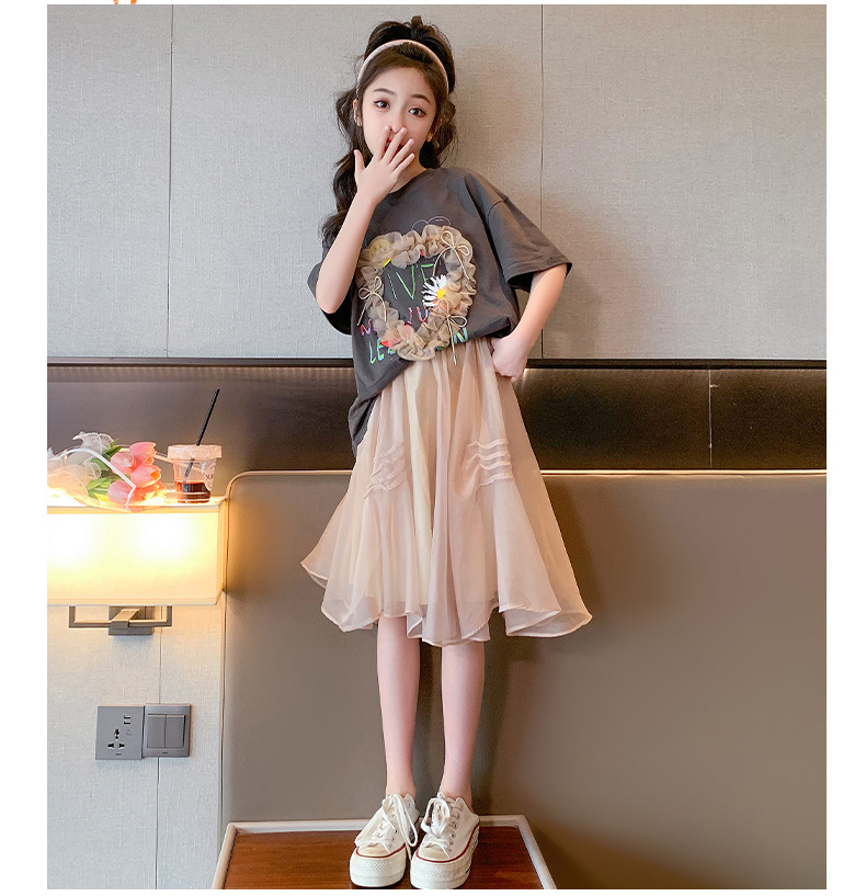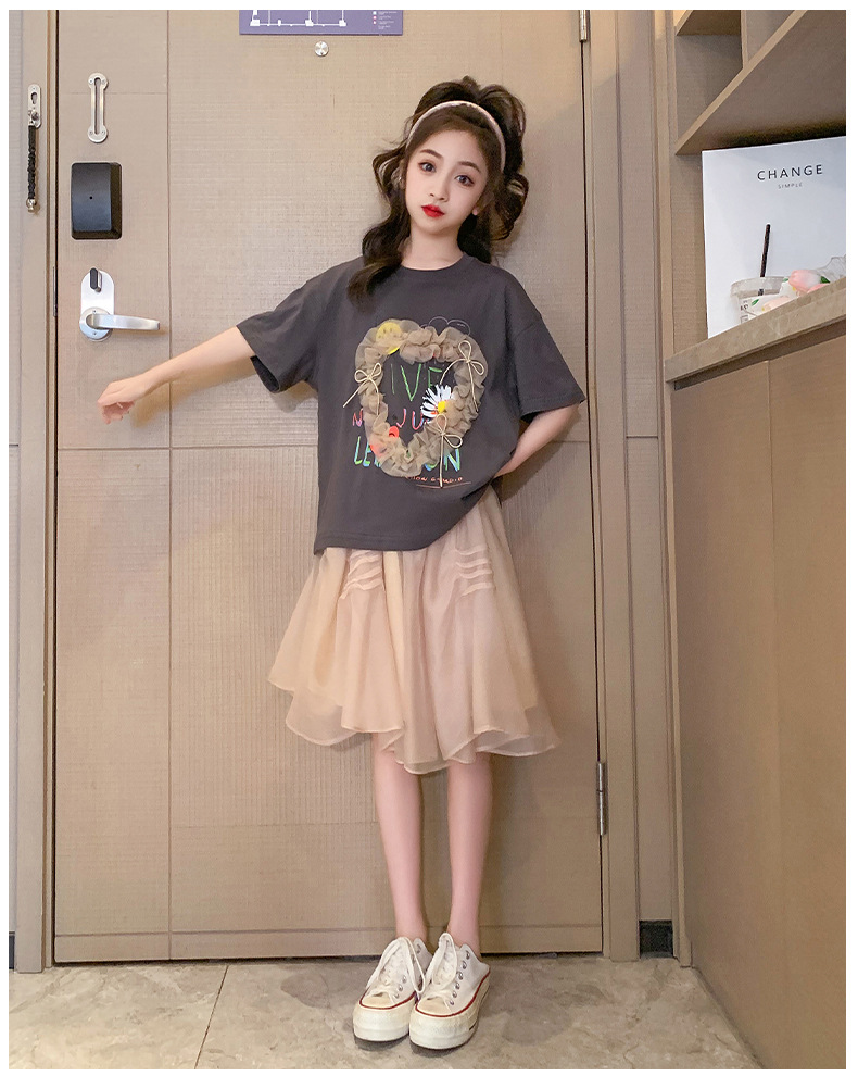 새끼 어린이 여성 세트 여름 새로운 2024 패션 사랑 자수 짧은 소매 상단 절반 거즈 스커트 투피스 대외 무역
