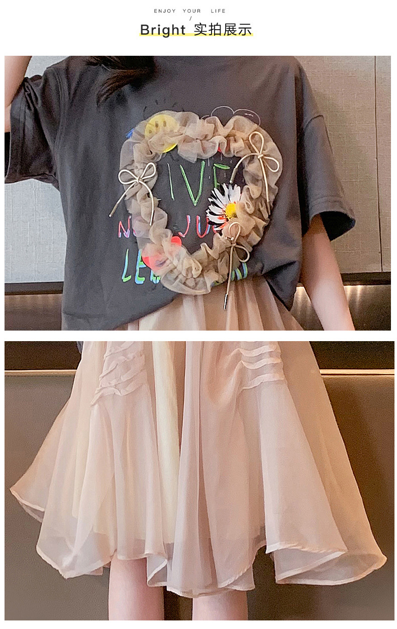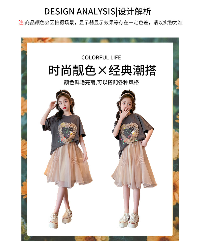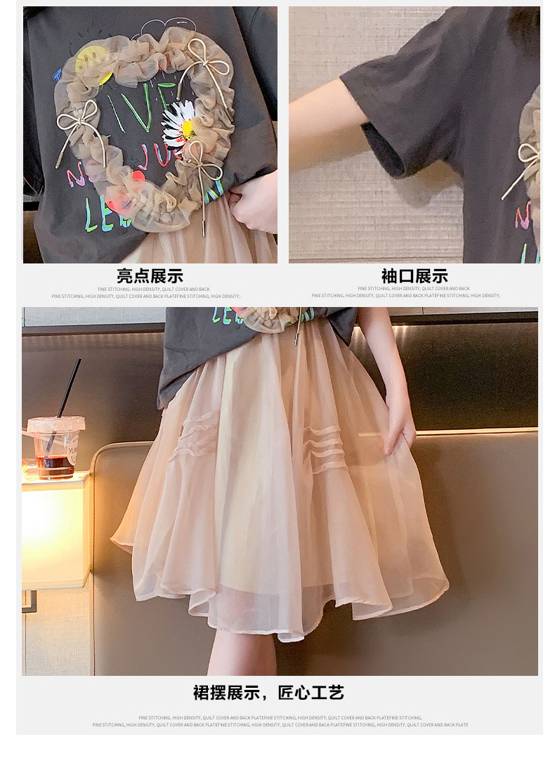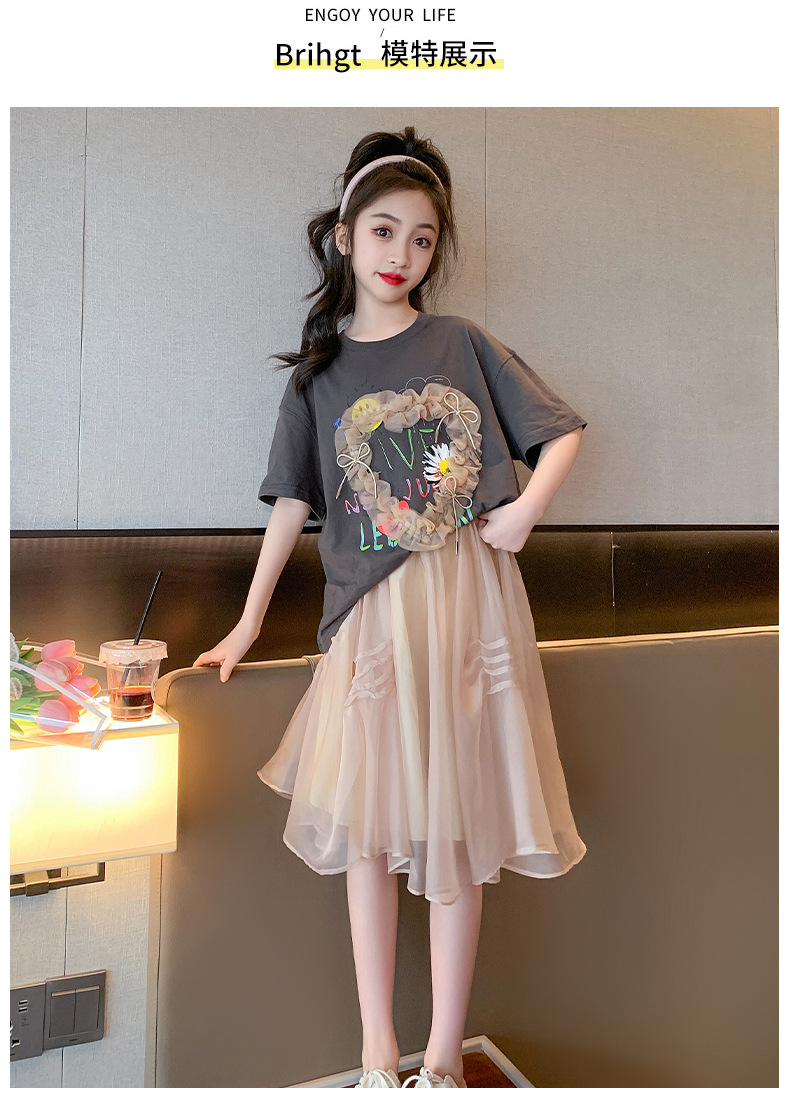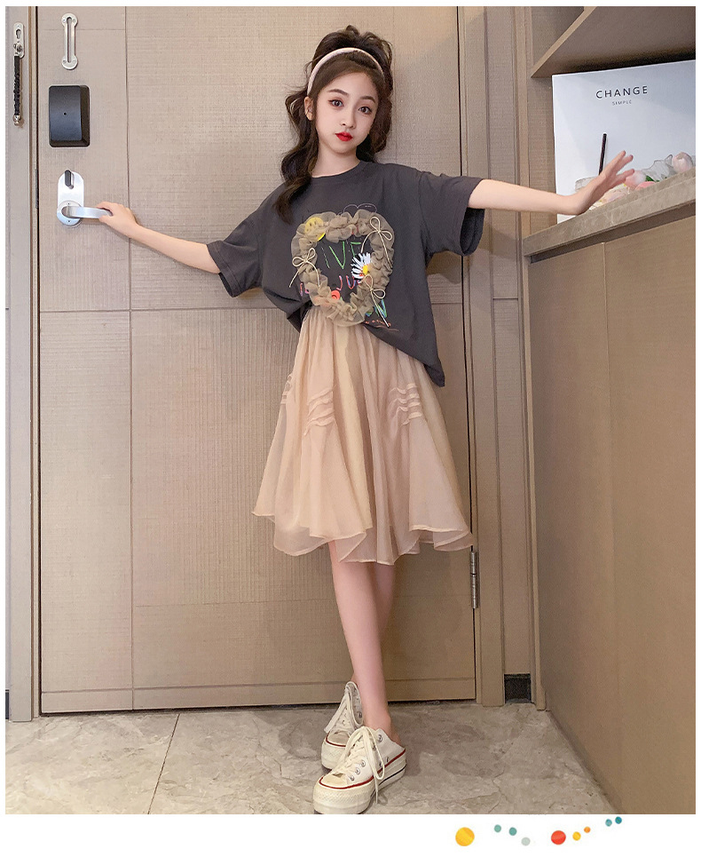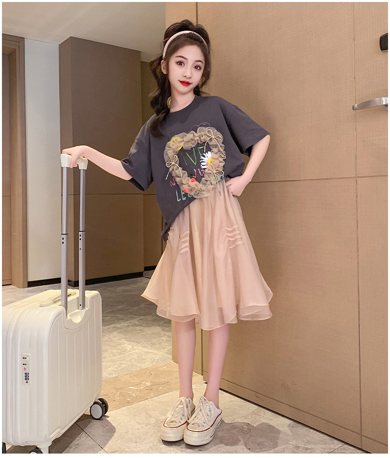 새끼 어린이 여성 세트 여름 새로운 2024 패션 사랑 자수 짧은 소매 상단 절반 거즈 스커트 투피스 대외 무역